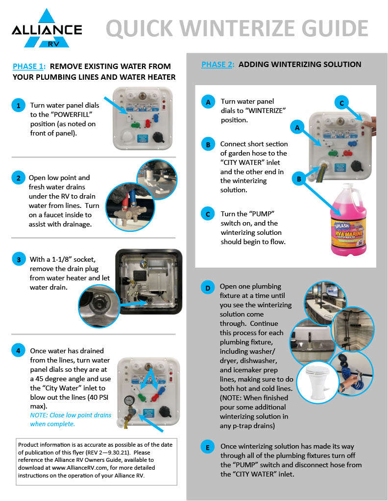 The attached file provides step-by-step instructions for draining your water lines and winterizing your Alliance RV.
