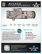 The Avenue 28BH is the perfect family fifth wheel, featuring bunk beds with accessible storage, a spacious living area, and a side-aisle bath with a 30" x 36" shower. The kitchen includes a 10 cu. ft. 12V refrigerator and pantry, with extra seating and a swing mount 40" HDTV for entertainment. The private front bedroom offers a queen bed and wardrobe for your convenience.