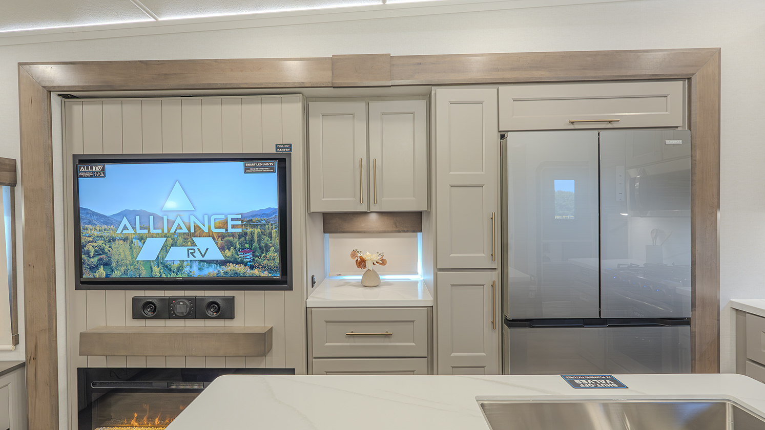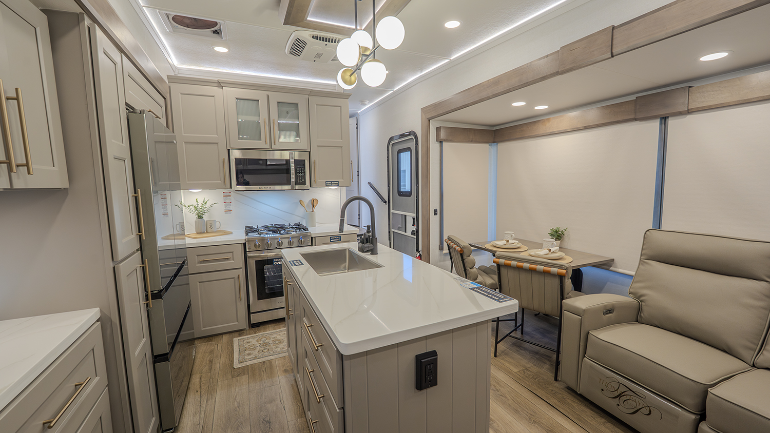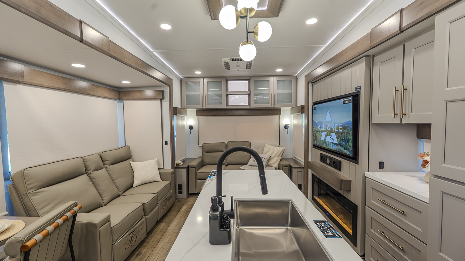 The Alliance RV Paradigm 295MK fifth wheel is designed for those who appreciate luxury, comfort, and convenience, all while embracing the great outdoors. The standout feature of this model is its middle kitchen, an ideal setup for the cook in the family. Equipped with an Insignia range featuring a 12,000 BTU burner, a 3.73 cu. ft. oven, and a residential microwave, this kitchen is as functional as it is stylish. The kitchen island with prep space and dishwasher prep option makes meal prep a breeze, so you can spend less time cooking and more time enjoying your adventure.