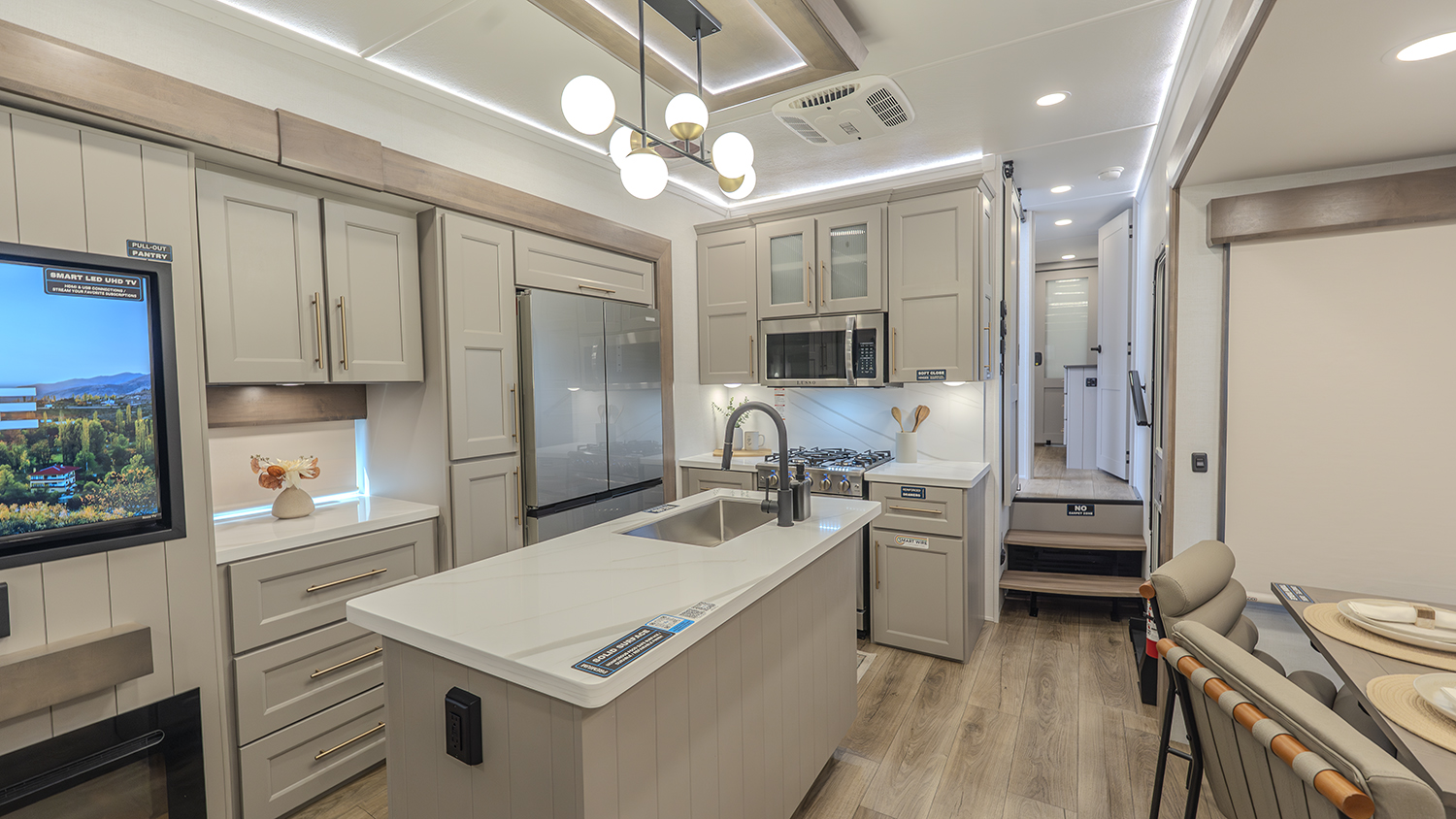 In the rear living area, you'll find a sleeper sofa next to the cozy fireplace, creating the perfect spot to relax after a long day. For added convenience, there's hidden pantry storage and a 50" Smart TV to enhance your entertainment options. The dual recliner love seat is perfect for unwinding, while the swivel table and desk offer a versatile space to work or dine.