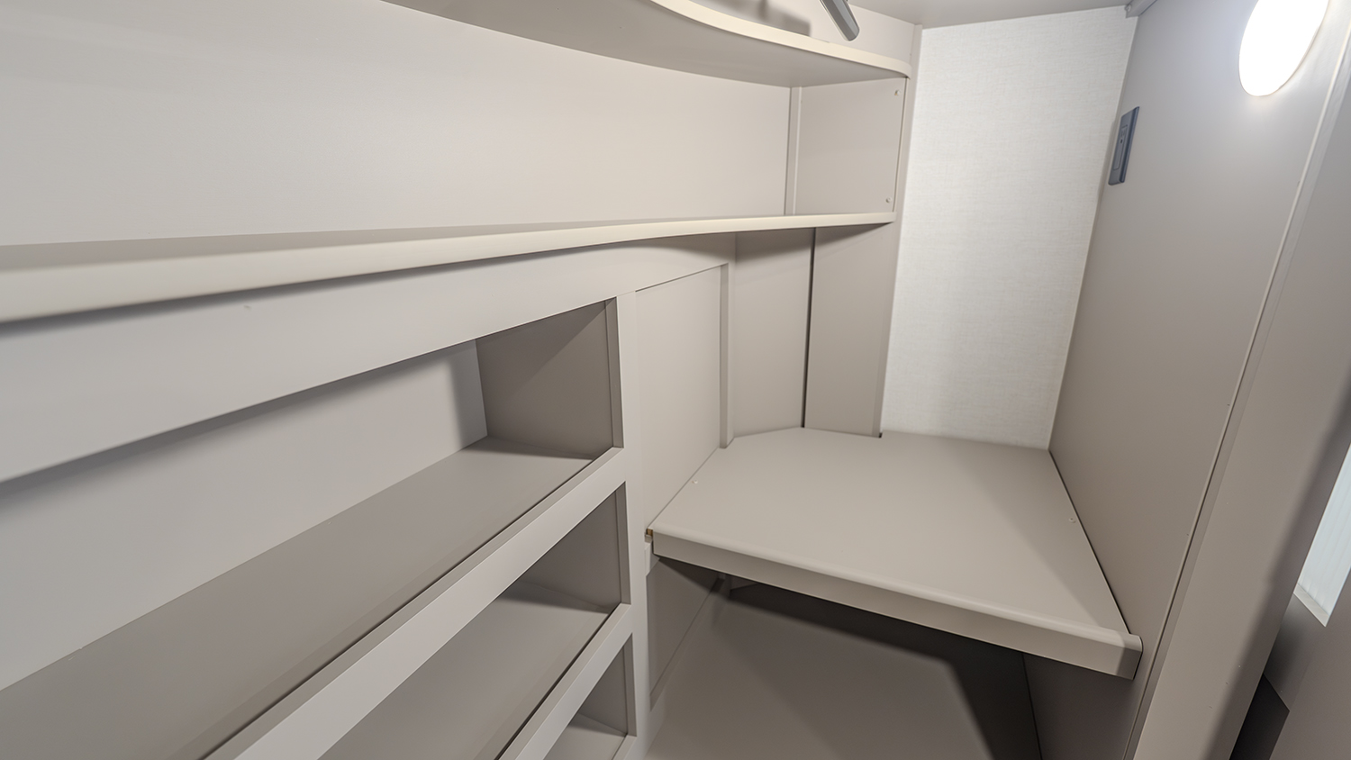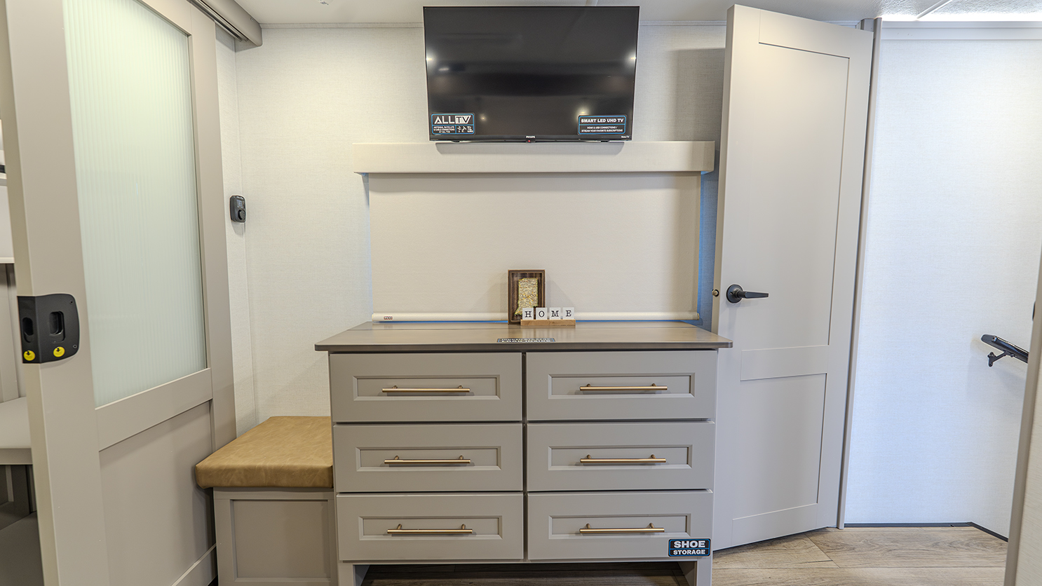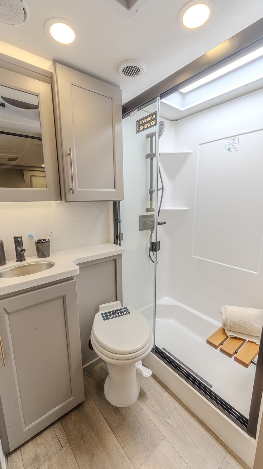 The front bedroom provides a peaceful retreat with a king bed slide (with a queen option available for more floor space). You'll also enjoy thoughtful touches like a flip-top dresser, a seat with storage, and a front wardrobe prepped for a washer and dryer. The dual-entry bathroom features a residential-style shower, a porcelain toilet with a soft-close seat, and additional high-end finishes that create a spa-like experience on the road.
