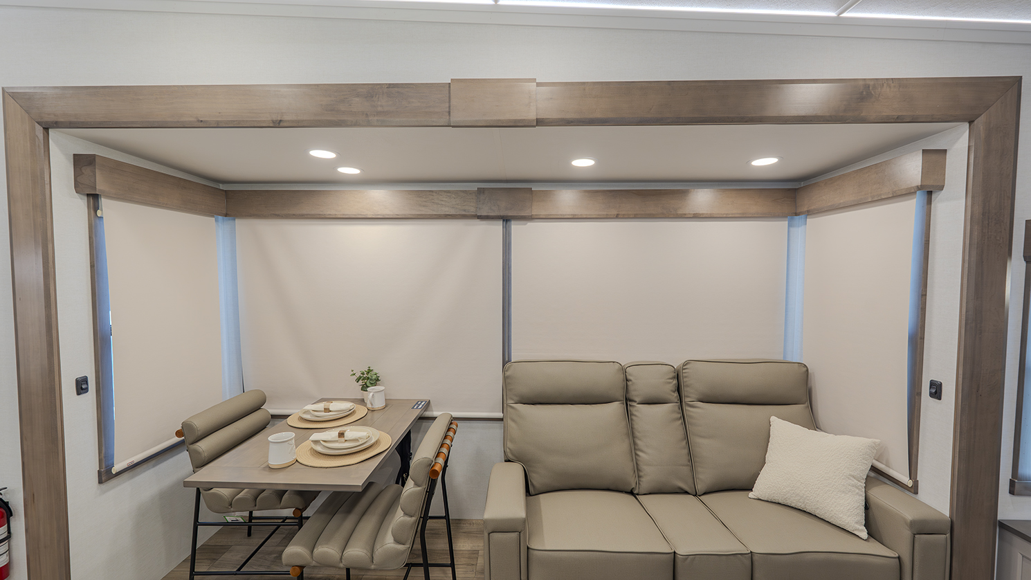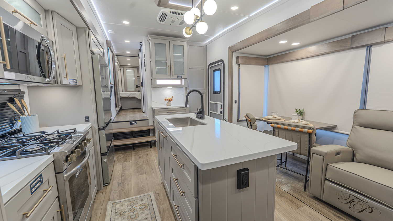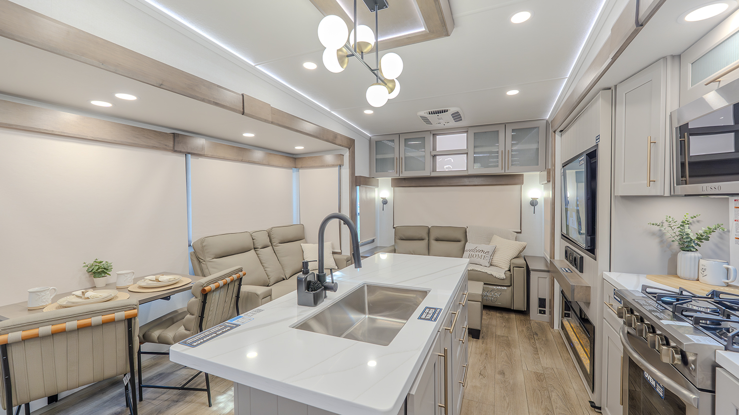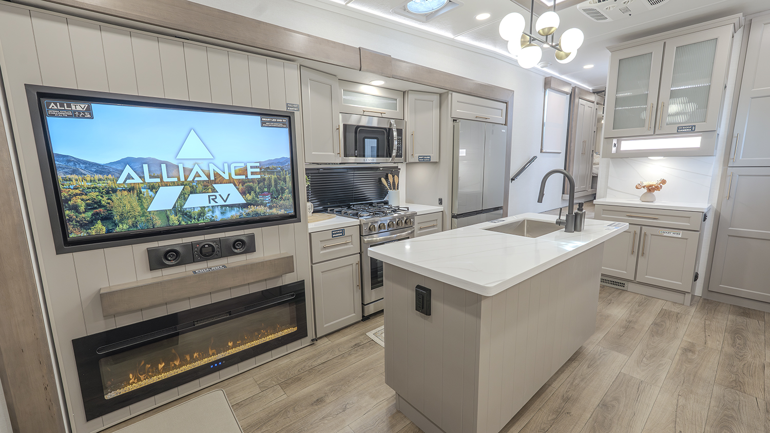 The Alliance RV Paradigm 340RL fifth wheel is designed to elevate your travel experience, whether you're visiting family and friends or exploring new destinations. This luxurious RV features a spacious rear living area with dual opposing slides, providing ample space for both comfort and entertainment. Relax on the dual recliner love seat, enjoy the warmth of the fireplace, or watch your favorite shows on the 50" Smart TV. Behind the TV, you’ll find hidden pantry storage, maximizing space while keeping your essentials within reach.