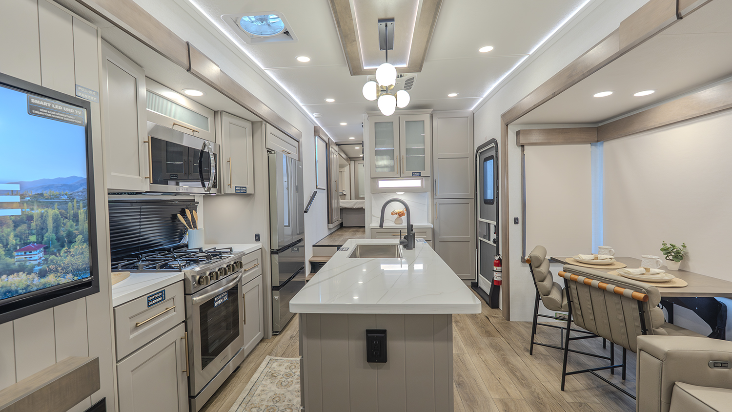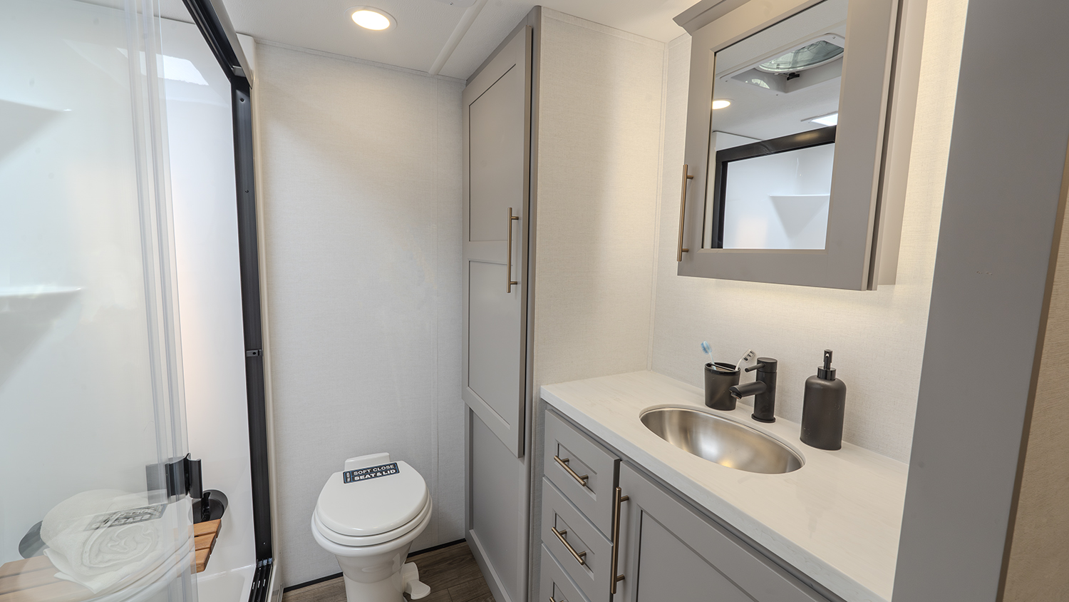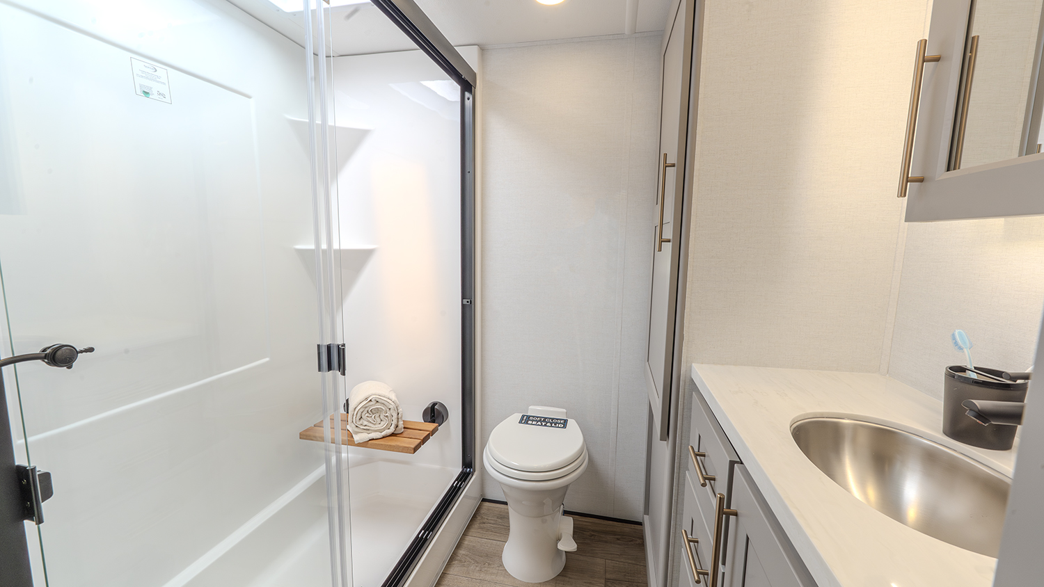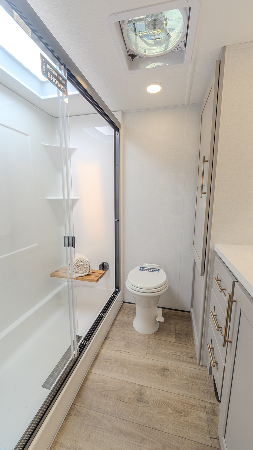 In the bedroom, you’ll enjoy a spacious retreat with a king bed and two bedroom seats for added comfort. The large bedroom closet offers generous hanging space, while the third slide-out in the hallway provides even more shelf storage, ensuring you have plenty of room for your belongings. The full bathroom includes a roomy 61" x 30" shower, offering the convenience of home even on the road.