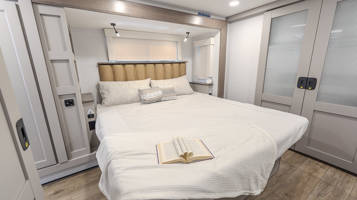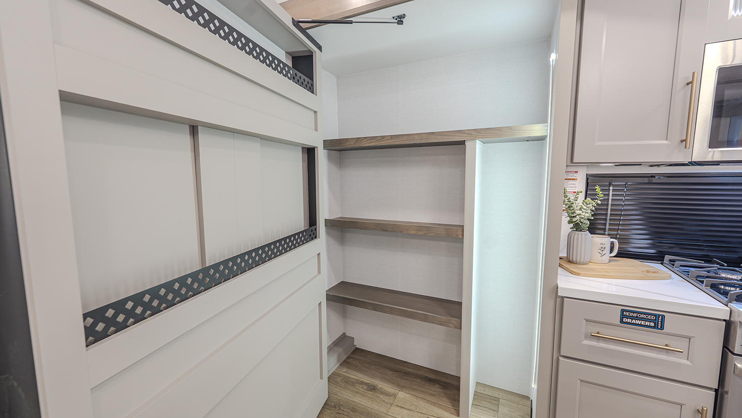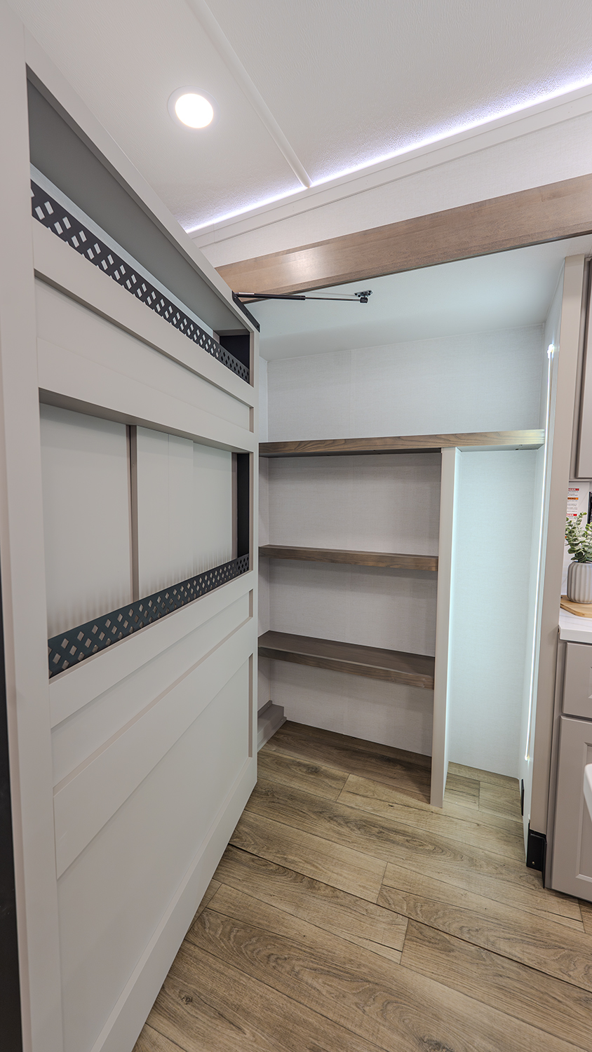 In the bedroom, you’ll enjoy a spacious retreat with a king bed and two bedroom seats for added comfort. The large bedroom closet offers generous hanging space, while the third slide-out in the hallway provides even more shelf storage, ensuring you have plenty of room for your belongings. The full bathroom includes a roomy 61" x 30" shower, offering the convenience of home even on the road.