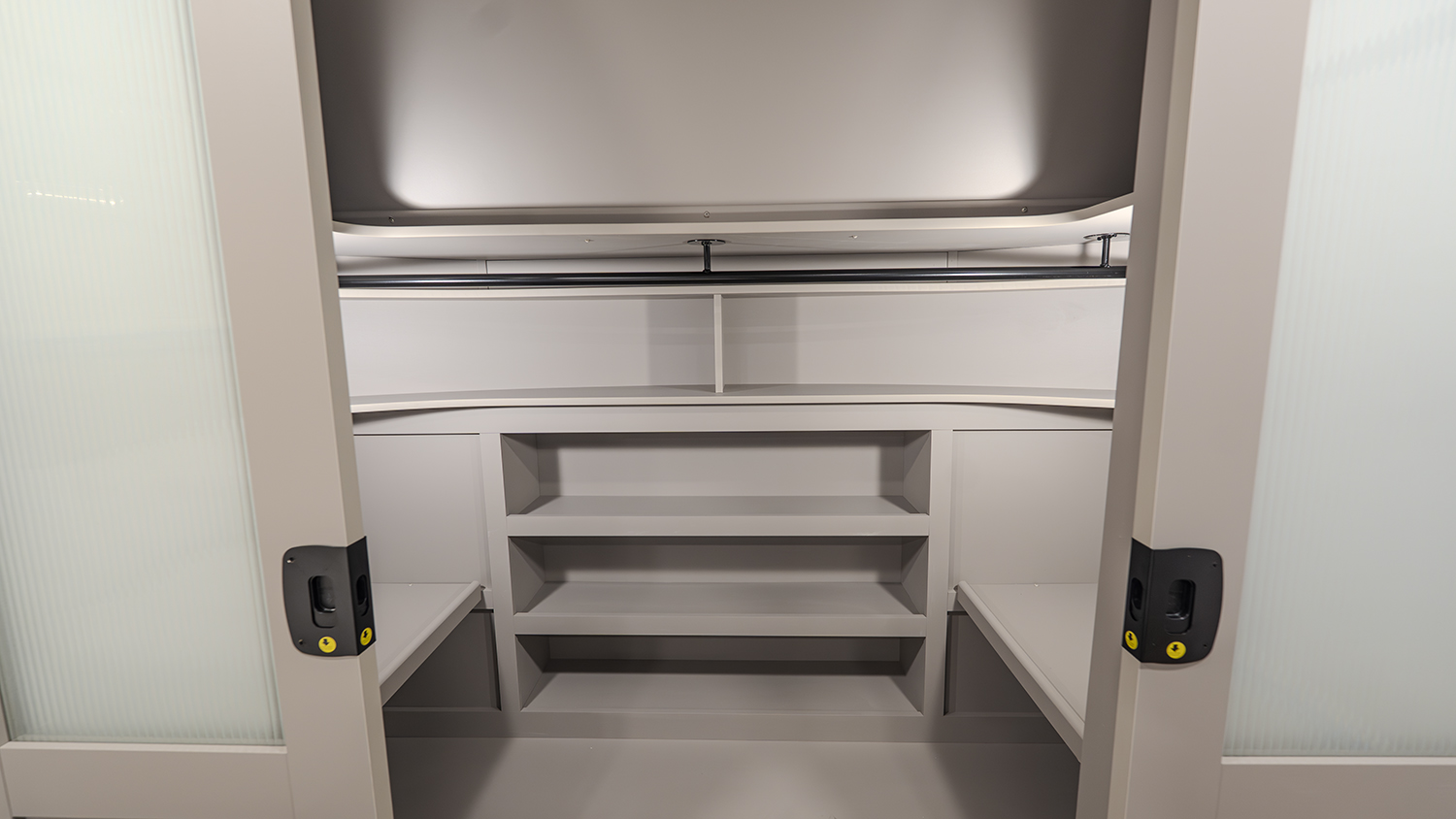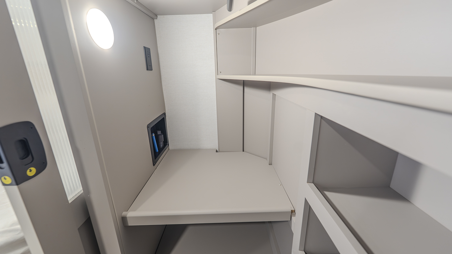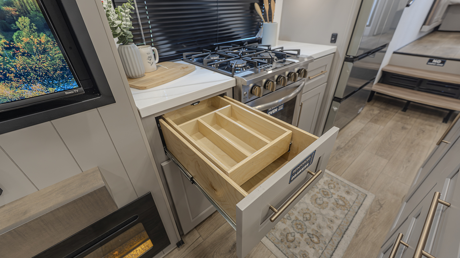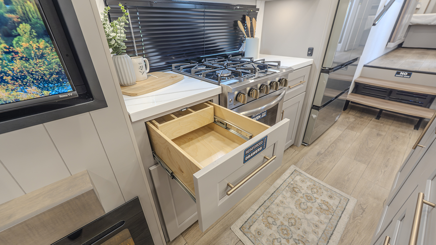 In the bedroom, you’ll enjoy a spacious retreat with a king bed and two bedroom seats for added comfort. The large bedroom closet offers generous hanging space, while the third slide-out in the hallway provides even more shelf storage, ensuring you have plenty of room for your belongings. The full bathroom includes a roomy 61" x 30" shower, offering the convenience of home even on the road.