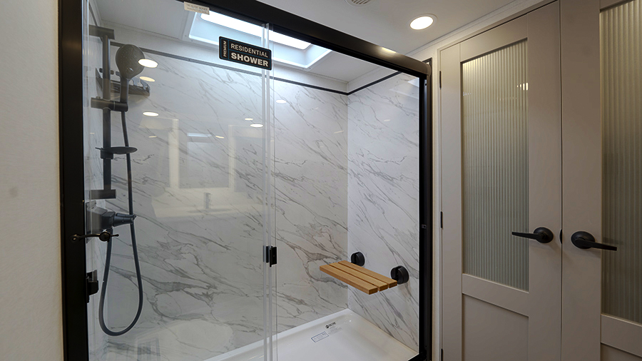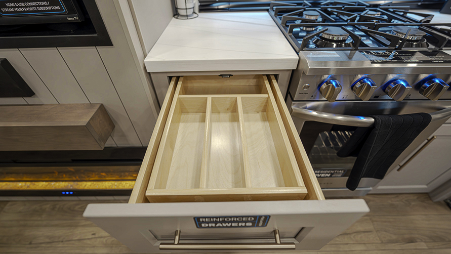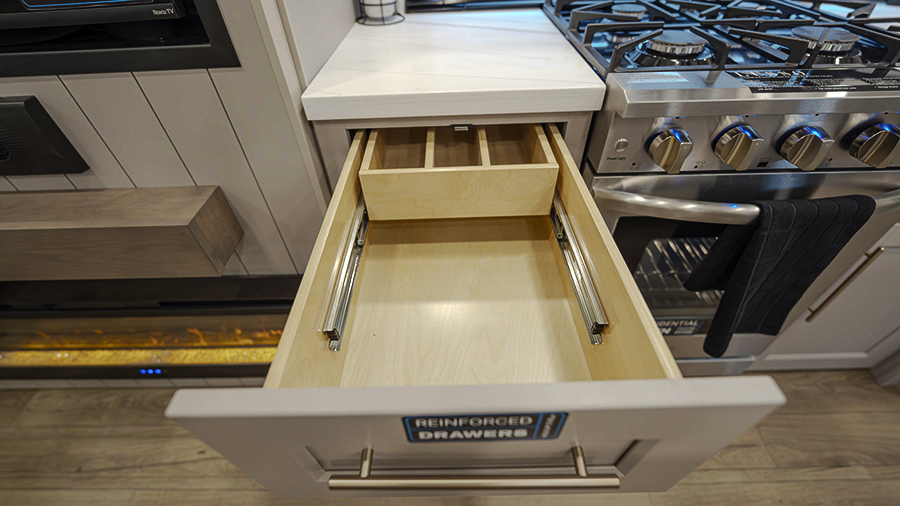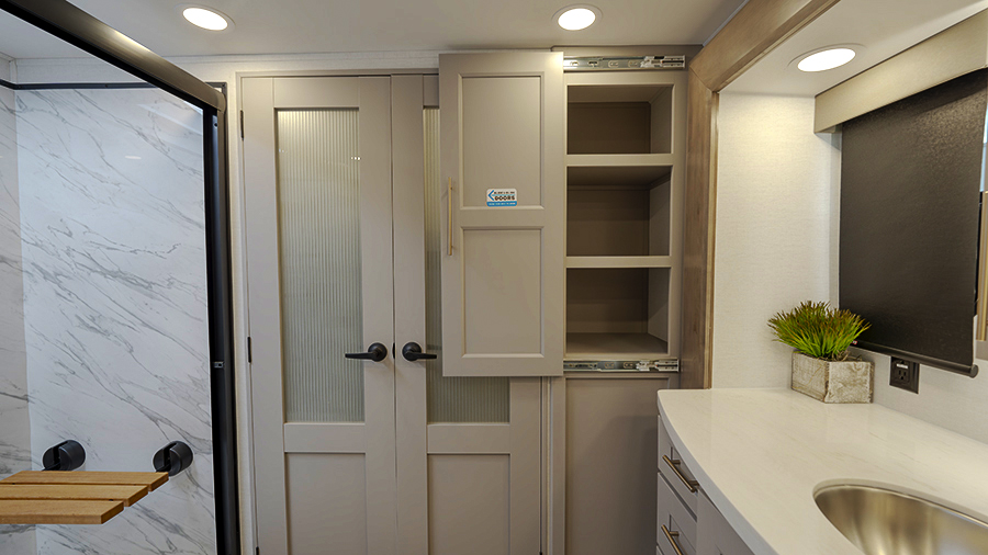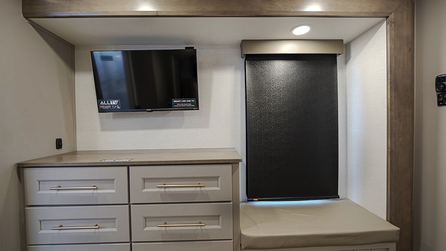 The master bedroom features two slides, giving you extra floor space and storage. Enjoy the comfort of a king-sized bed, and store your belongings in the flip-top dresser and under-seat storage. You can unwind while watching the Smart TV or simply relax in style with the space-saving sliding doors that add elegance to the room.