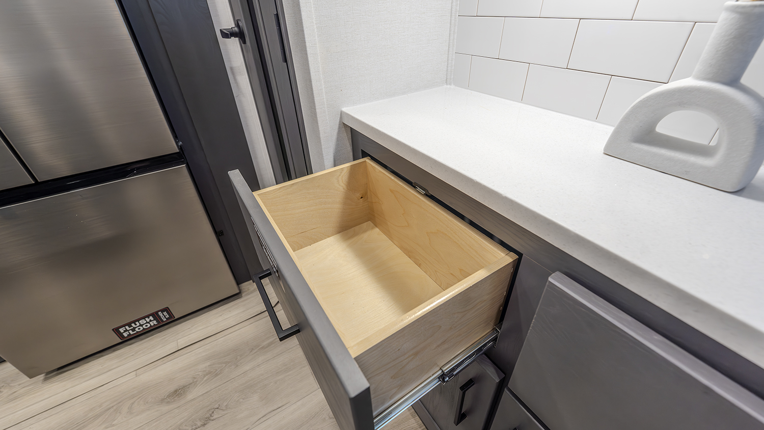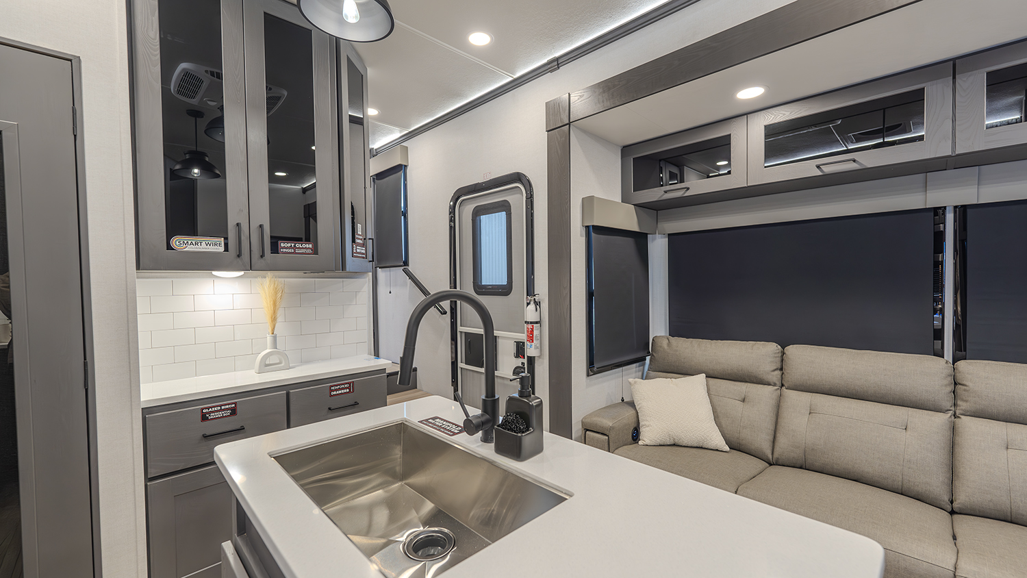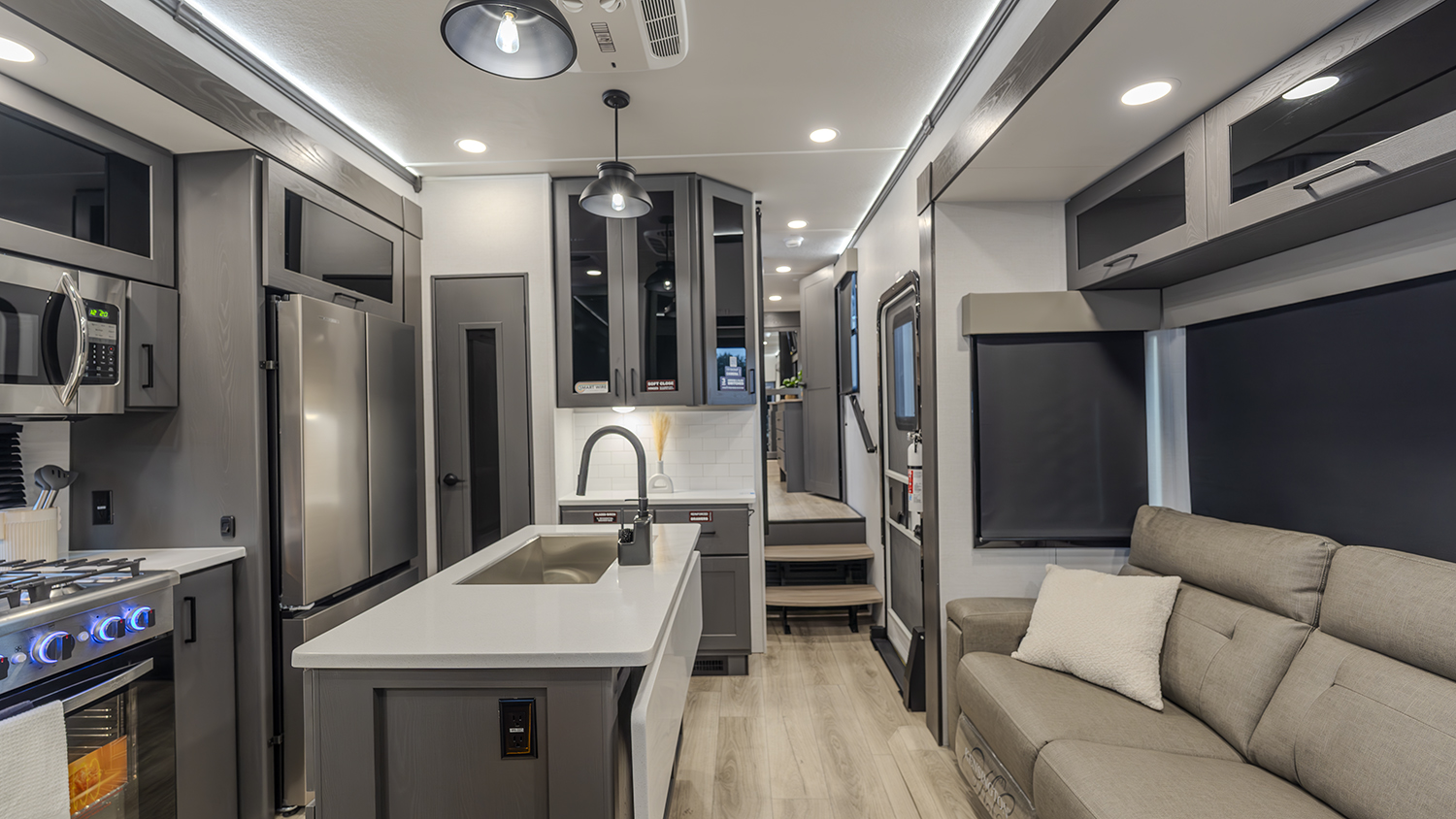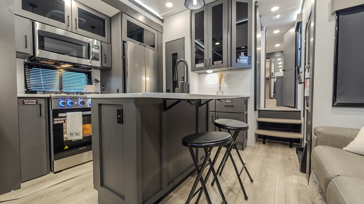 The kitchen is fully equipped to prepare your best meals with two hutches, three pantries, and a kitchen island with two bar stools for a casual dining experience. The dual-entry bathroom includes a 48" x 30" shower and provides direct access to the private front bedroom, ensuring your comfort and privacy. Inside the bedroom, the king bed slide-out gives you extra floor space, while a flip-top dresser and a large front wardrobe (prepped for an optional washer/dryer) provide ample storage.