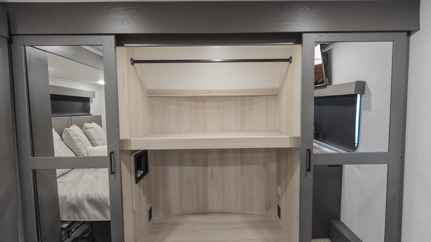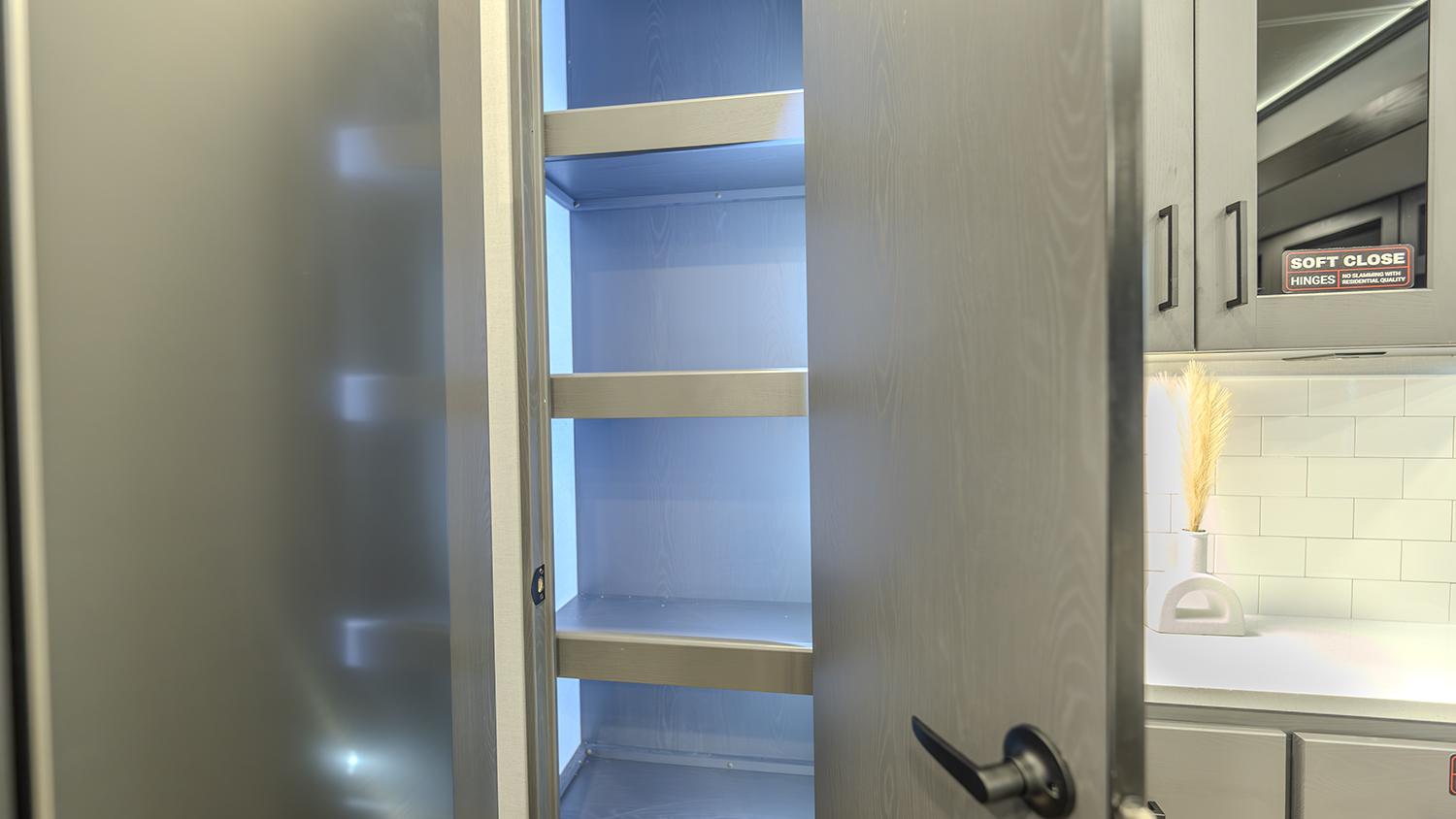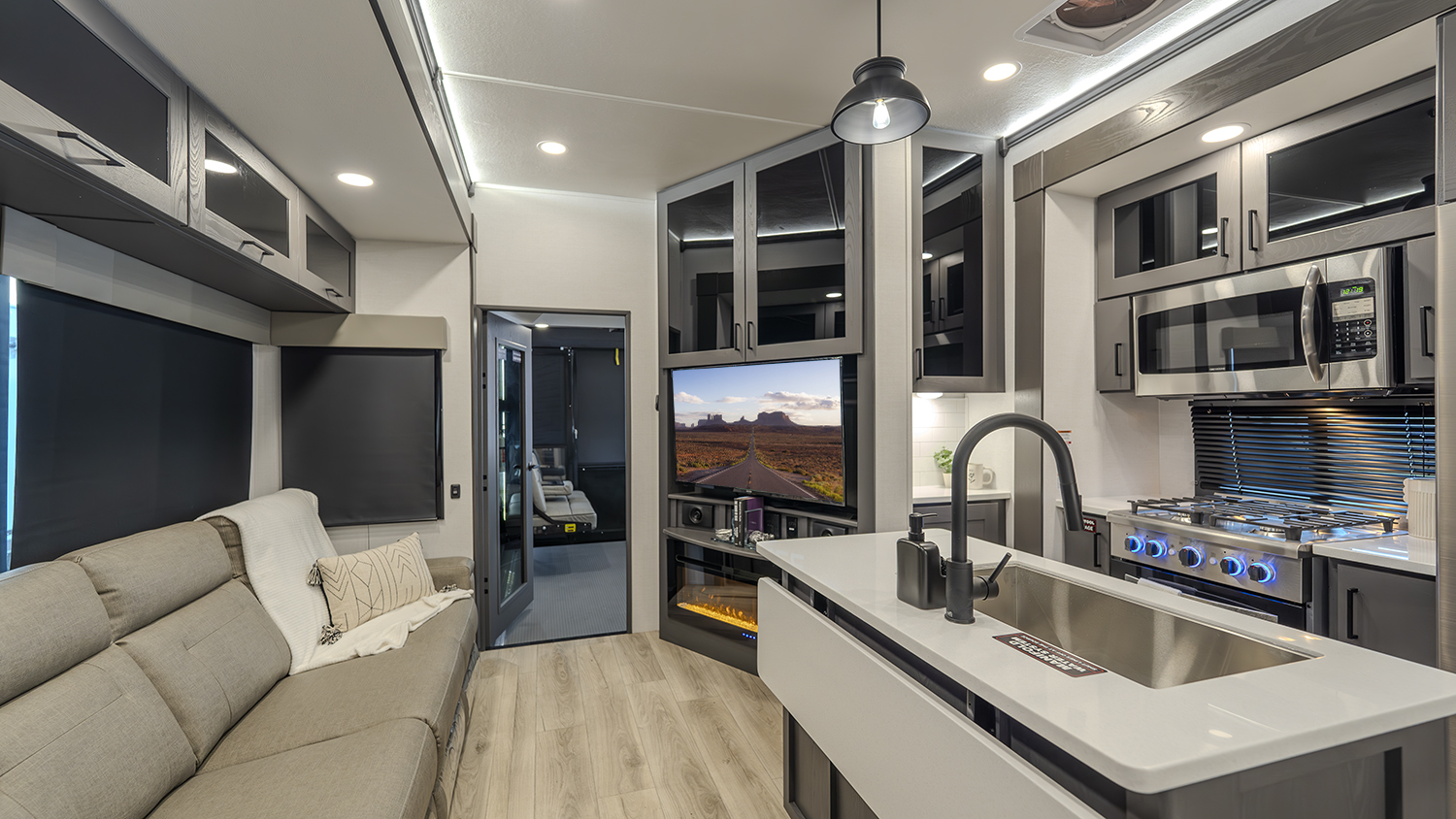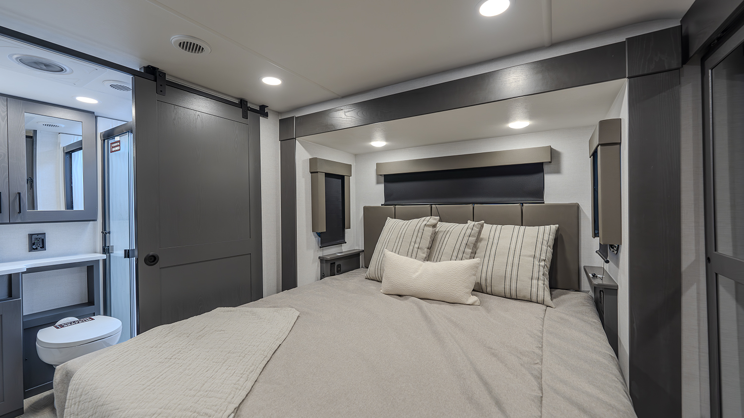 The kitchen is fully equipped to prepare your best meals with two hutches, three pantries, and a kitchen island with two bar stools for a casual dining experience. The dual-entry bathroom includes a 48" x 30" shower and provides direct access to the private front bedroom, ensuring your comfort and privacy. Inside the bedroom, the king bed slide-out gives you extra floor space, while a flip-top dresser and a large front wardrobe (prepped for an optional washer/dryer) provide ample storage.