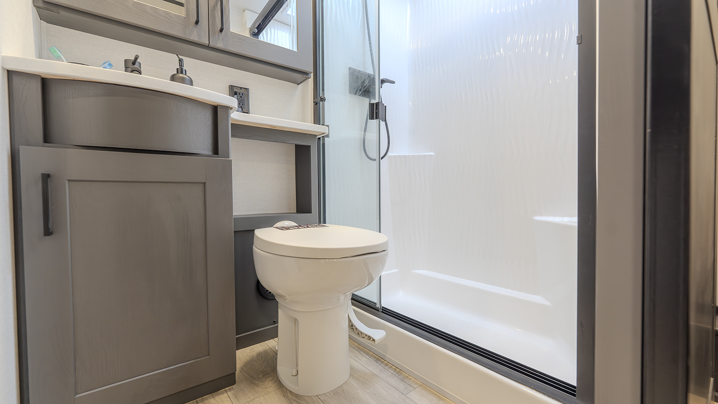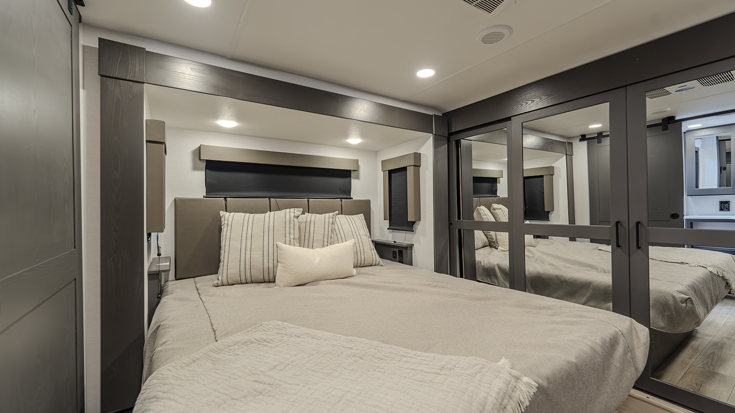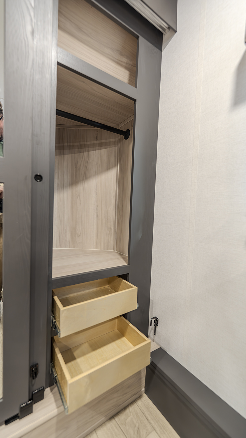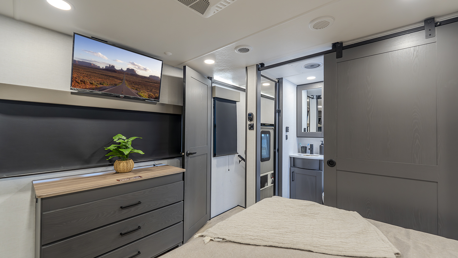 The kitchen is fully equipped to prepare your best meals with two hutches, three pantries, and a kitchen island with two bar stools for a casual dining experience. The dual-entry bathroom includes a 48" x 30" shower and provides direct access to the private front bedroom, ensuring your comfort and privacy. Inside the bedroom, the king bed slide-out gives you extra floor space, while a flip-top dresser and a large front wardrobe (prepped for an optional washer/dryer) provide ample storage.
