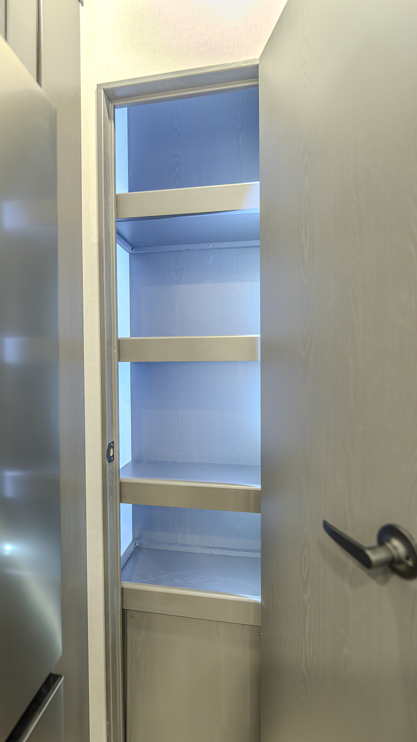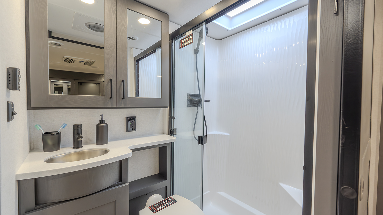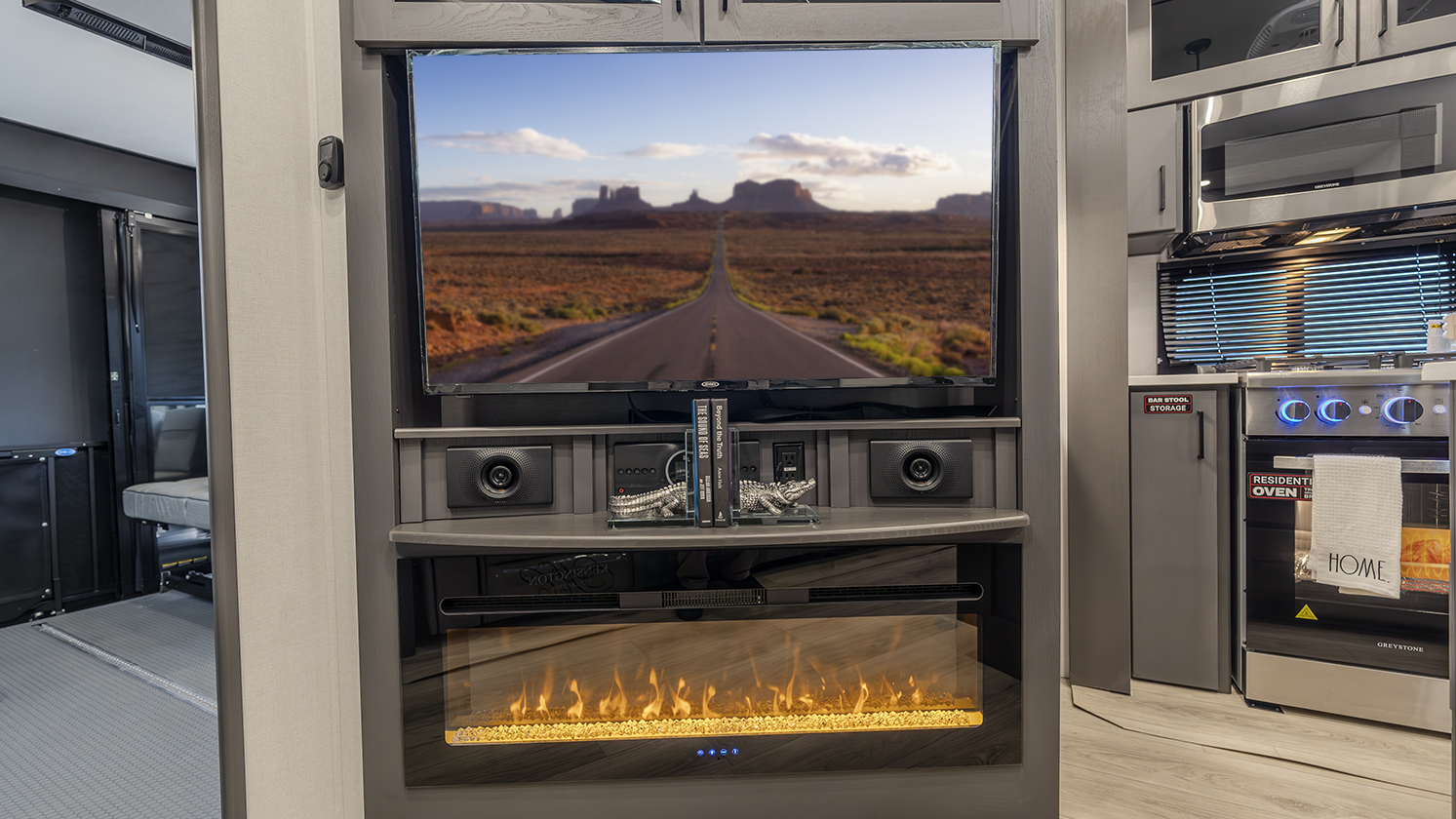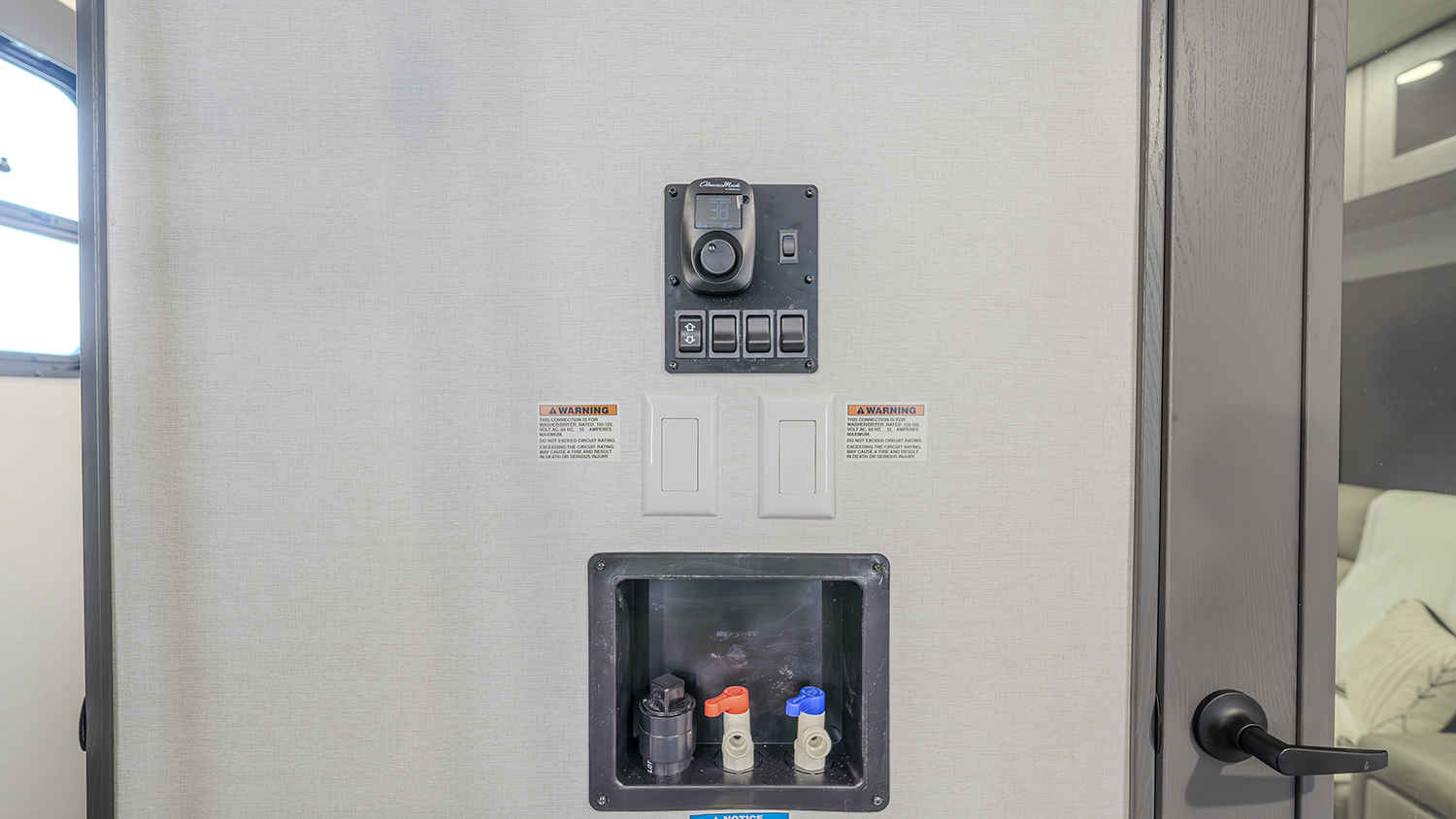 The kitchen is fully equipped to prepare your best meals with two hutches, three pantries, and a kitchen island with two bar stools for a casual dining experience. The dual-entry bathroom includes a 48" x 30" shower and provides direct access to the private front bedroom, ensuring your comfort and privacy. Inside the bedroom, the king bed slide-out gives you extra floor space, while a flip-top dresser and a large front wardrobe (prepped for an optional washer/dryer) provide ample storage.