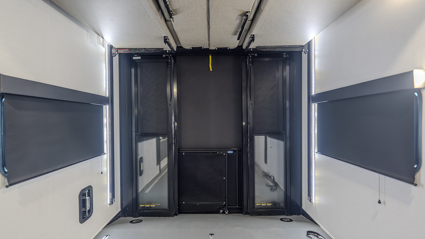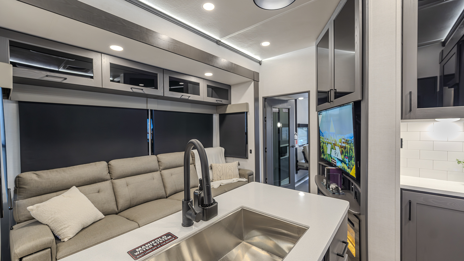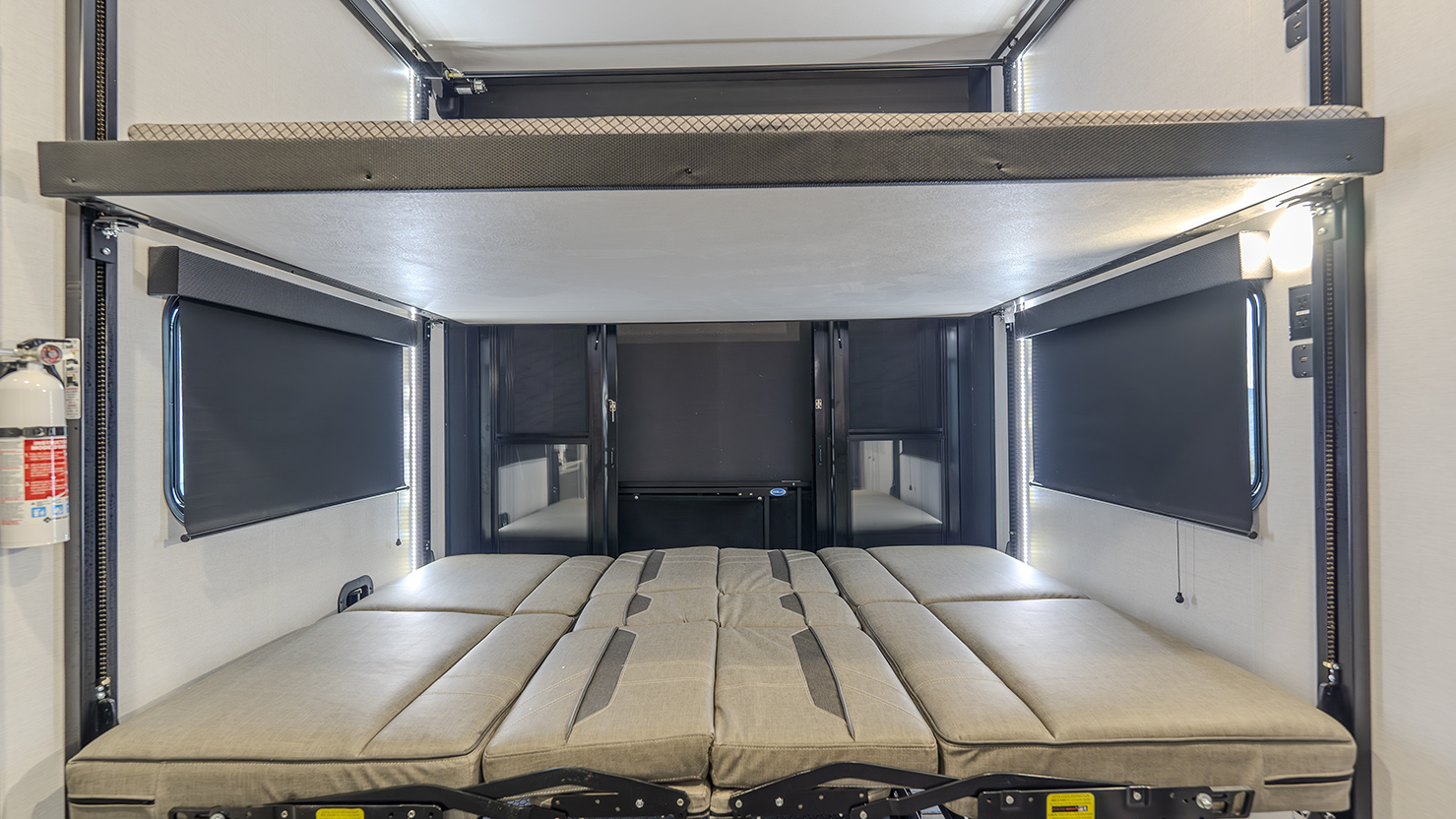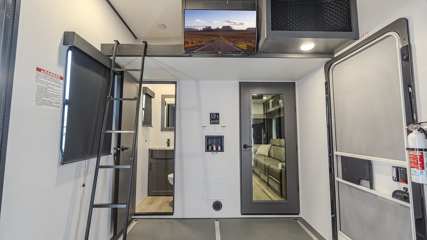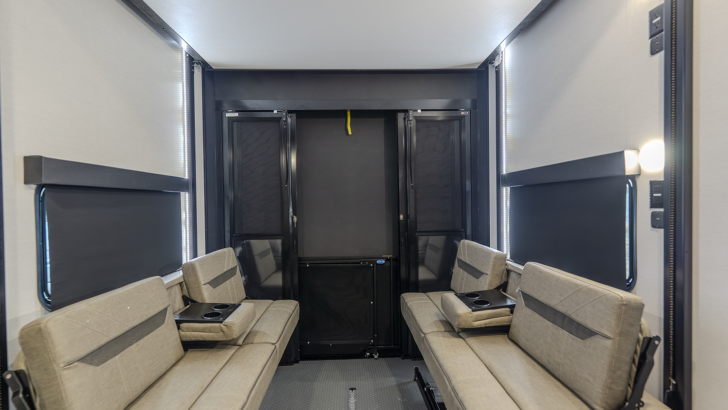 Once you've unloaded your toys, the garage area easily transforms into a spacious living area. The opposing HappiJac sofas provide ample seating, and the drop-down queen mattress offers extra sleeping space when needed. Above the living area, a loft opens to the living room, perfect for additional storage or a cozy sleeping nook. The half bathroom adds convenience for your guests.