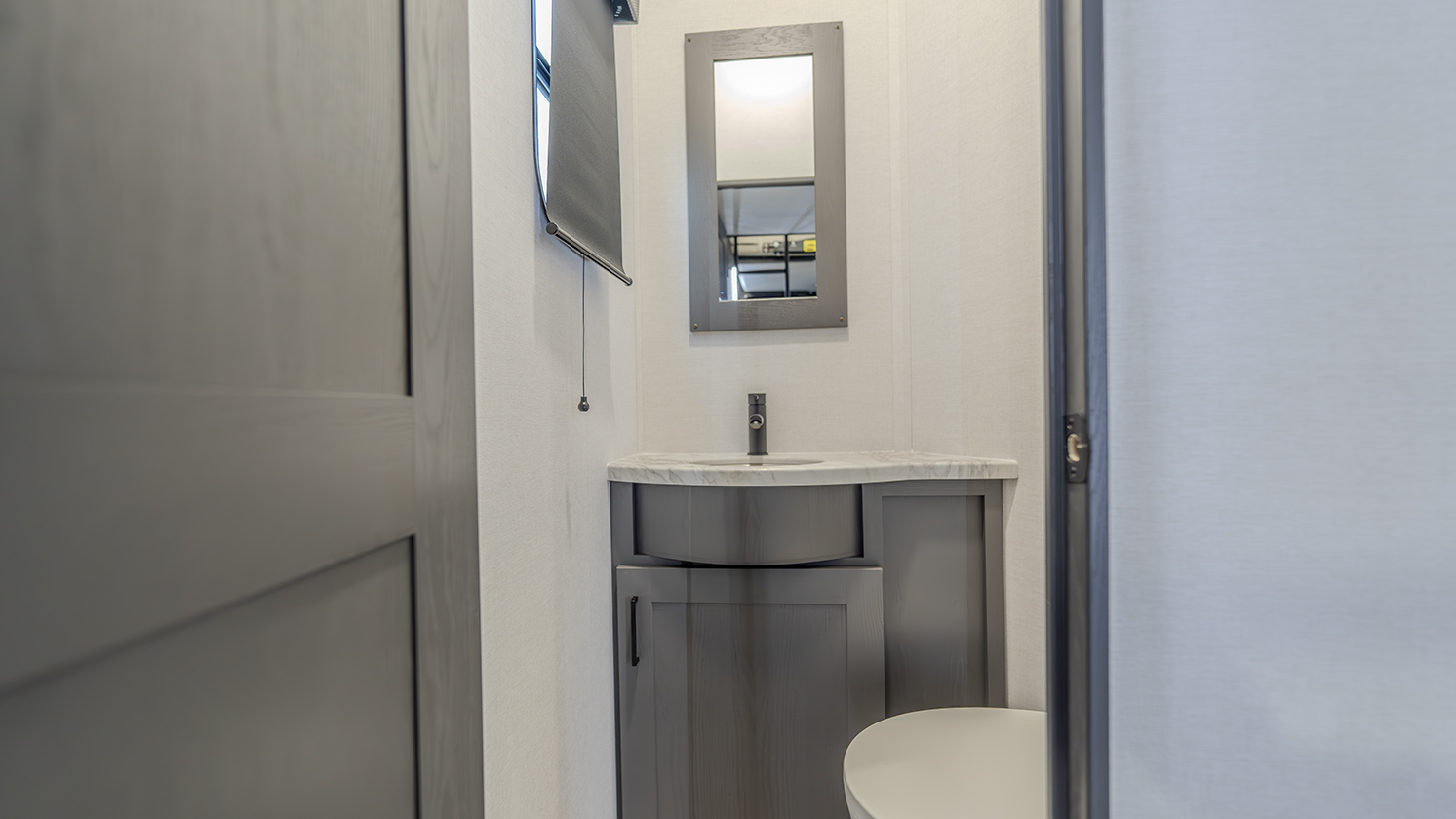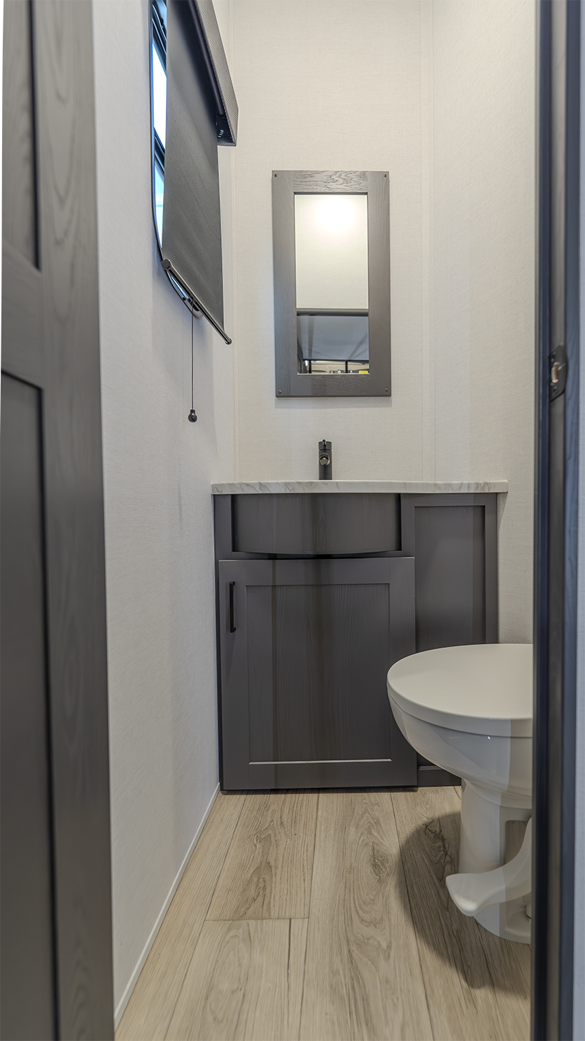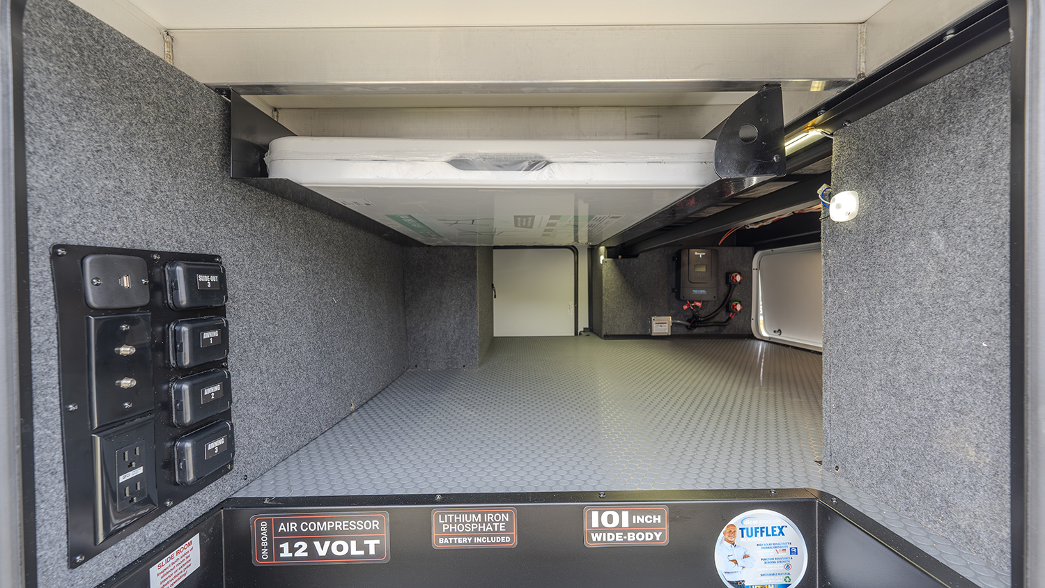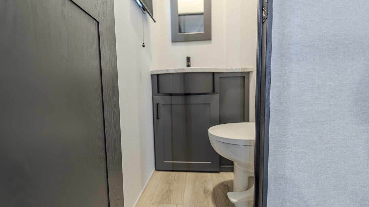 Once you've unloaded your toys, the garage area easily transforms into a spacious living area. The opposing HappiJac sofas provide ample seating, and the drop-down queen mattress offers extra sleeping space when needed. Above the living area, a loft opens to the living room, perfect for additional storage or a cozy sleeping nook. The half bathroom adds convenience for your guests.