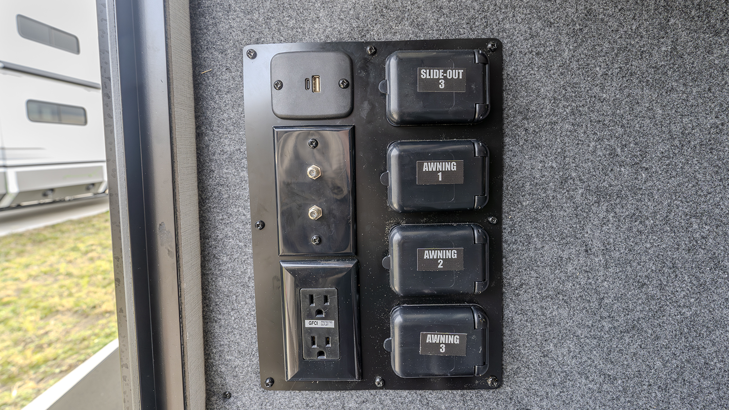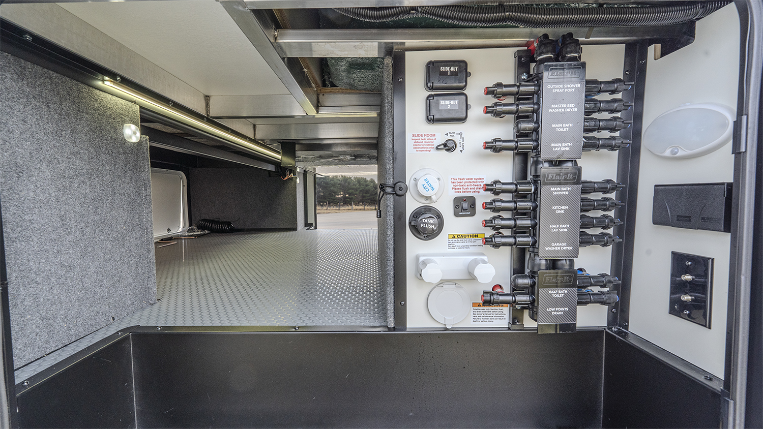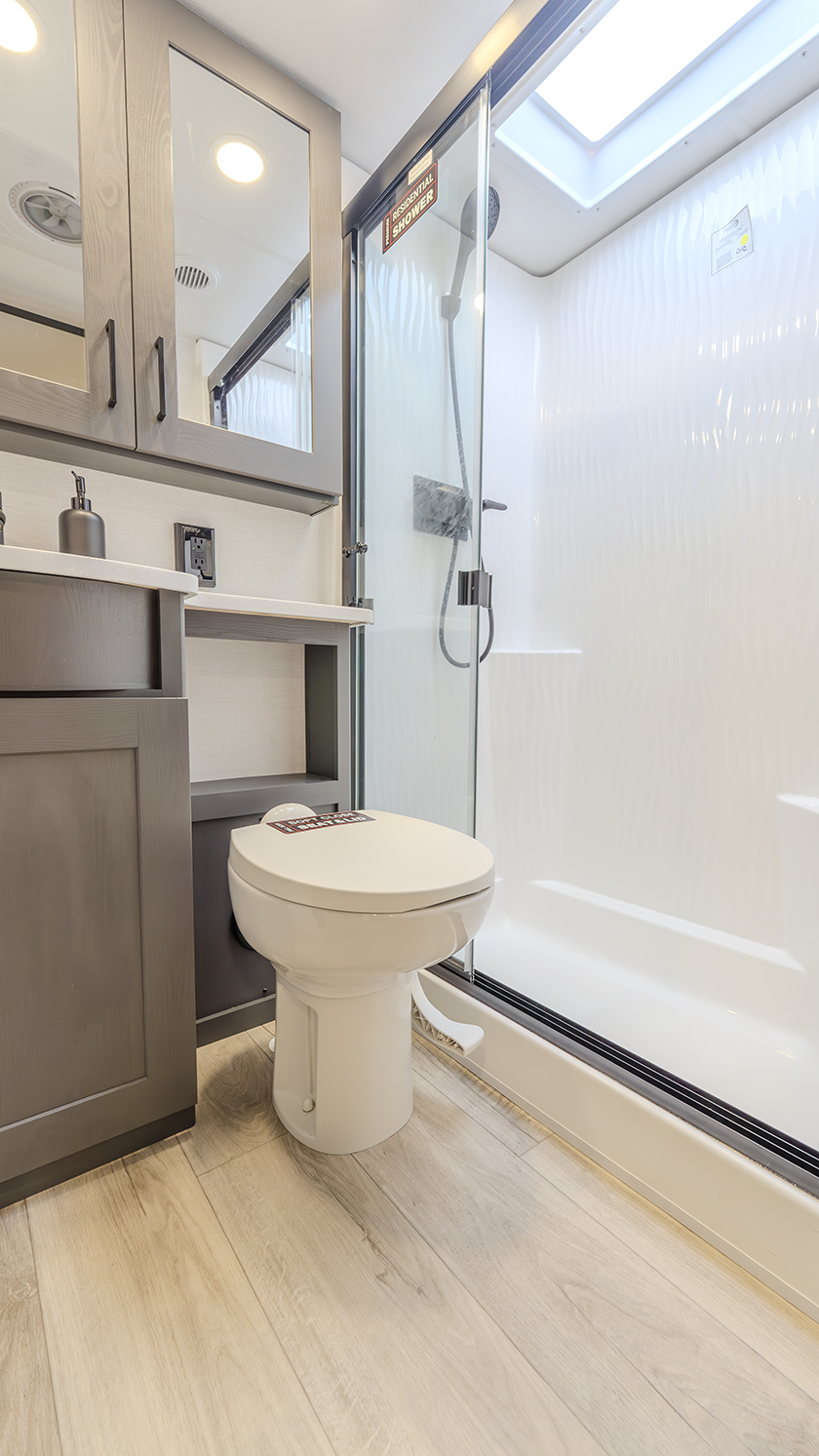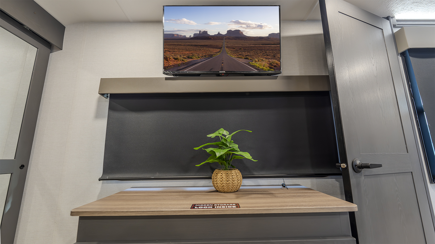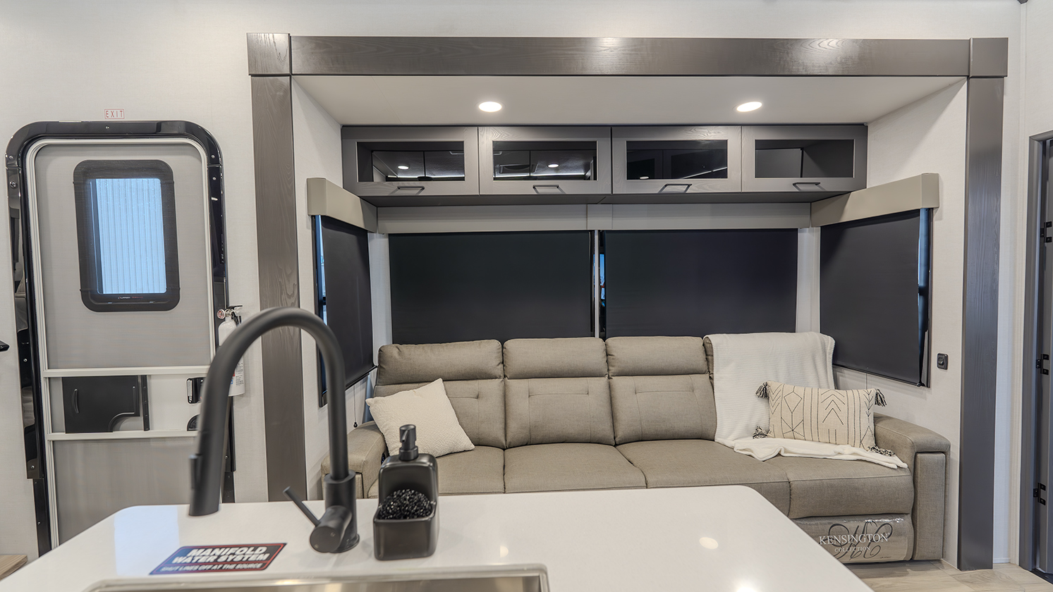 Once you've unloaded your toys, the garage area easily transforms into a spacious living area. The opposing HappiJac sofas provide ample seating, and the drop-down queen mattress offers extra sleeping space when needed. Above the living area, a loft opens to the living room, perfect for additional storage or a cozy sleeping nook. The half bathroom adds convenience for your guests.