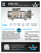The Delta 252RL blends compact design with residential comfort, making it an ideal travel trailer for couples and weekend explorers. A rear dinette and reclining loveseat offer cozy seating options, all centered around an entertainment wall with a 40" HDTV and fireplace. The kitchen delivers practicality with a flip-up counter, pantry, and 10 cu. ft. refrigerator—perfect for extended stays. The private queen bedroom ensures restful nights, while the spacious bathroom adds convenience with direct access from the main living area. With outdoor amenities like a griddle grill, 18' awning, and 62 cu. ft. of drop-frame storage, the Delta 252RL is made for easy, elevated travel.