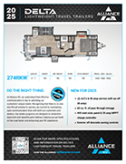 The Delta 274RKW offers a sleek, rear-kitchen design perfect for couples or small families looking for comfort and utility on the road. A spacious kitchen and entertainment-ready living area make it easy to unwind, featuring a theater seat, 40" TV, and optional freestanding dining setup. Smart storage solutions like a pull-out pantry and overhead cabinets keep essentials organized. The full bath with washer/dryer prep and the private queen bedroom with built-in fireplace and wardrobes add a residential feel. With a 19' awning, outdoor griddle, and well-thought-out layout, the 274RKW makes every trip feel like a retreat.