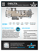 The Delta 321BH is the perfect family travel trailer, offering a spacious layout with a dedicated rear bunkhouse that keeps kids or guests comfortable and organized. The main living area delivers relaxation with theater seating and an entertainment center featuring a 40" HDTV and smart storage. A fully equipped kitchen and outdoor griddle give you the flexibility to cook wherever the mood strikes. The front queen bedroom ensures a quiet retreat, while the full bath and hallway access add everyday convenience. With dual awnings, massive storage, and flexible sleeping space, the 321BH turns every family getaway into an elevated adventure.