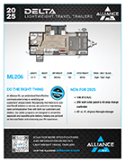 Designed for travelers who want to hit the road with less hassle and more freedom, the Alliance Delta UL ML206 is the ideal ultralight travel trailer for couples or solo adventurers. Compact, stylish, and loaded with residential features, the ML206 proves that you don’t need a large RV to travel in comfort and confidence.
