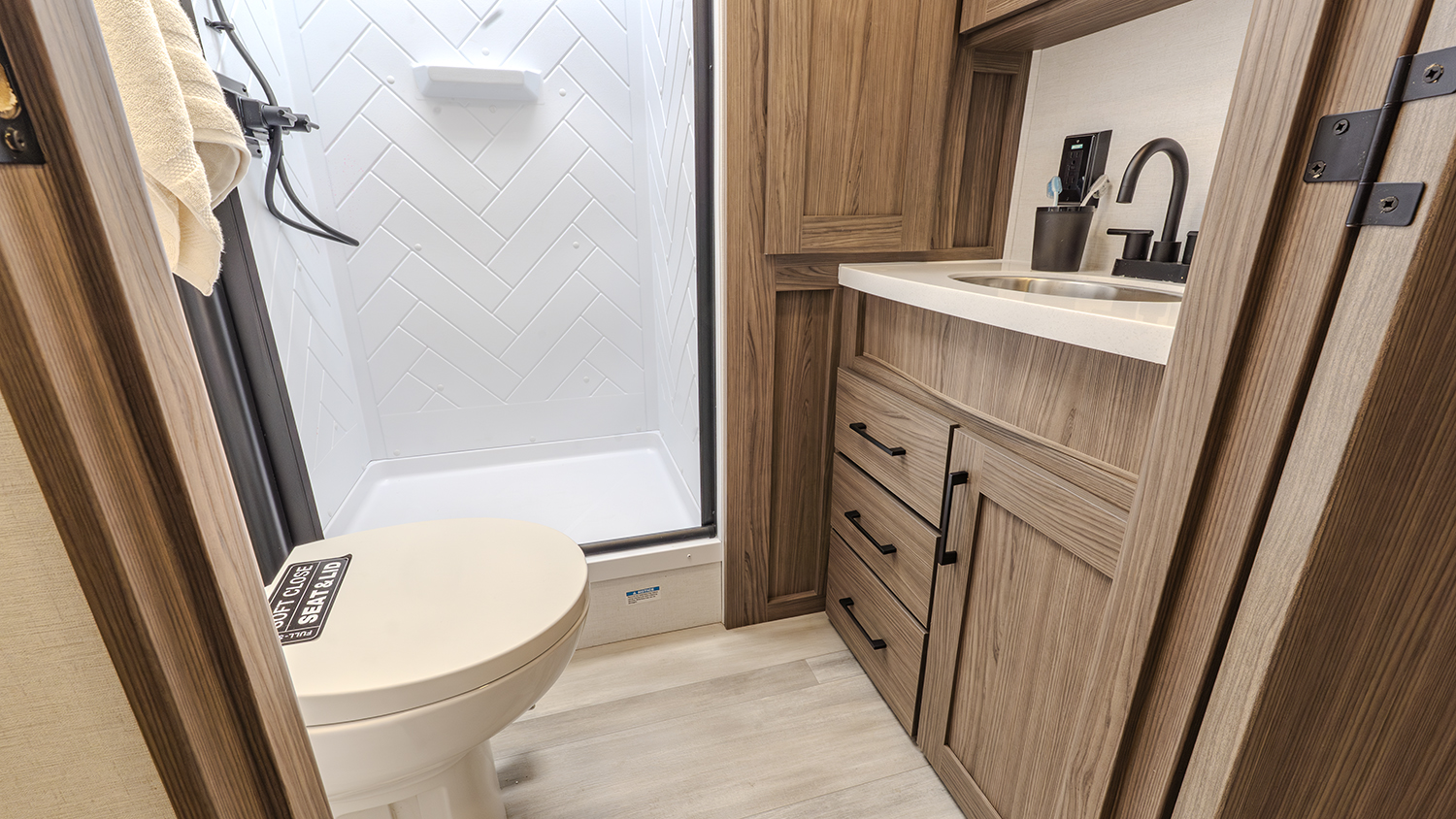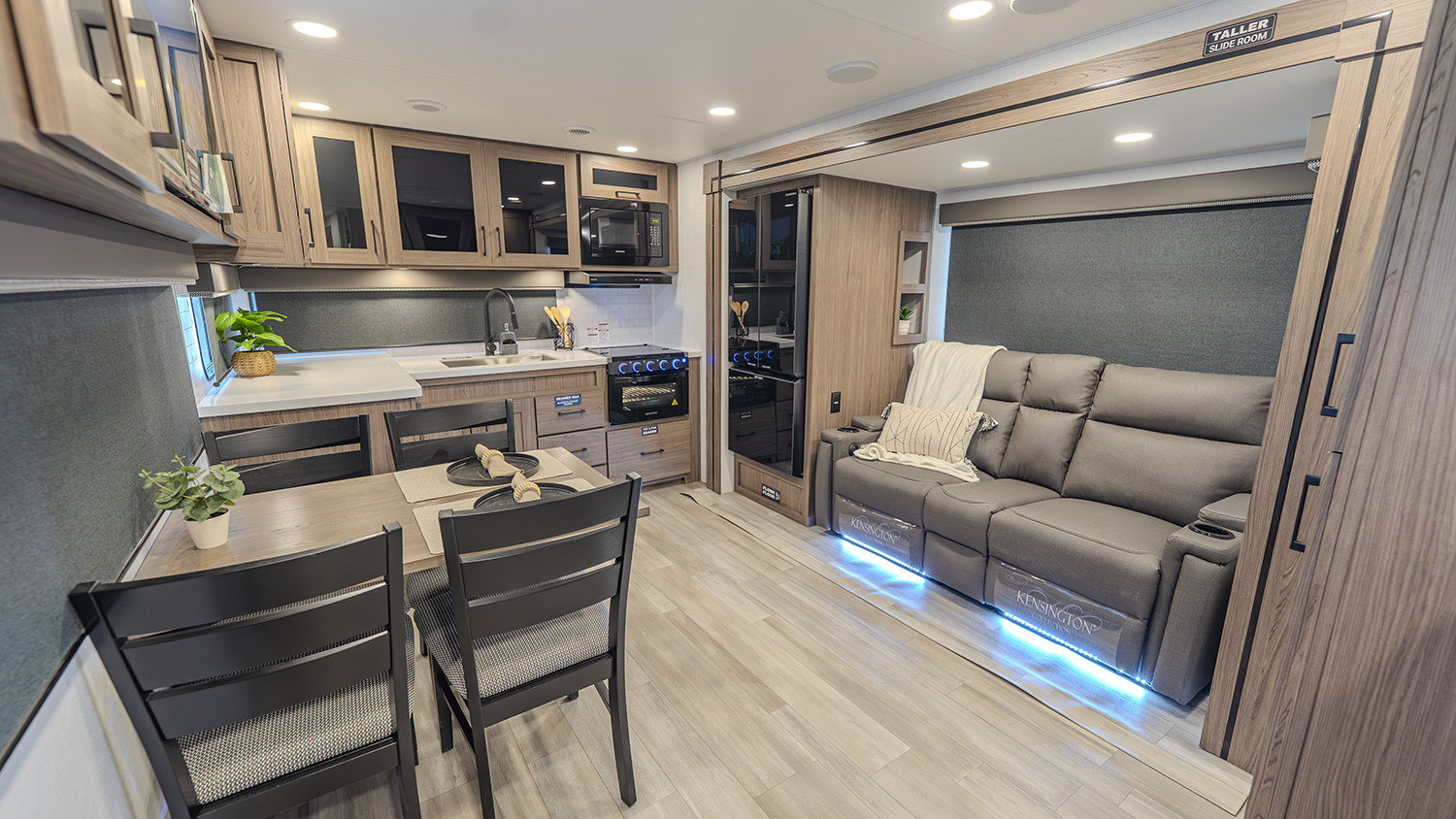- Spacious Living Area – Comfortable theater seating and a dinette with an optional table & chairs for ultimate flexibility.