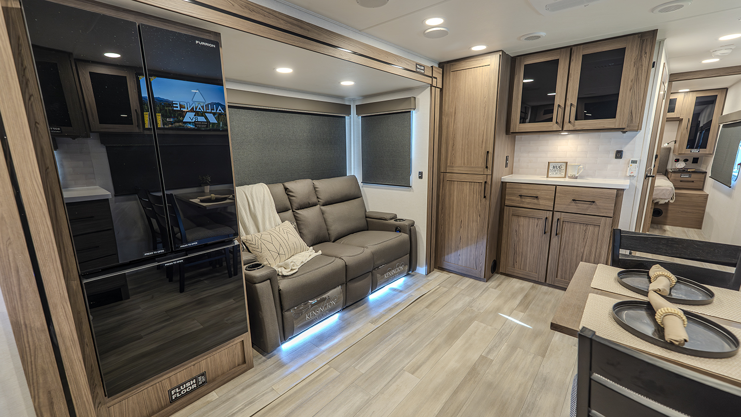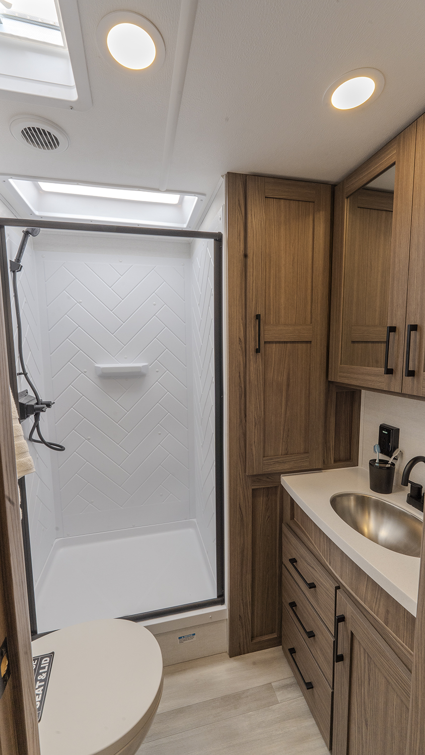 - Rear Kitchen Layout – Expansive counter space, a 10 cu. ft. 12-volt refrigerator, and a pull-out pantry for all your cooking essentials.