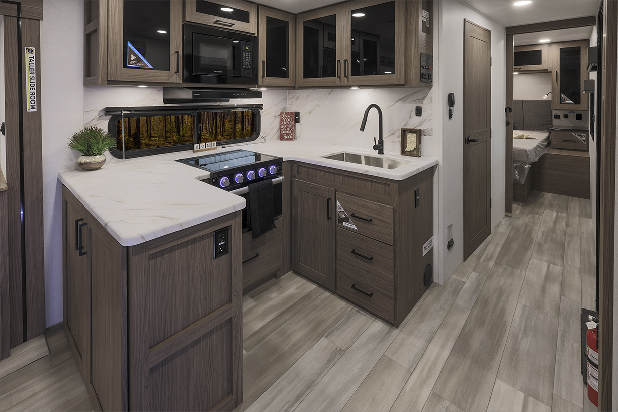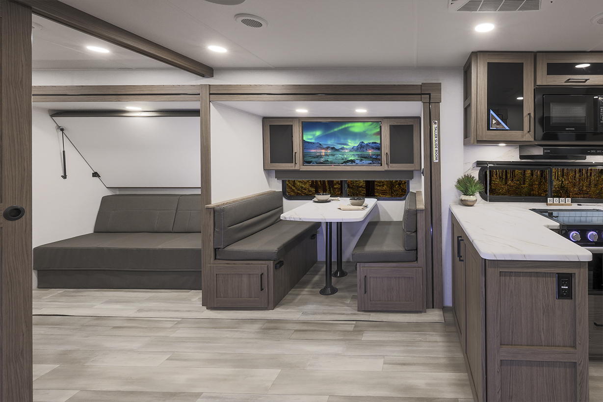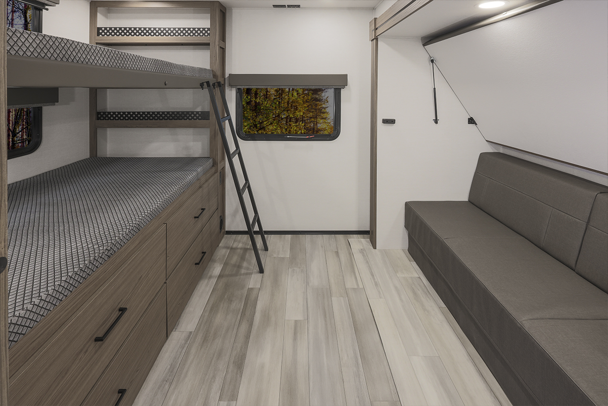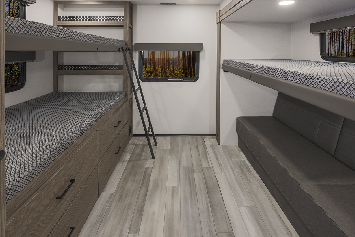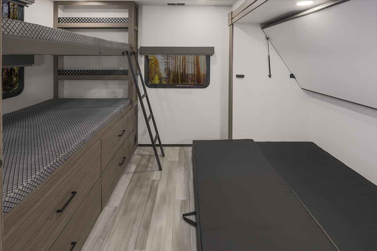The Alliance RV Delta 321BH travel trailer is designed for families and groups of up to eight people, offering comfort and convenience. It includes a rear private bunkhouse with slide-outs, creating a spacious and comfortable area. The double slides expand the living space, featuring a U-shaped kitchen with counter space and storage. The full bathroom includes a shower and amenities for convenience. A private front bedroom. Outdoor features include an included griddle and folding camping table. The trailer is built for durability with a walk-on roof and enclosed underbelly for all-season protection. Spacious storage is available with 62 cu. ft. of pass-through storage. Interior comforts include vinyl flooring, atrium windows for natural light, Bluetooth speaker, and USB charging ports throughout. The trailer offers modern conveniences and plenty of space for outdoor adventures.