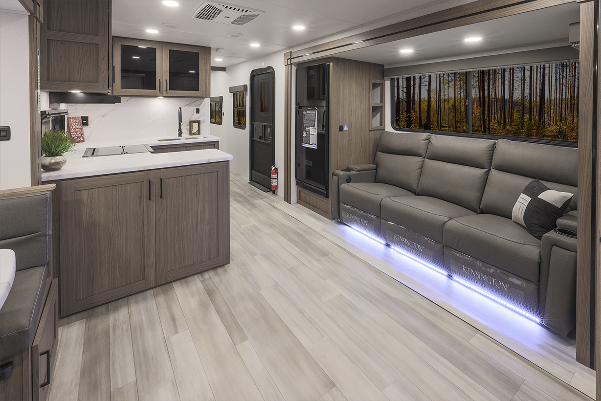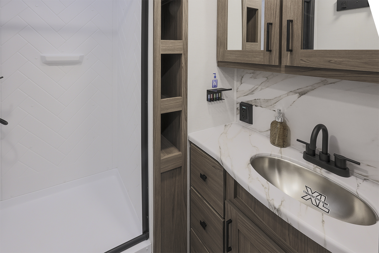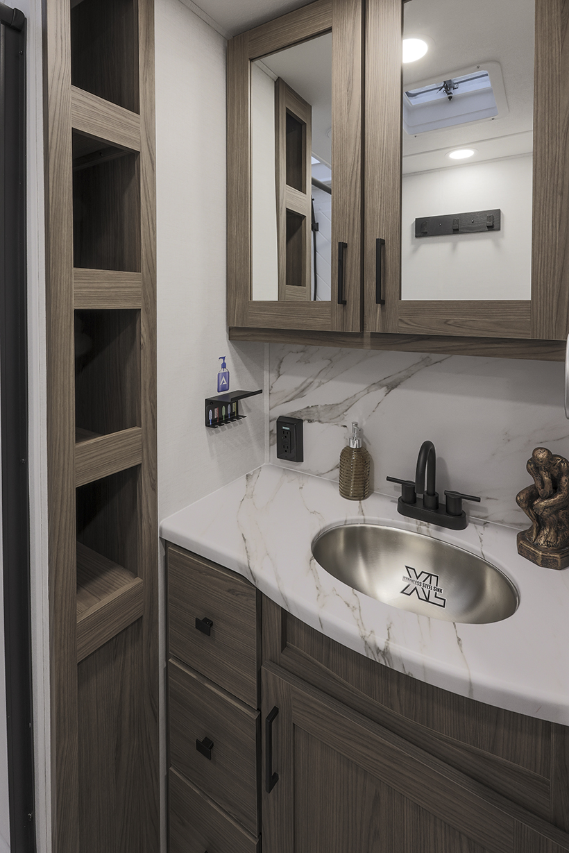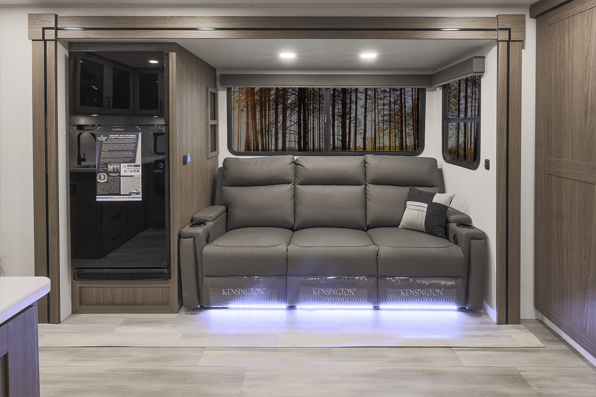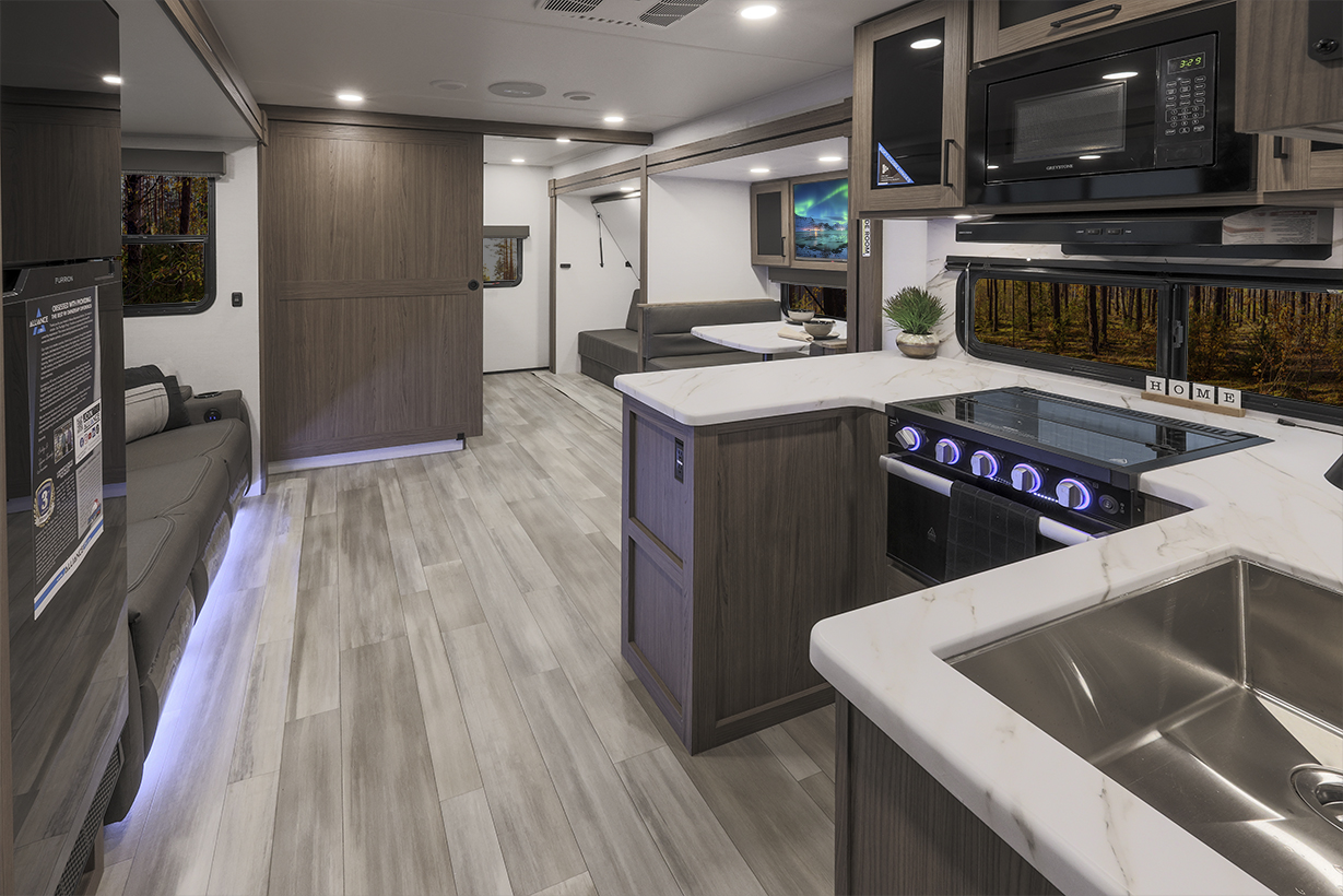 The Alliance RV Delta 321BH travel trailer is designed for families and groups of up to eight people, offering comfort and convenience. It includes a rear private bunkhouse with slide-outs, creating a spacious and comfortable area. The double slides expand the living space, featuring a U-shaped kitchen with counter space and storage. The full bathroom includes a shower and amenities for convenience. A private front bedroom. Outdoor features include an included griddle and folding camping table. The trailer is built for durability with a walk-on roof and enclosed underbelly for all-season protection. Spacious storage is available with 62 cu. ft. of pass-through storage. Interior comforts include vinyl flooring, atrium windows for natural light, Bluetooth speaker, and USB charging ports throughout. The trailer offers modern conveniences and plenty of space for outdoor adventures.
