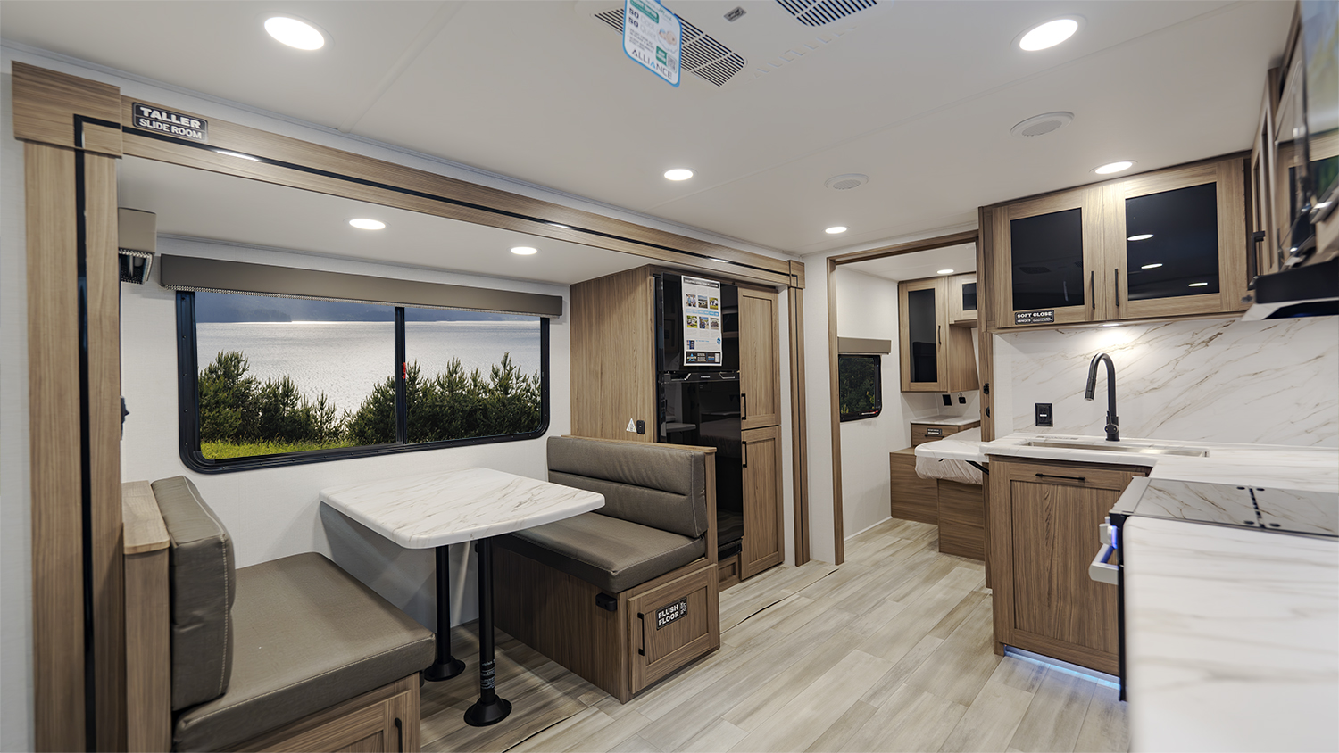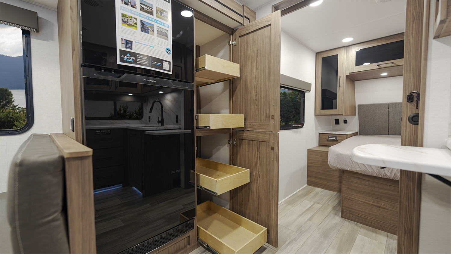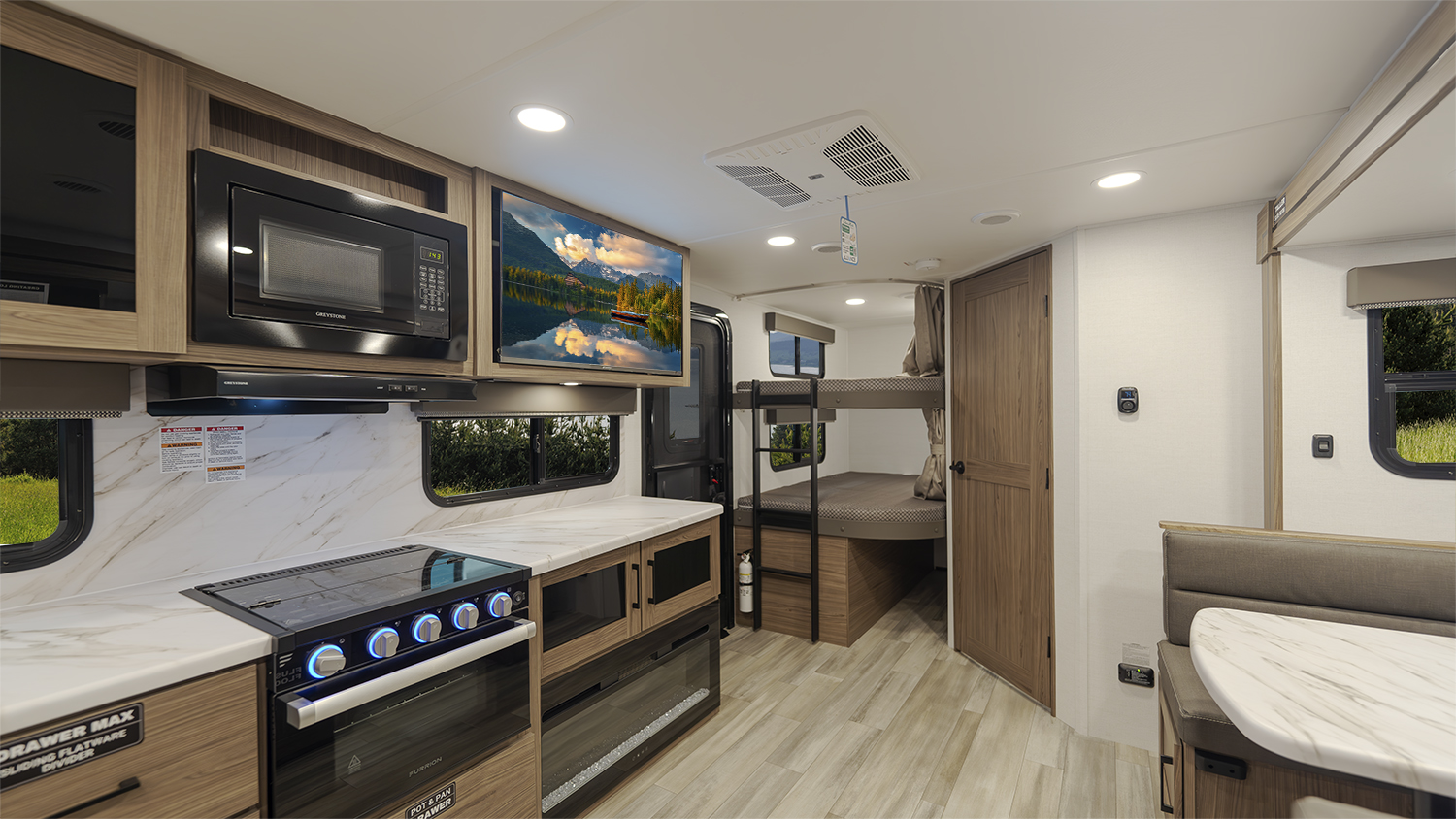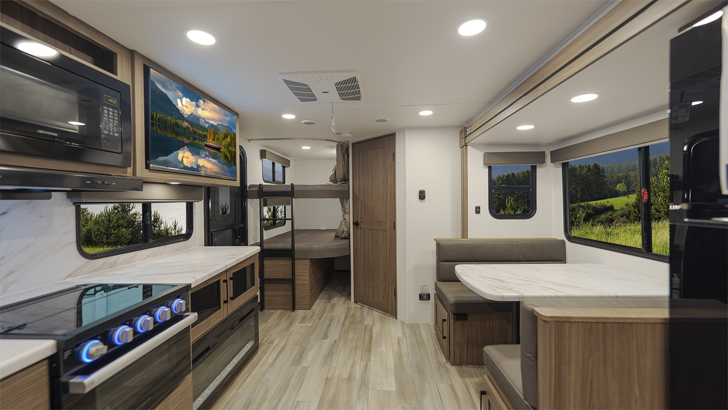 The Alliance RV Delta Ultra Lite travel trailer BH241 is a couple's trailer perfect for weekend trips. It includes a theater seat slide, fireplace, three burner cooktop, and front queen bed. The full bath has a toilet, sink, 32" shower, and linen closet. Storage with dual wardrobes, nightstands, and overhead storage. The Delta Ultra Lite BH241 is a family-friendly travel trailer designed for comfort and lightweight convenience. It is 29 feet 5 inches long and weighs 5,800 pounds, perfect for family adventures.19-foot awning, booth dinette, ample storage, bedroom, and rear bunkhouse. The exterior features of the Delta Ultra Lite travel trailer include oversized atrium windows, a carpet-free interior, magnet catches on cabinets, soft close cabinet doors, LED lighting, temperature-controlled spray ports, exterior awning controls, a 2" rear accessory hitch, and Goodyear Endurance tires.