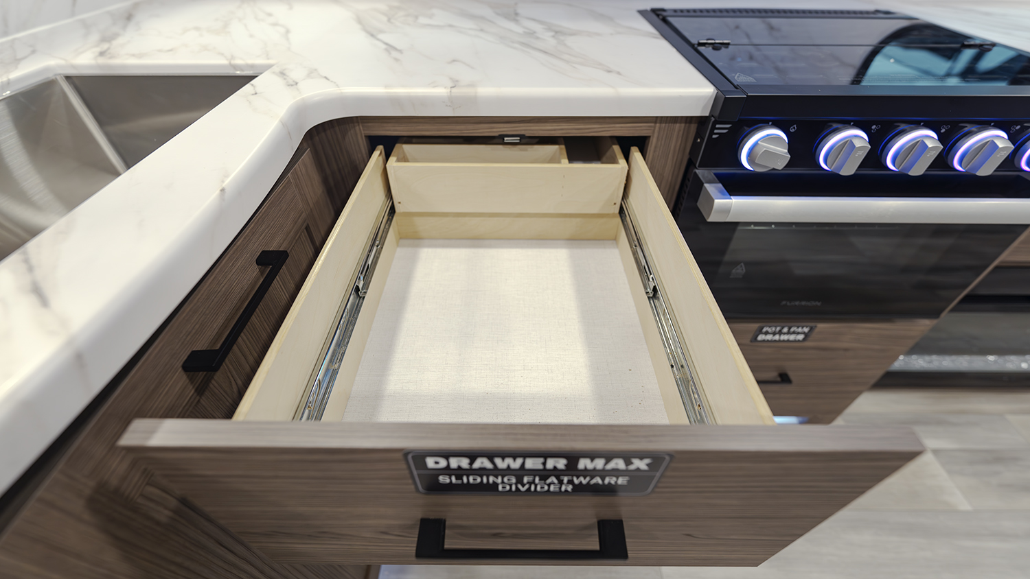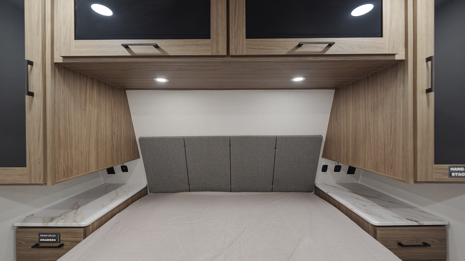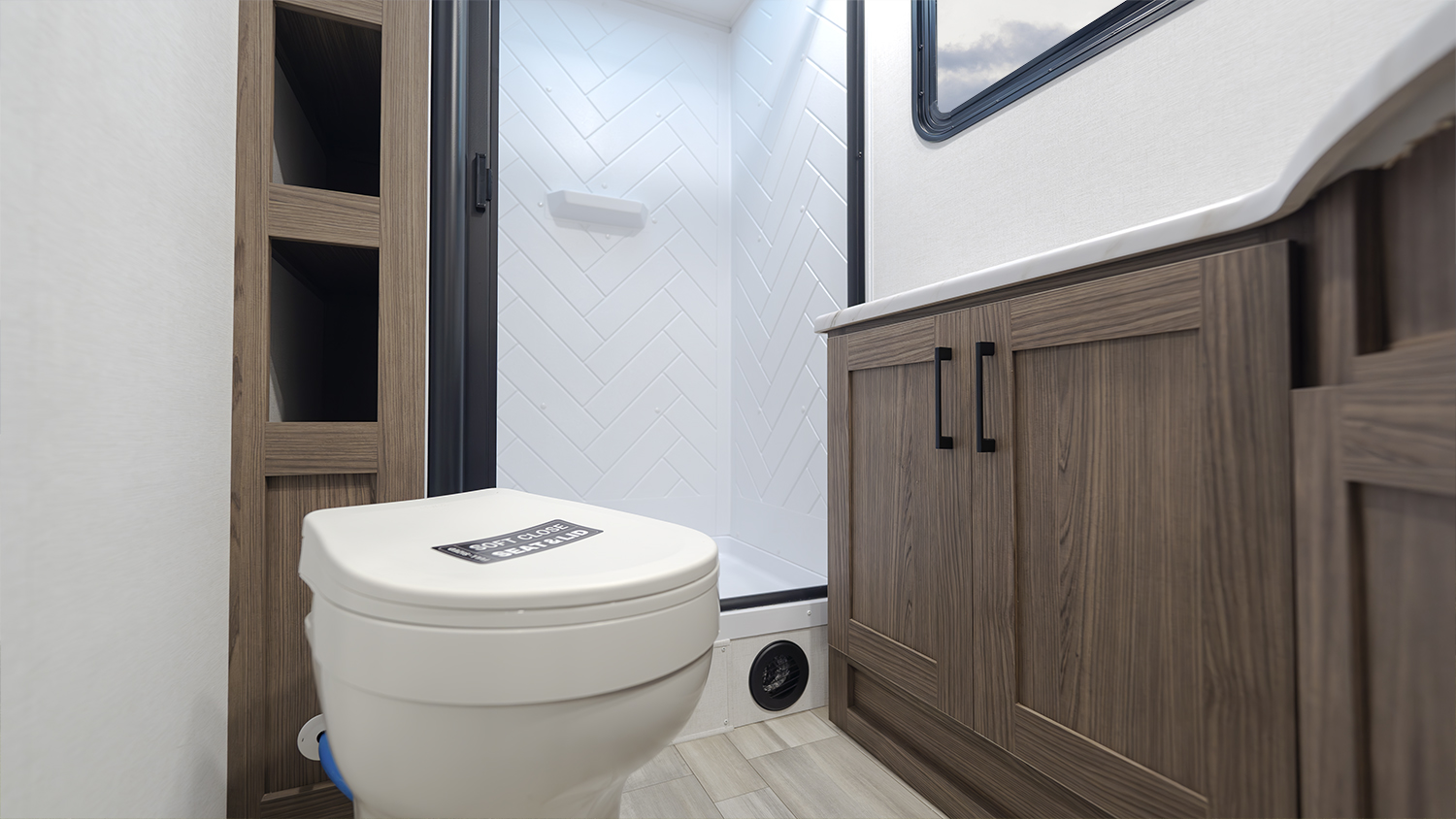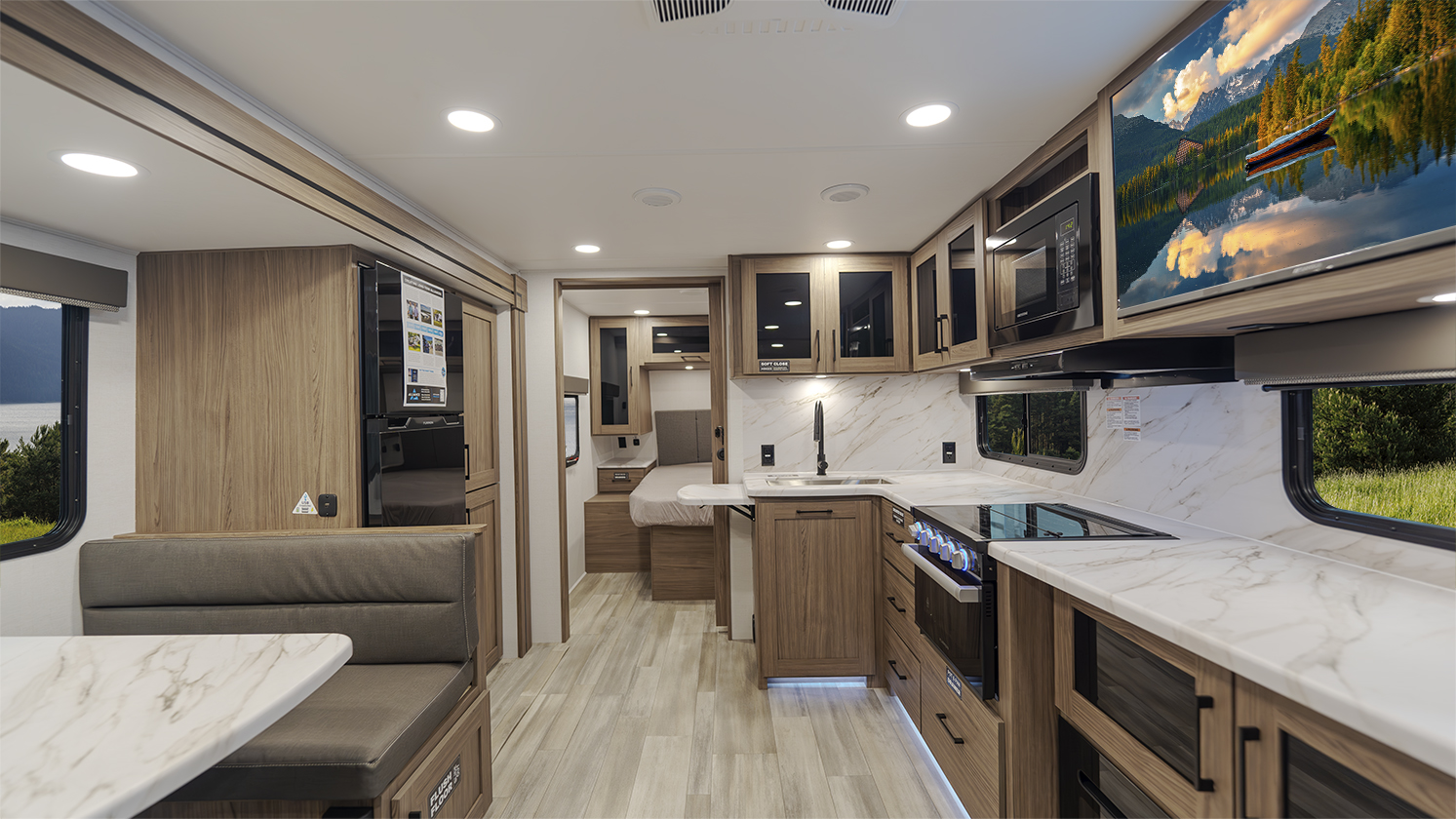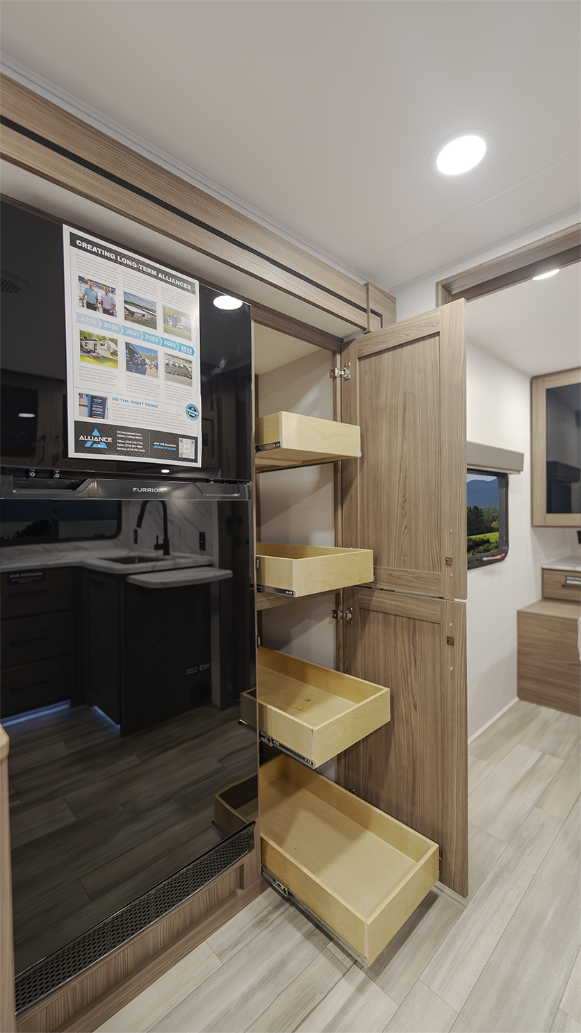 The Alliance RV Delta Ultra Lite travel trailer BH241 is a couple's trailer perfect for weekend trips. It includes a theater seat slide, fireplace, three burner cooktop, and front queen bed. The full bath has a toilet, sink, 32" shower, and linen closet. Storage with dual wardrobes, nightstands, and overhead storage. The Delta Ultra Lite BH241 is a family-friendly travel trailer designed for comfort and lightweight convenience. It is 29 feet 5 inches long and weighs 5,800 pounds, perfect for family adventures.19-foot awning, booth dinette, ample storage, bedroom, and rear bunkhouse. The exterior features of the Delta Ultra Lite travel trailer include oversized atrium windows, a carpet-free interior, magnet catches on cabinets, soft close cabinet doors, LED lighting, temperature-controlled spray ports, exterior awning controls, a 2" rear accessory hitch, and Goodyear Endurance tires.