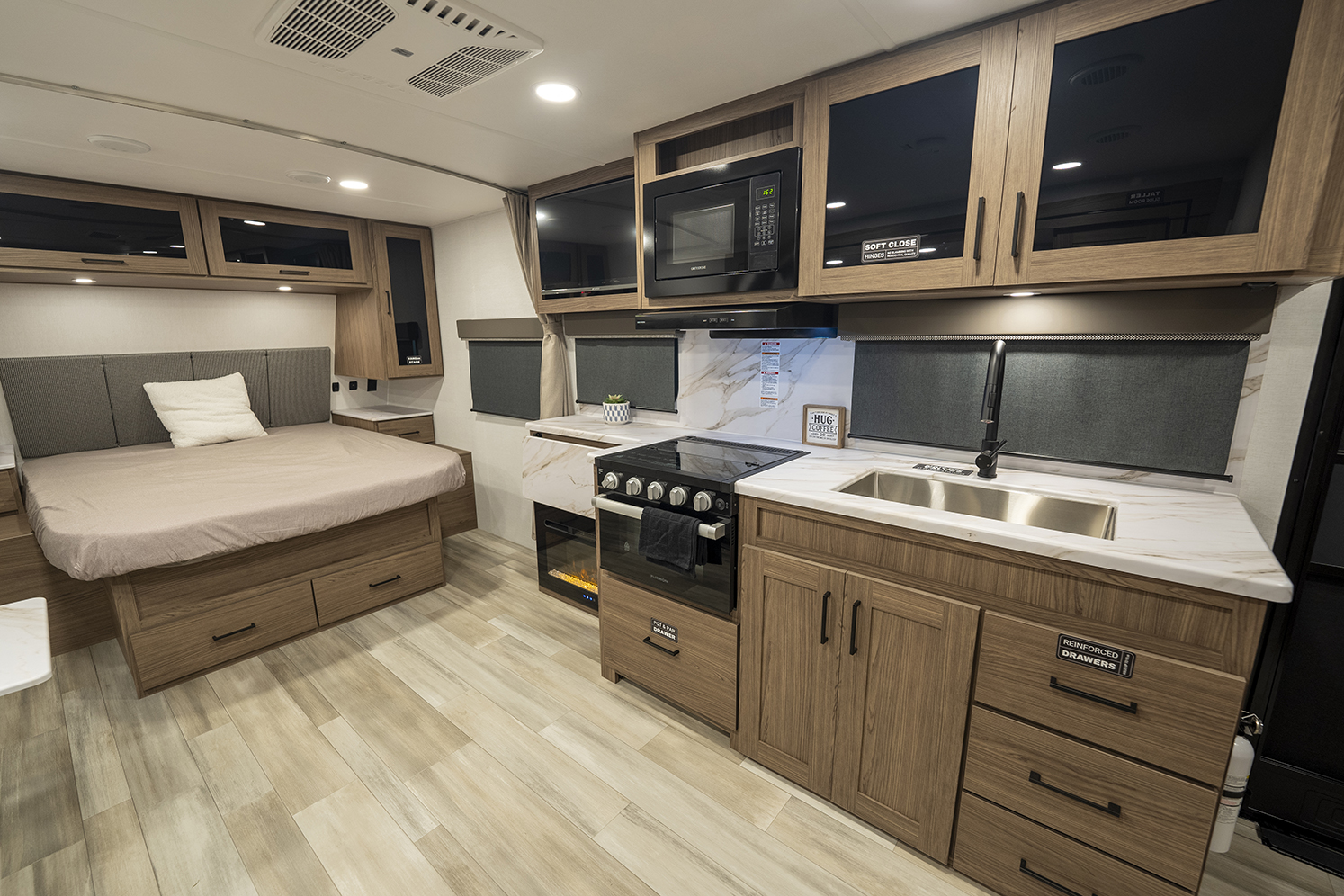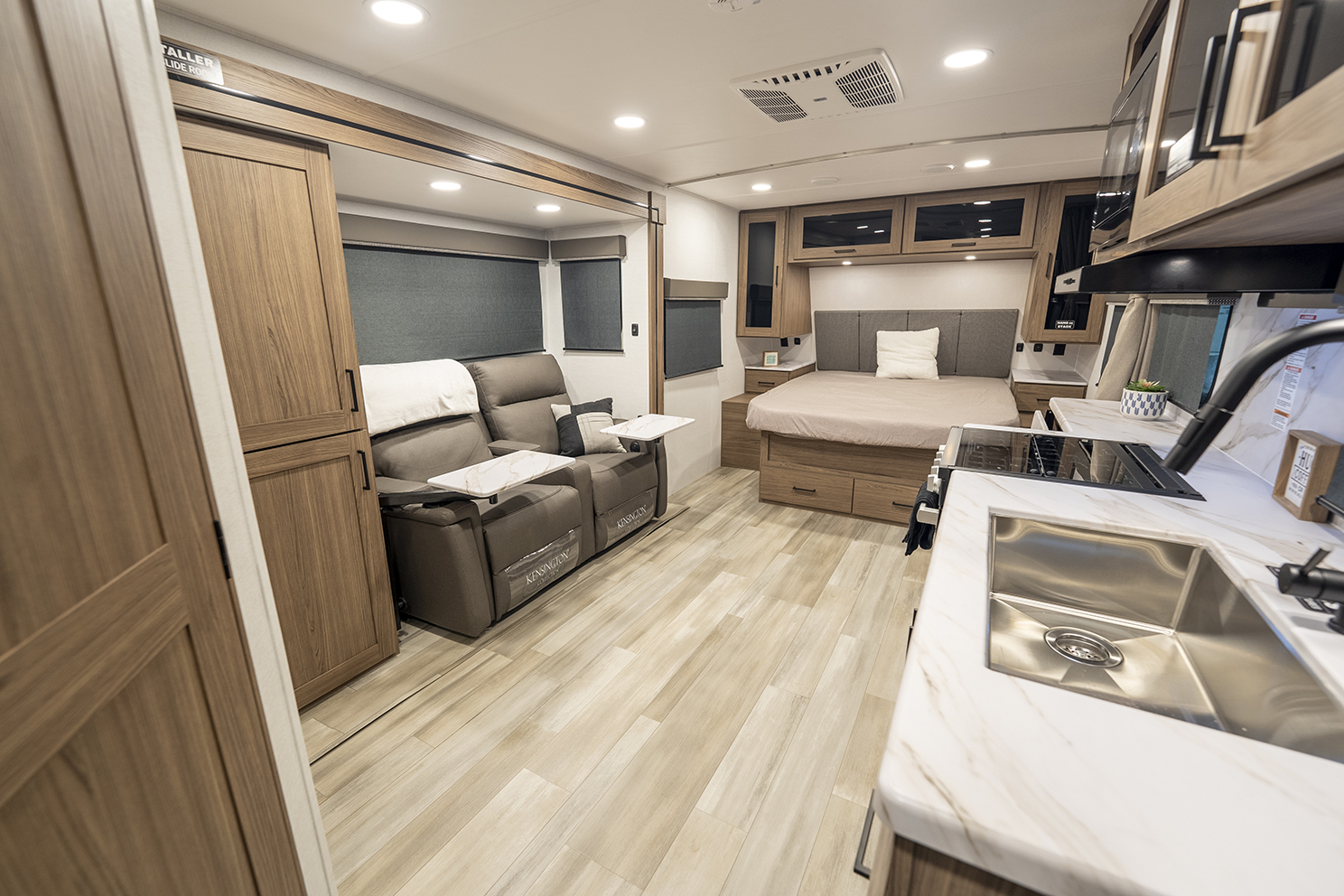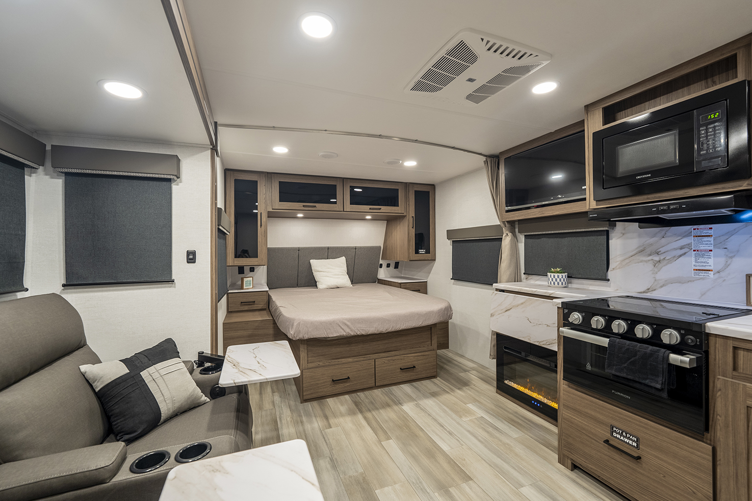 The Alliance RV Delta Ultra Lite travel trailer ML206 is a couple's perfect weekend getaway option with a front queen bed, full bath, and entryway closet for convenience. The theater seat slide and fireplace provide comfort. The kitchen features a pantry, three-burner cooktop, and large sink for easy meal prep and cleanup. The full bath includes a toilet, sink, shower, and linen closet. Storage options include dual wardrobes, nightstands, and overhead storage. Delta Ultra Lite trailers are lightweight with oversized atrium windows, carpet-free interiors, and modern features like magnet catches, soft close doors, and LED accent lighting. Exterior features include pass-through storage, multiple spray ports, awning controls, and Goodyear Endurance tires for a seamless outdoor experience. Start your adventure today with a Delta Ultra Lite travel trailer!
