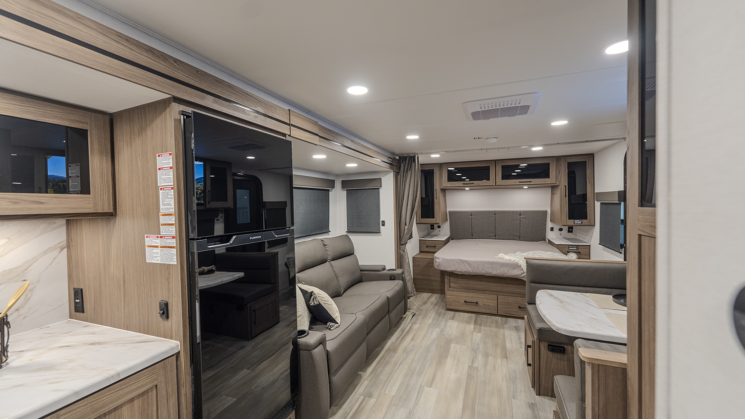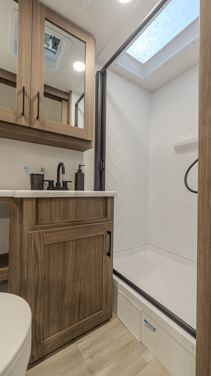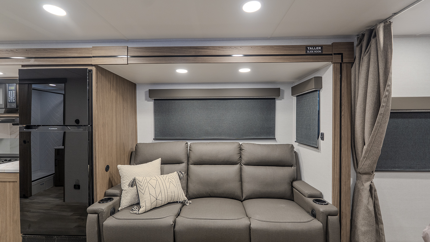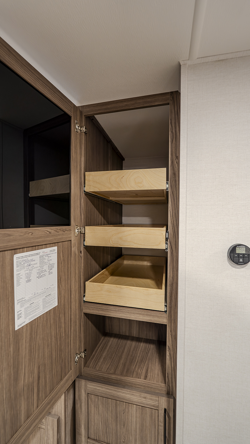 - Functional Kitchen: Equipped with a 10 cu. ft. 12-volt refrigerator, a pull-out pantry, and ample overhead storage for all your cooking essentials.