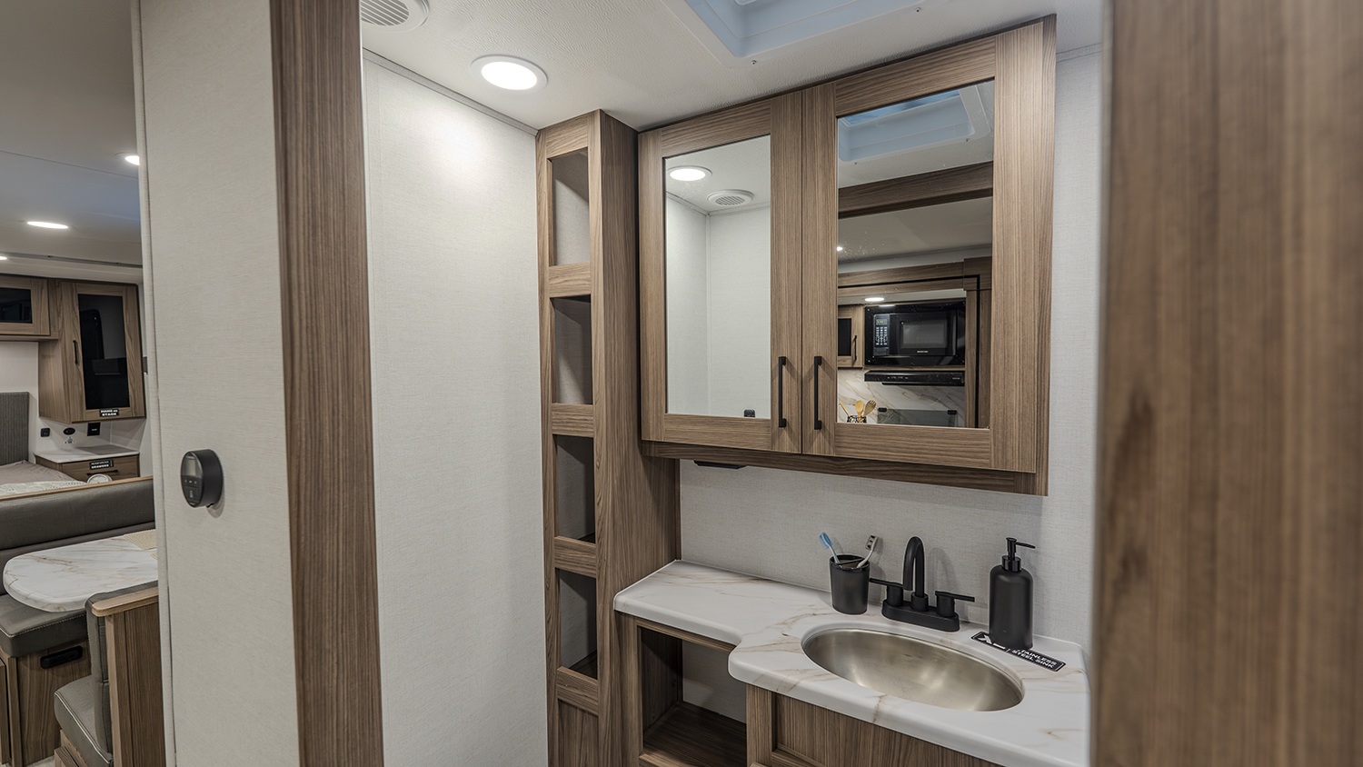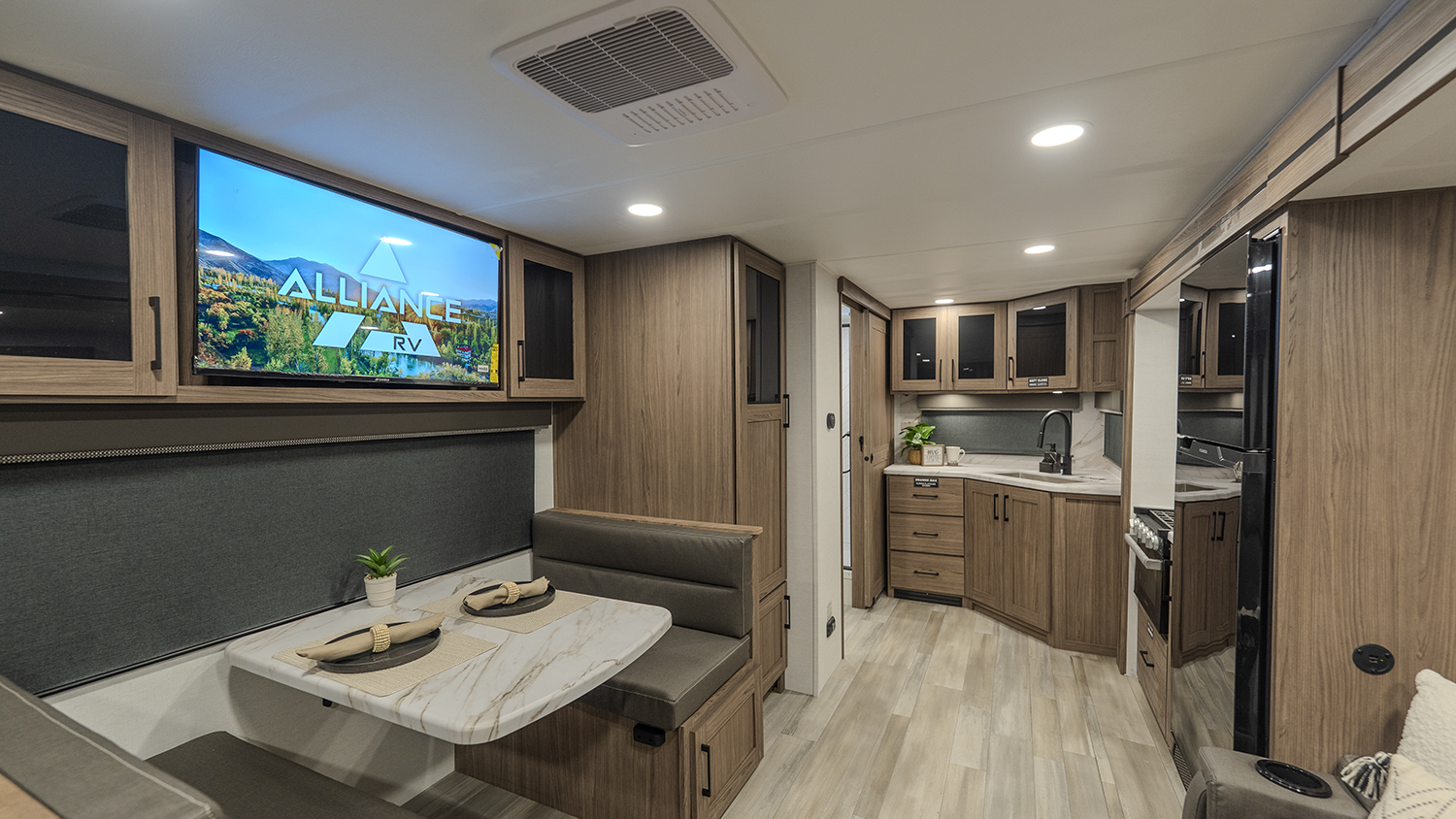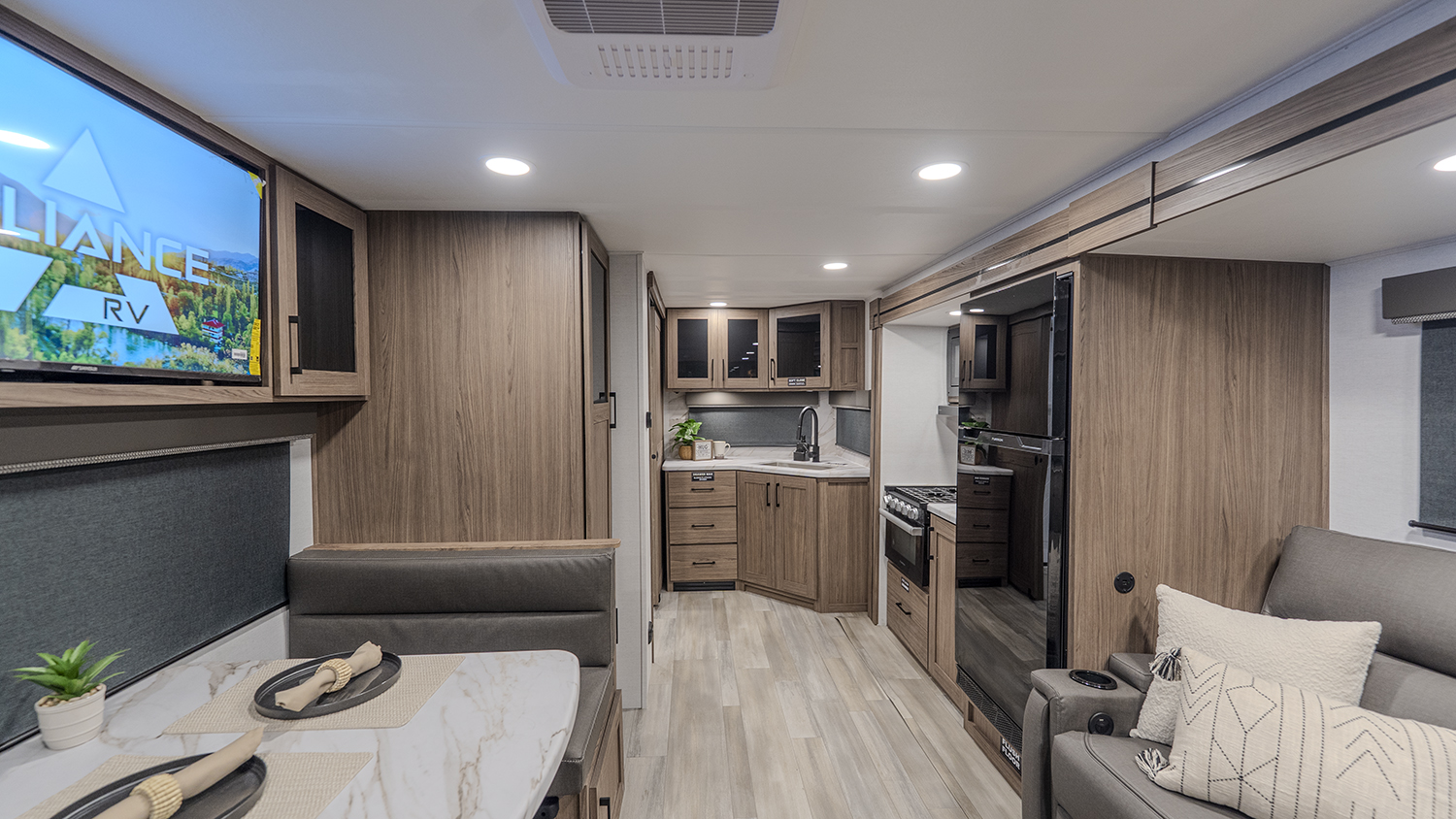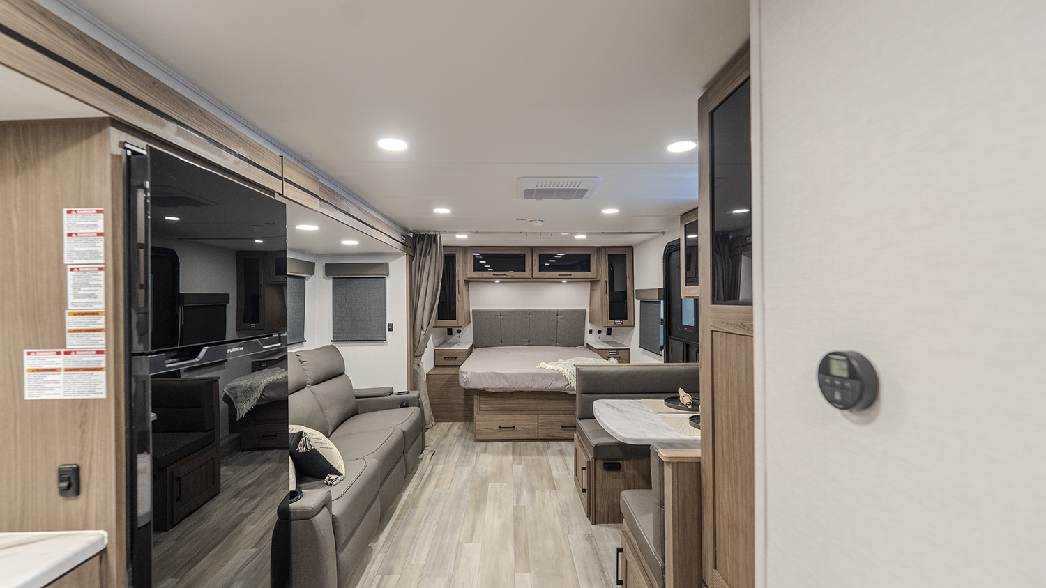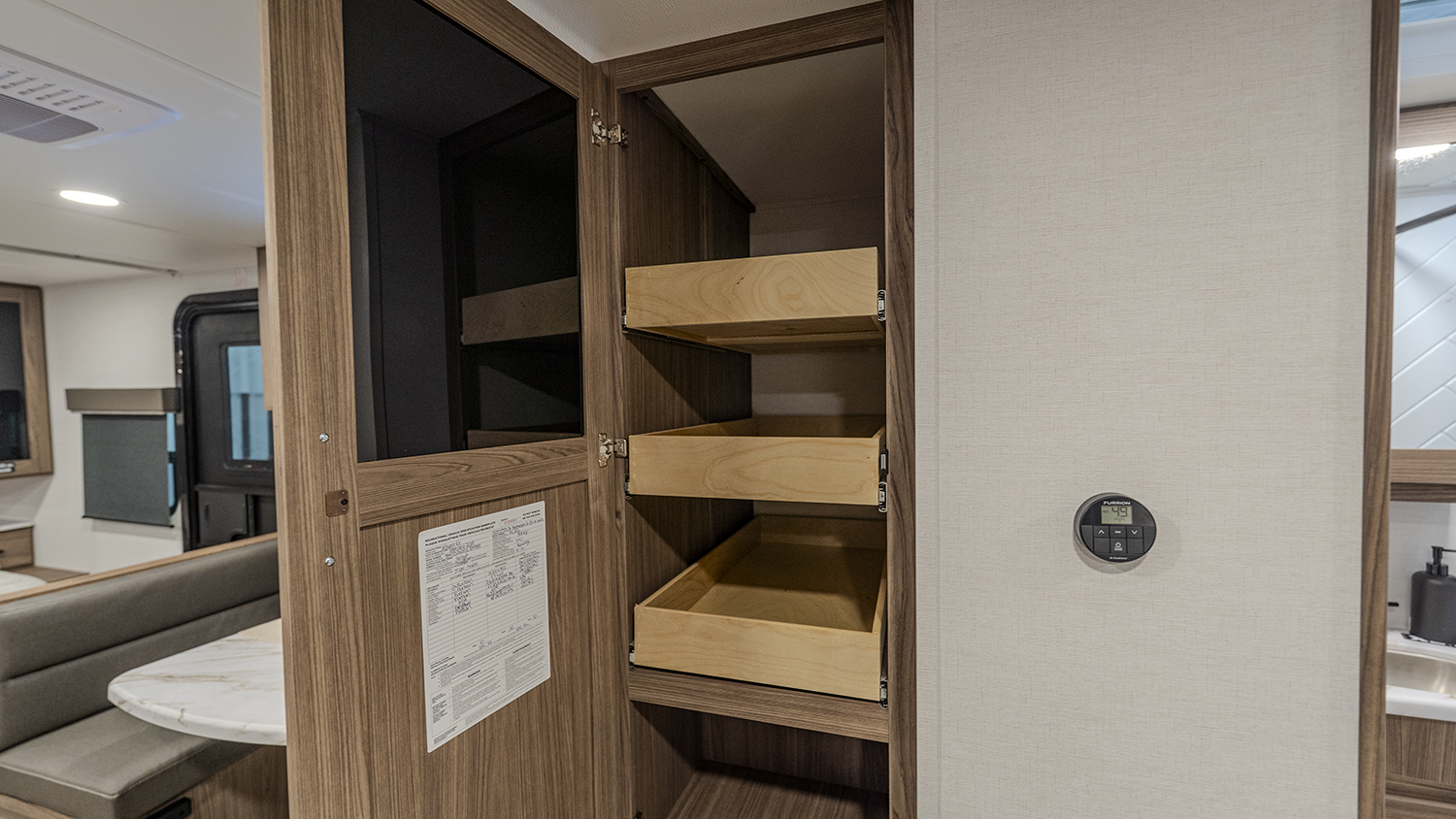 - Functional Kitchen: Equipped with a 10 cu. ft. 12-volt refrigerator, a pull-out pantry, and ample overhead storage for all your cooking essentials.