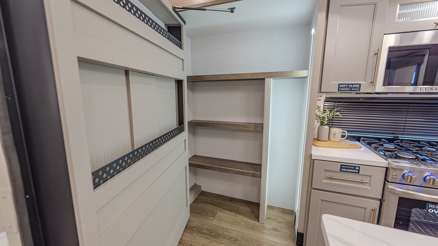 The main living and kitchen area is perfect for cooking, entertaining, and relaxing. It features residential appliances, including a kitchen island with dishwasher prep and a large sink. You’ll also find a pantry for snacks and hidden pantry storage behind the TV for extra convenience. The rear living area includes a dual recliner loveseat and a sleeper sofa along the back wall, offering plenty of seating for relaxation or socializing.