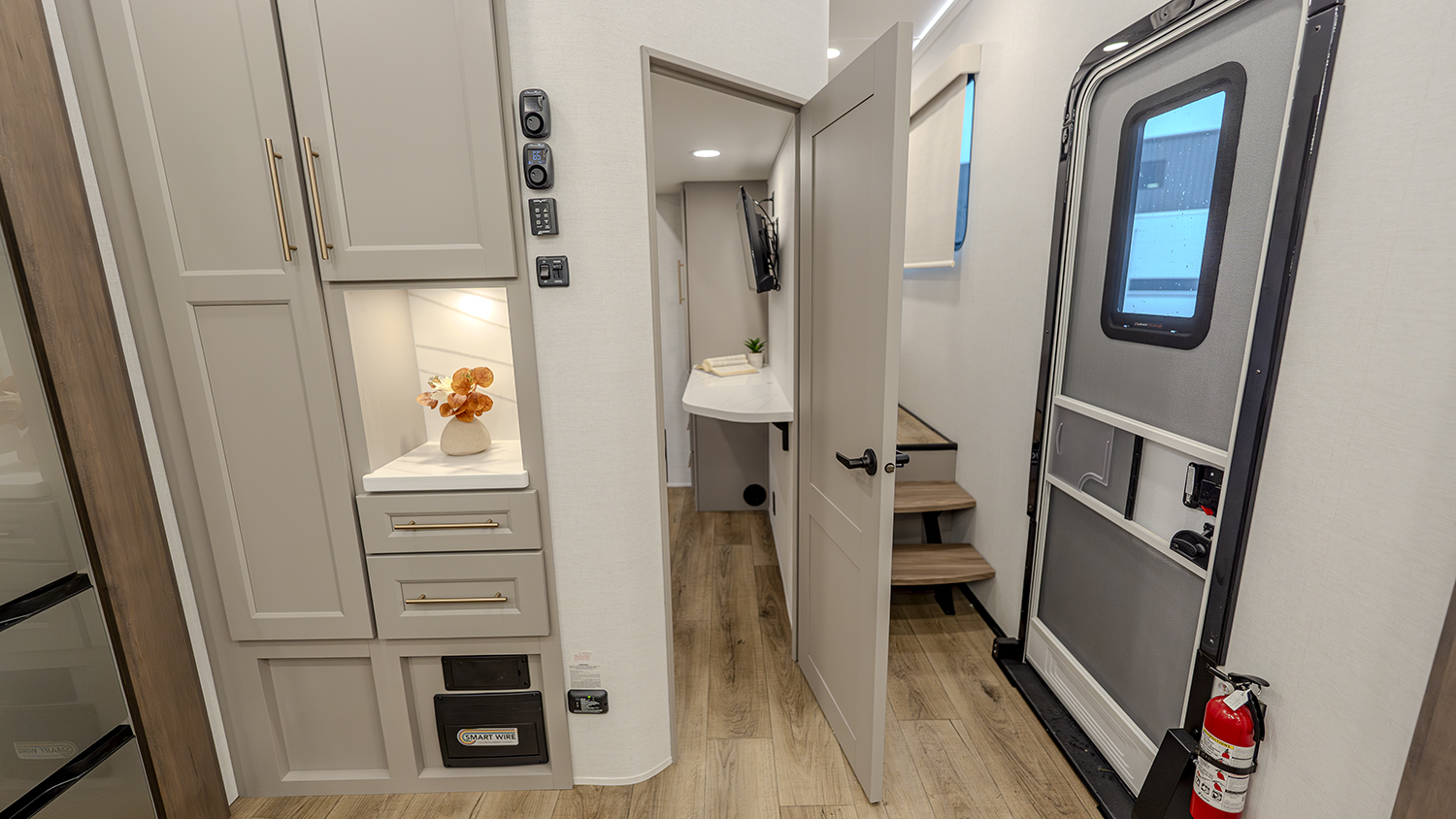 The private master bedroom features a king bed slide-out (with an optional queen bed for more floor space), a large front wardrobe with washer and dryer prep, and a flip-top dresser with a Smart TV above. Double sliding doors lead into the full bathroom, which includes a spacious 48" x 30" shower, toilet, and vanity with sink, and can be accessed from both the hall and the bedroom.