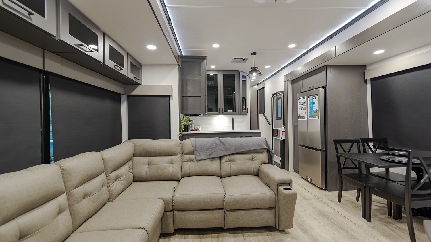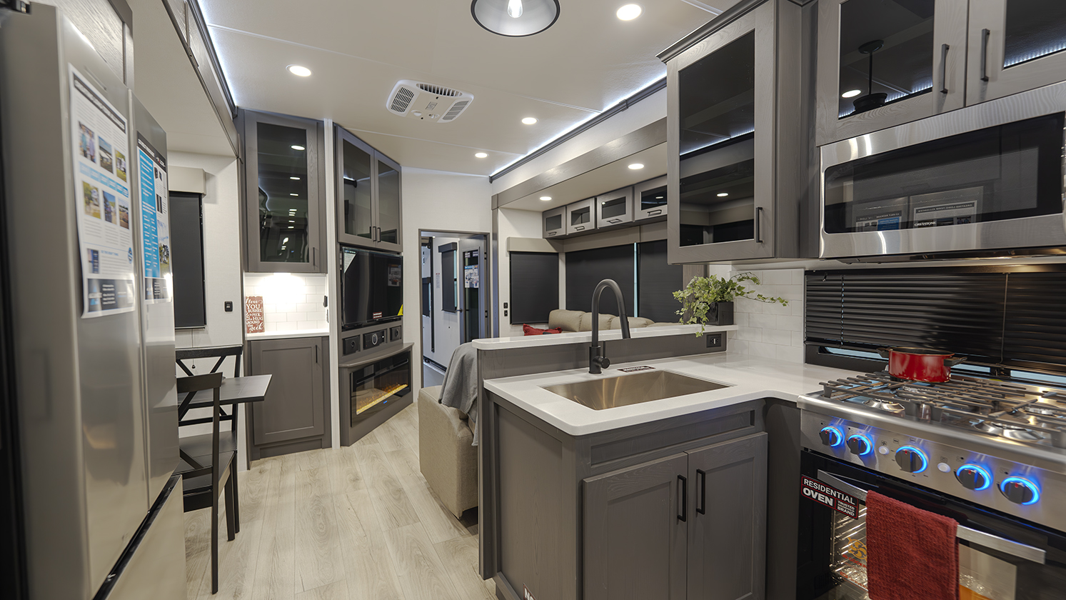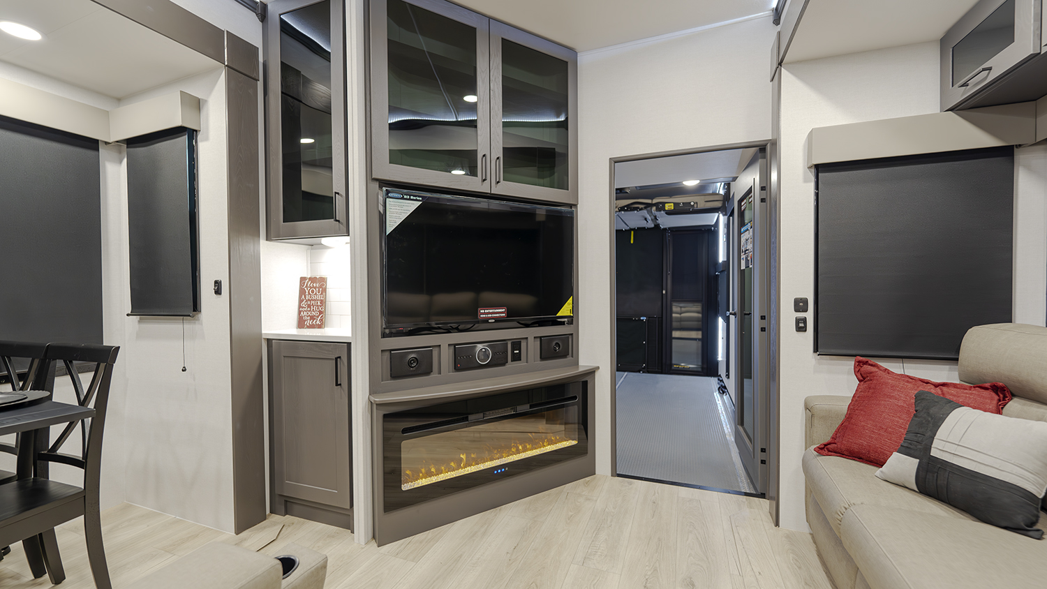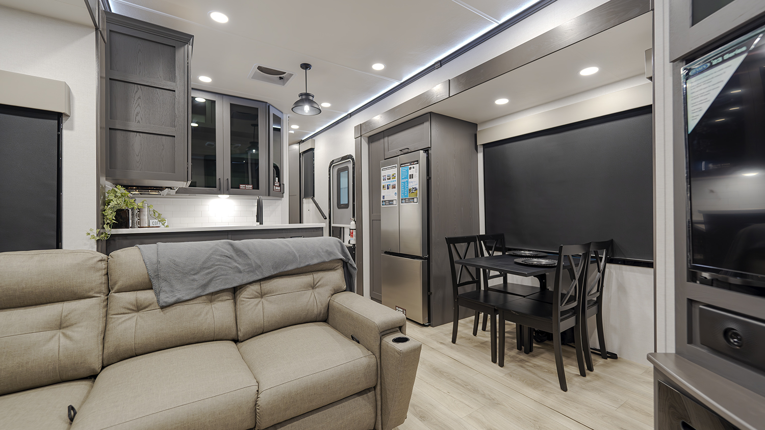 The chef in the family will love the fully equipped kitchen, featuring a three-burner cooktop, a 17 cu. ft. stainless steel 12V refrigerator, a large sink, and ample countertop space for meal prep. The L-shaped sofa slide provides plenty of space for relaxation, while you unwind with the 50" HDTV and fireplace. Enjoy family meals or game nights at the dining table with four chairs, making this the perfect place to gather after a day of adventure.