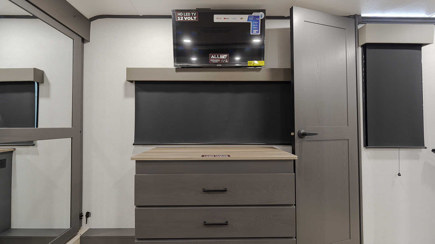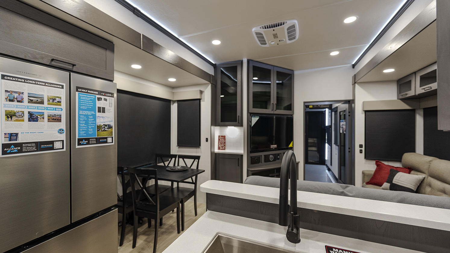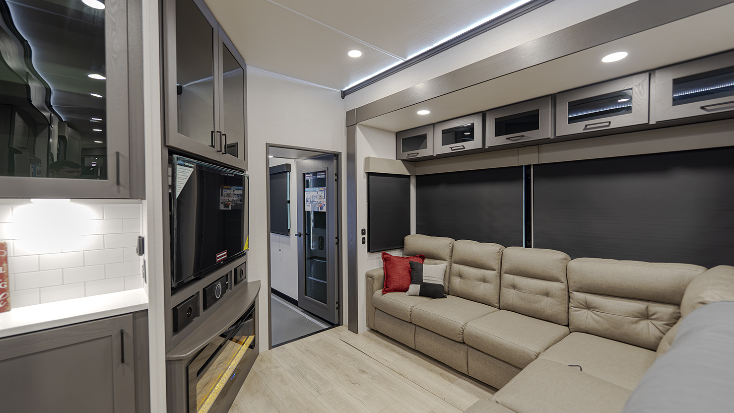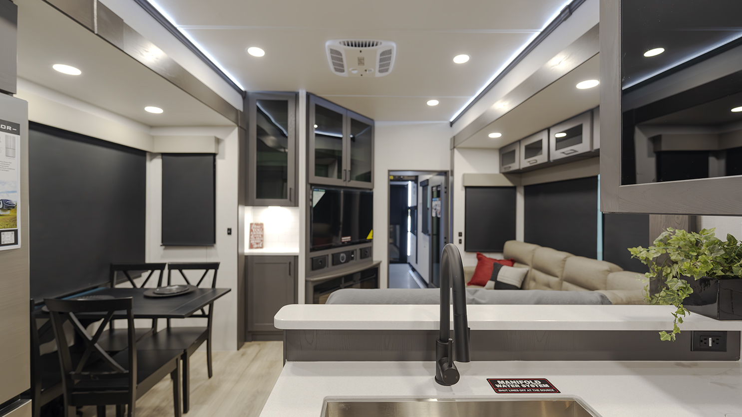 The chef in the family will love the fully equipped kitchen, featuring a three-burner cooktop, a 17 cu. ft. stainless steel 12V refrigerator, a large sink, and ample countertop space for meal prep. The L-shaped sofa slide provides plenty of space for relaxation, while you unwind with the 50" HDTV and fireplace. Enjoy family meals or game nights at the dining table with four chairs, making this the perfect place to gather after a day of adventure.