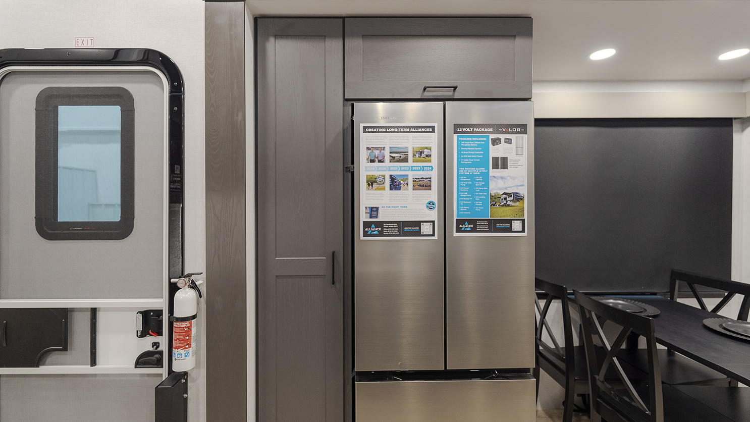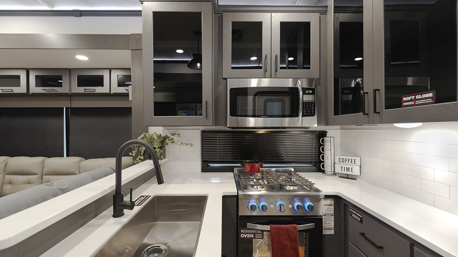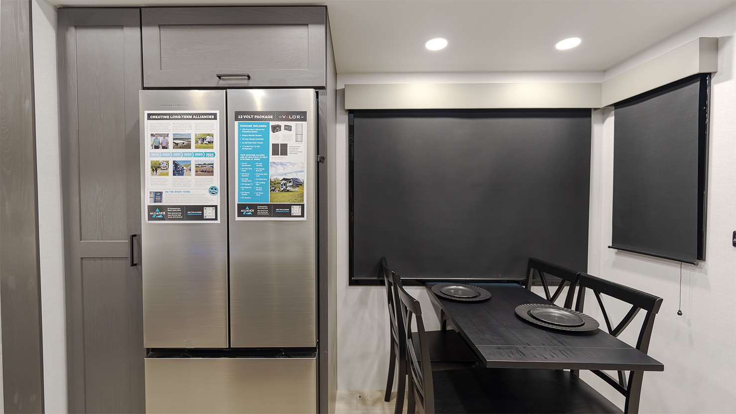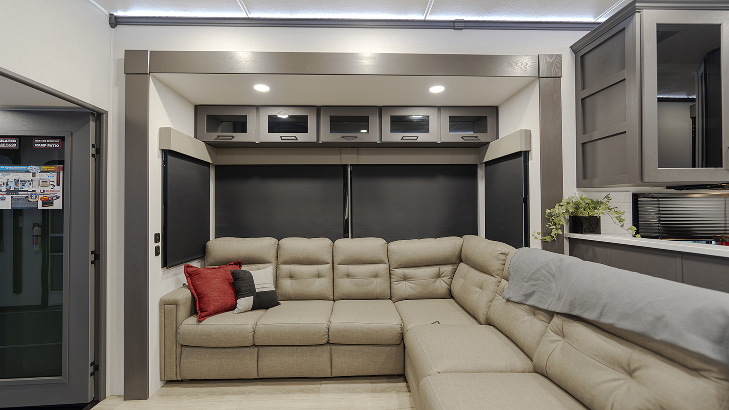 The chef in the family will love the fully equipped kitchen, featuring a three-burner cooktop, a 17 cu. ft. stainless steel 12V refrigerator, a large sink, and ample countertop space for meal prep. The L-shaped sofa slide provides plenty of space for relaxation, while you unwind with the 50" HDTV and fireplace. Enjoy family meals or game nights at the dining table with four chairs, making this the perfect place to gather after a day of adventure.