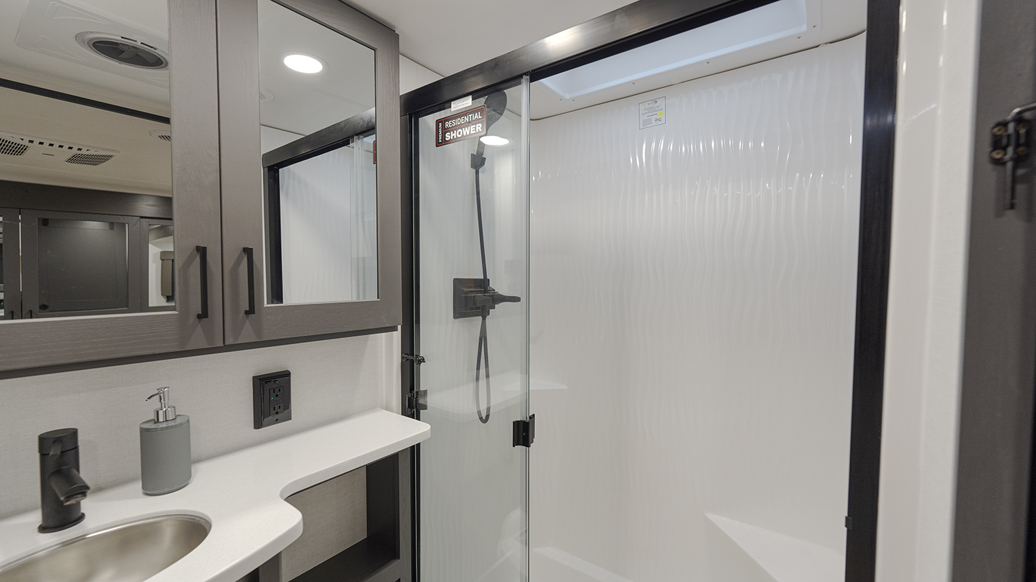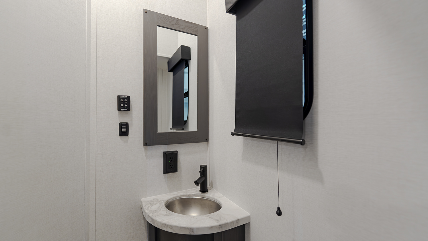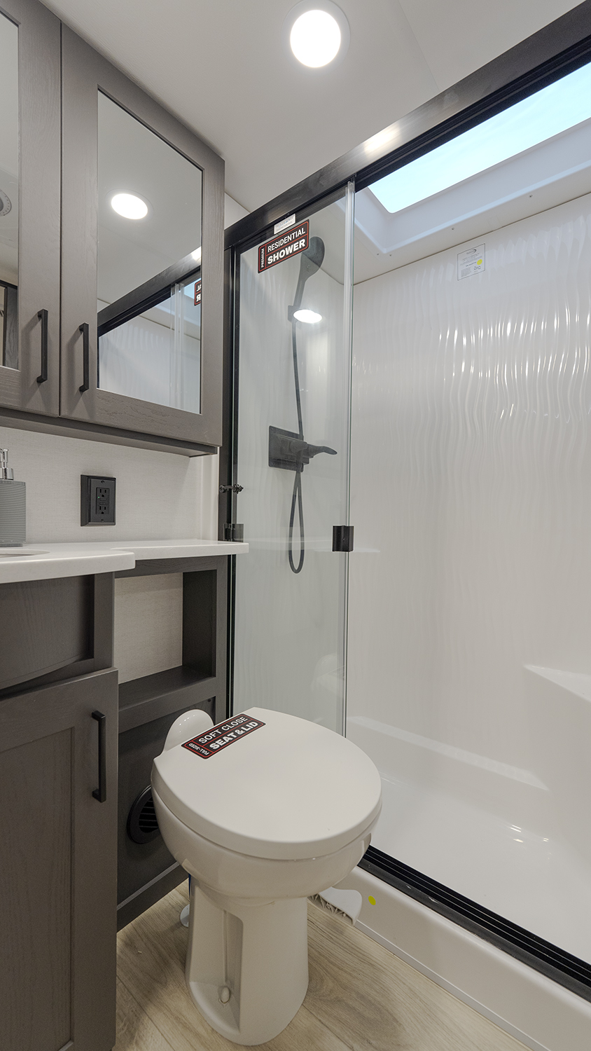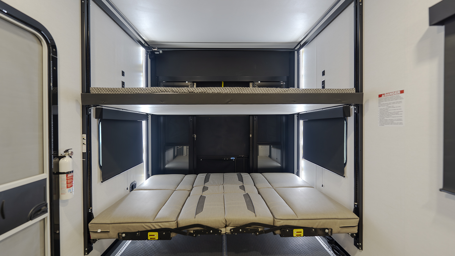 The chef in the family will love the fully equipped kitchen, featuring a three-burner cooktop, a 17 cu. ft. stainless steel 12V refrigerator, a large sink, and ample countertop space for meal prep. The L-shaped sofa slide provides plenty of space for relaxation, while you unwind with the 50" HDTV and fireplace. Enjoy family meals or game nights at the dining table with four chairs, making this the perfect place to gather after a day of adventure.