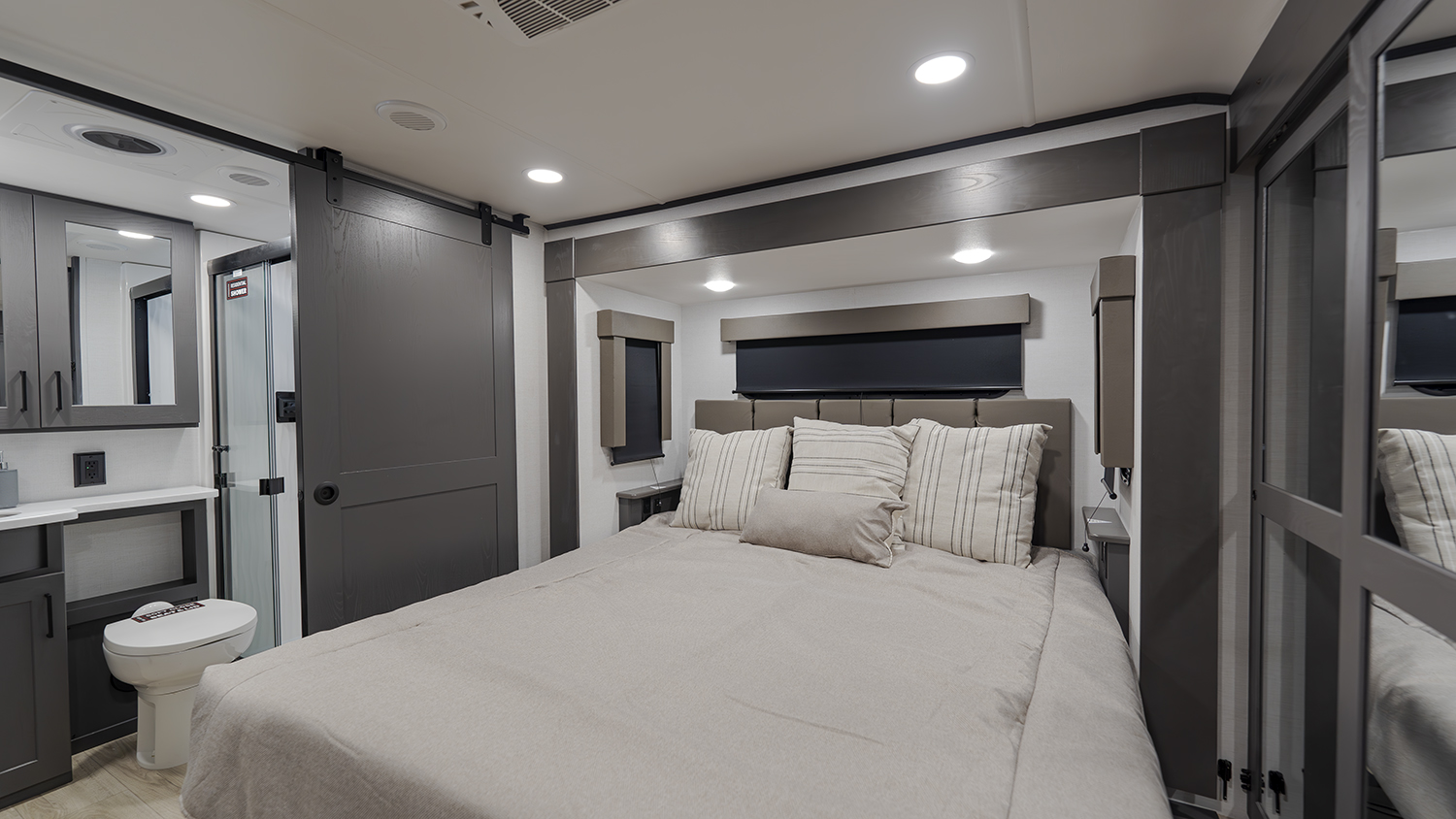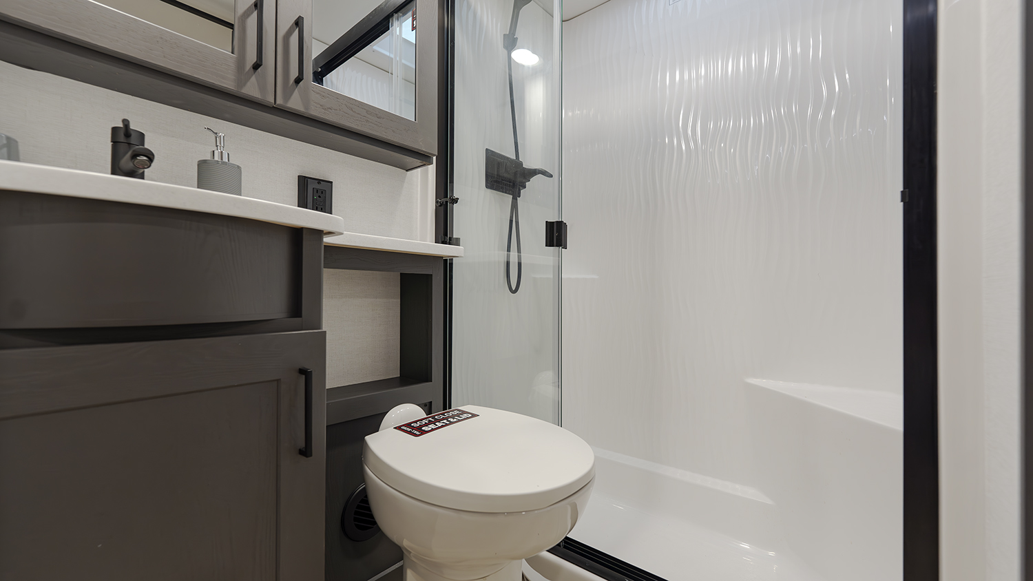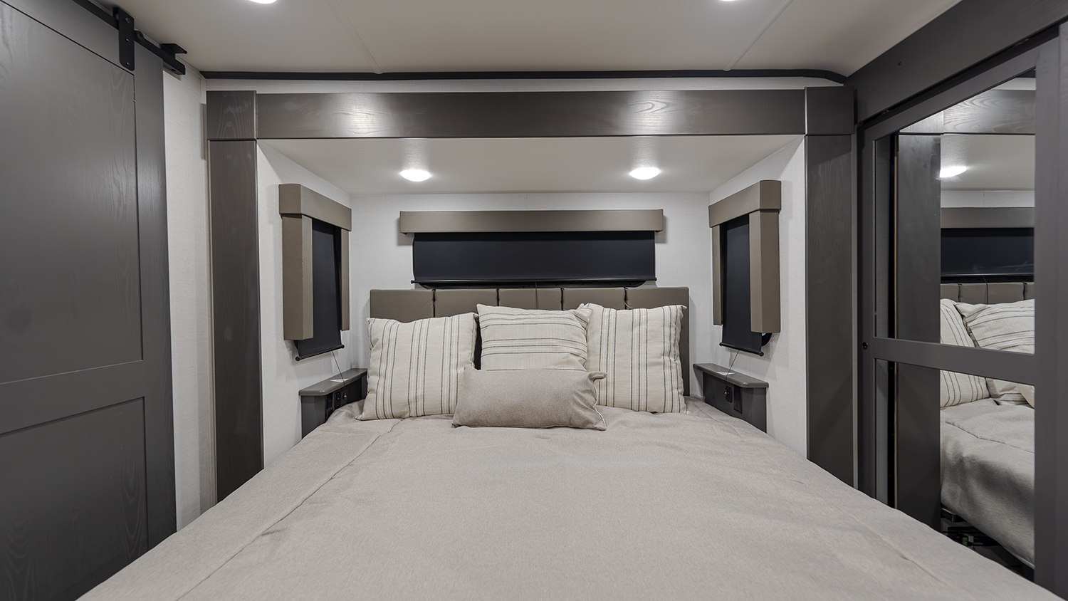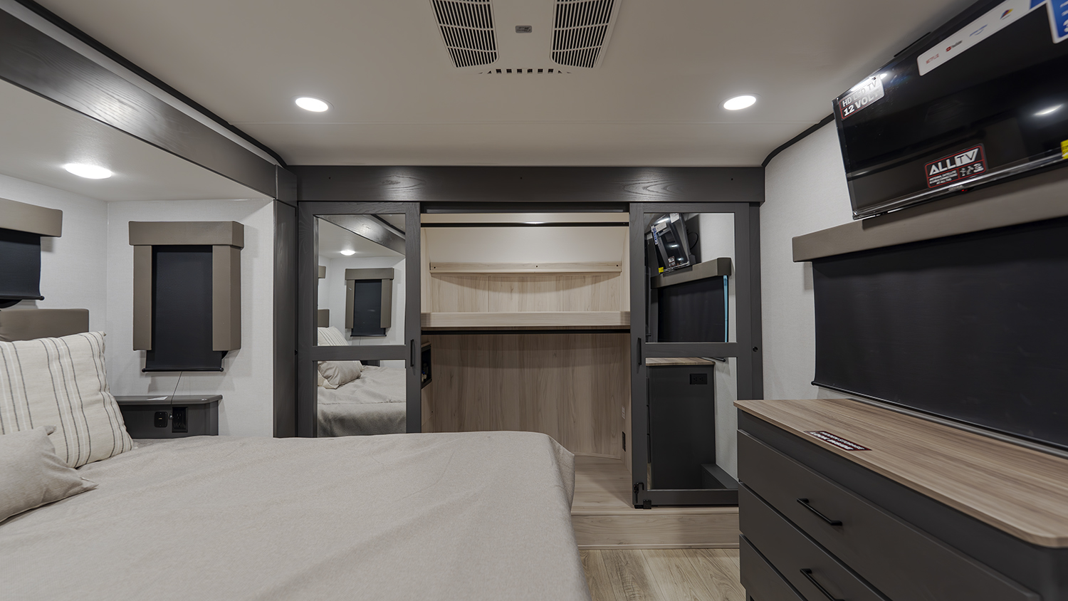 The front private bedroom offers a king bed slide for added space and comfort, plus a flip-top dresser and large front wardrobe that's prepped for a washer/dryer. The dual entry bathroom ensures easy access from both the bedroom and the main living area.