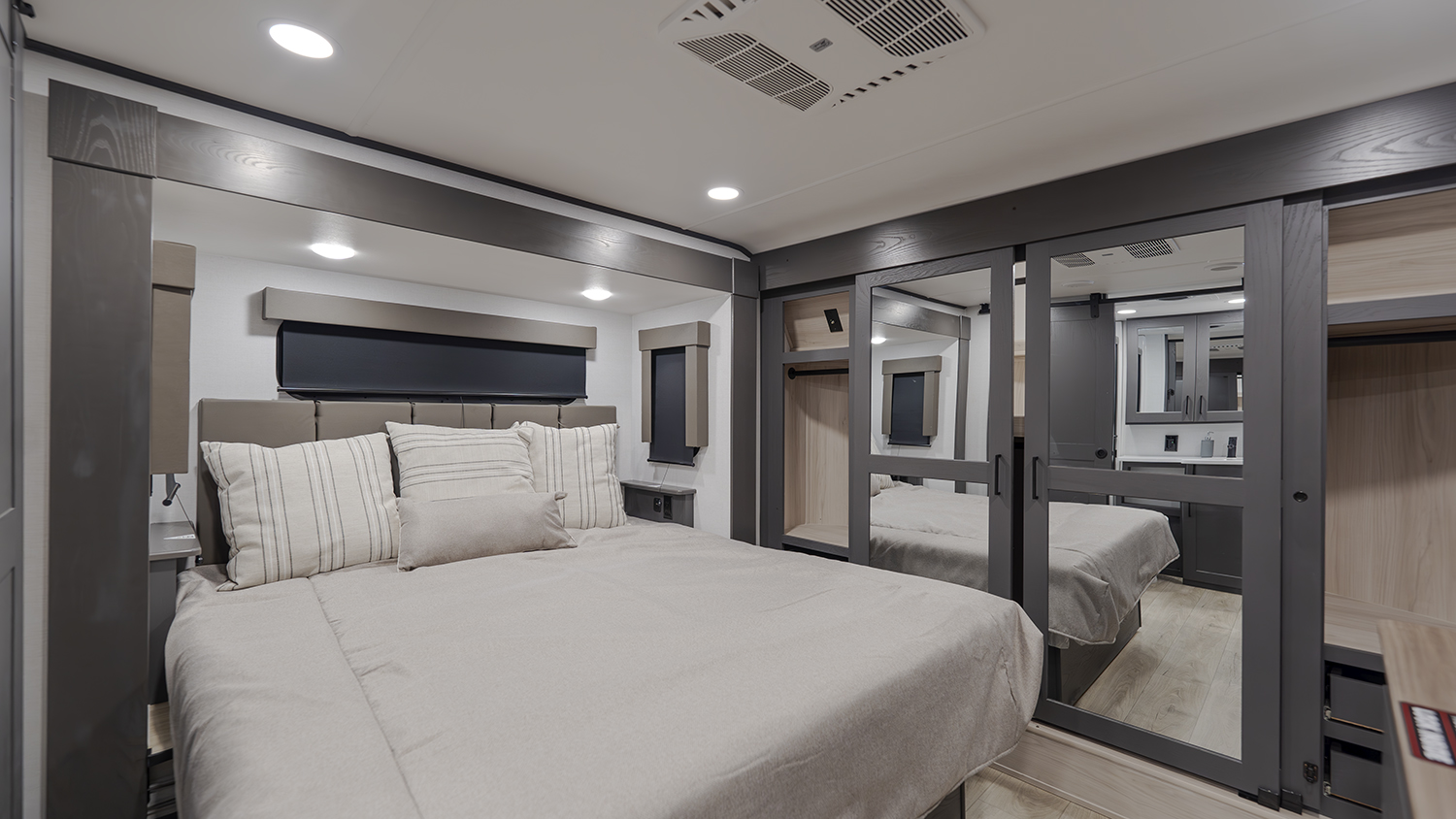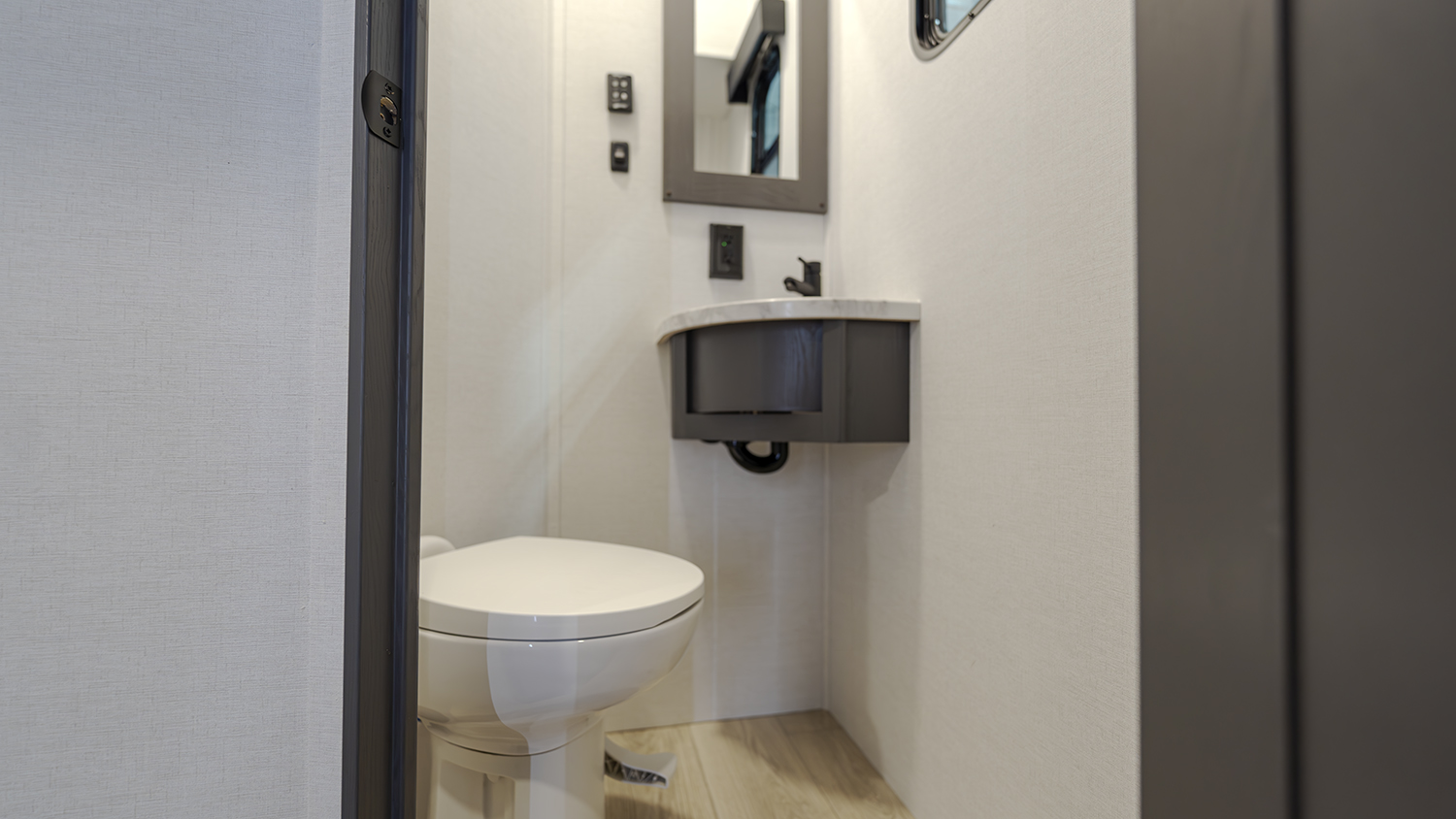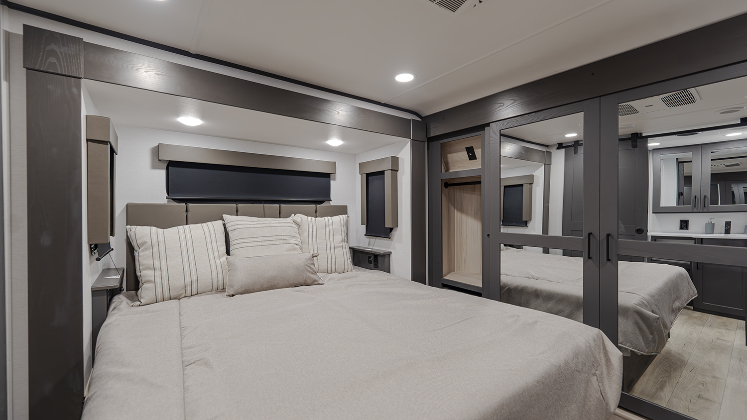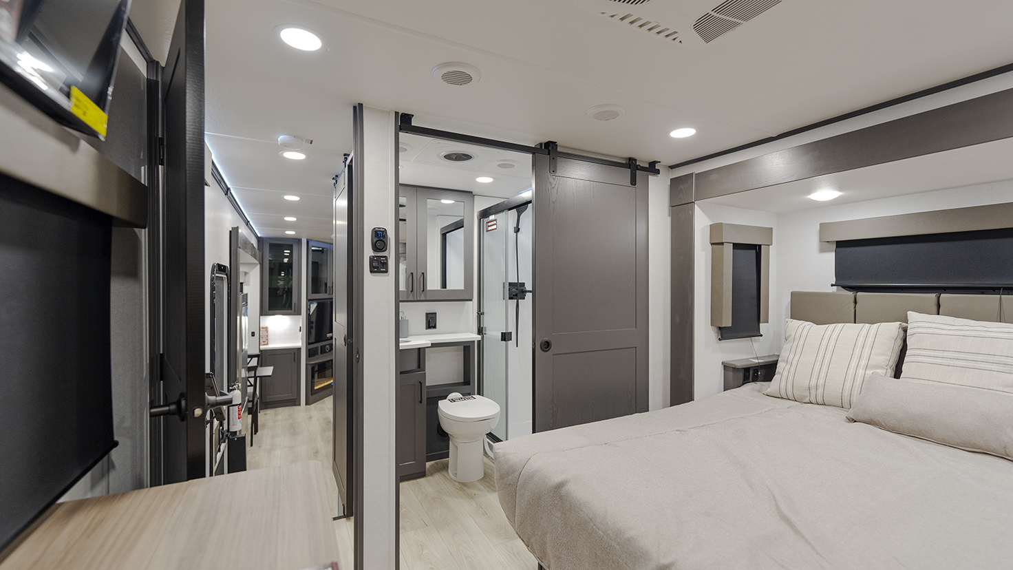 The front private bedroom offers a king bed slide for added space and comfort, plus a flip-top dresser and large front wardrobe that's prepped for a washer/dryer. The dual entry bathroom ensures easy access from both the bedroom and the main living area.