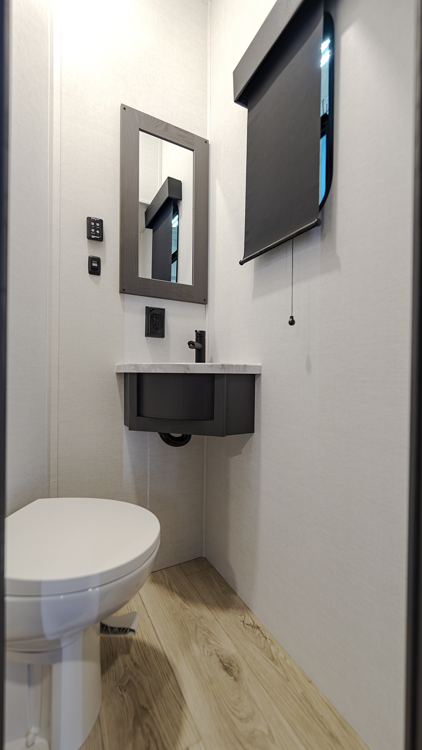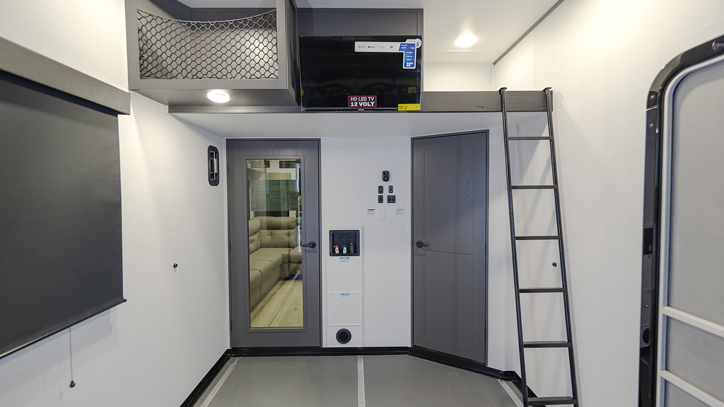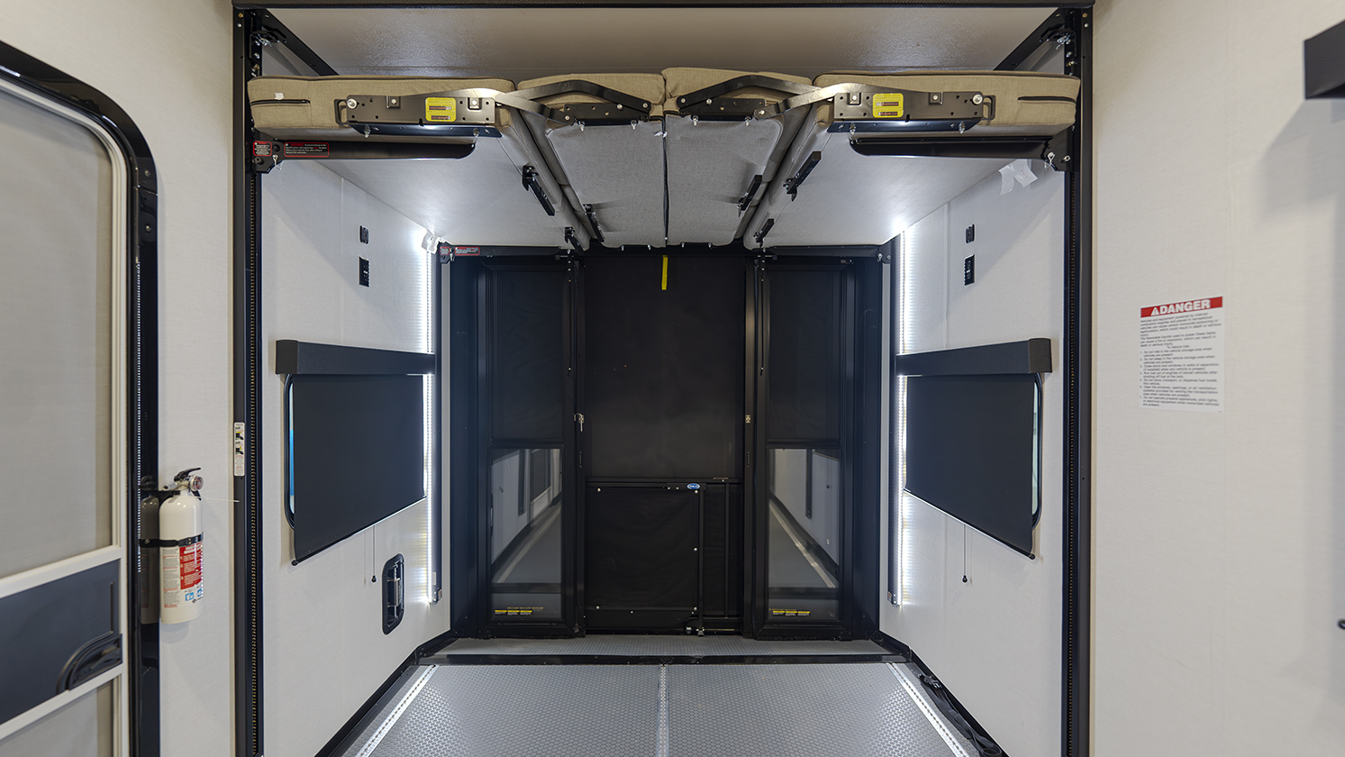 The Valor 44V14 toy hauler is perfect for large groups and families looking for space, comfort, and adventure. With 14' of garage space, you have plenty of room for your toys and gear, plus easy access through the dual entry doors. Once you’ve unloaded, the garage area offers HappiJac roll-over sofas with a drop-down queen bed for extra sleeping, and a loft that opens to the garage for even more room or a fun sleeping nook. The half bath off the garage adds extra convenience, keeping everyone out of the main living area when they need a quick bathroom break.