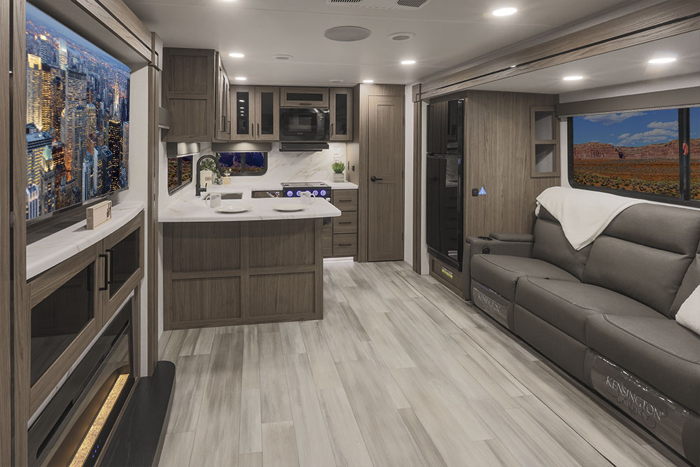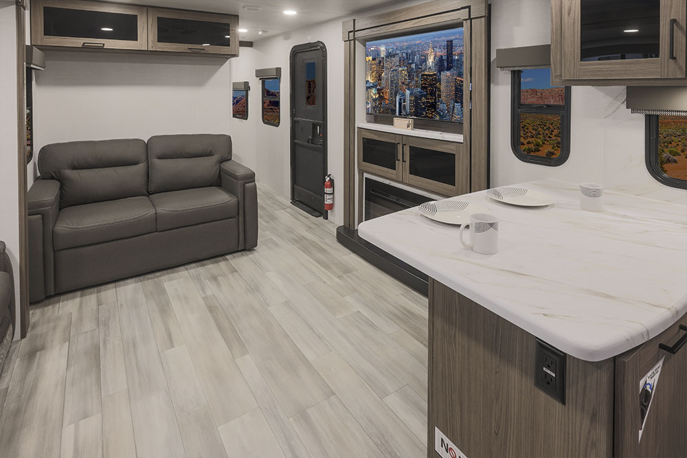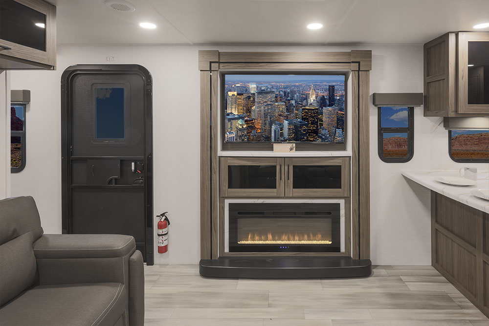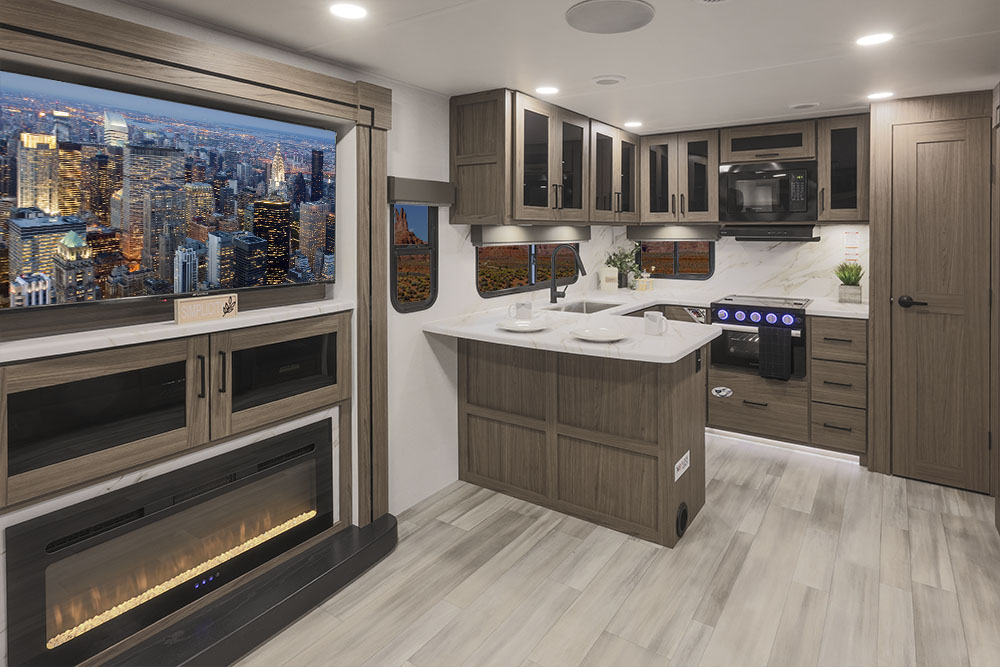 Alliance RV Delta 294RK Travel Trailer, a luxury travel trailer designed to combine comfort, style. Whether you're relaxing indoors, cooking up meals, or enjoying the great outdoors, this trailer is packed with features that make every moment memorable. The rear kitchen is a highlight, equipped with a three-burner cooktop, a 10 cu. ft. 12V refrigerator, and a tip-out trash can for convenience. The kitchen also includes two bar stools for a relaxed dining experience, giving you the space to enjoy meals with ease. For those who love to cook outdoors, the Delta 294RK also comes with an outdoor griddle, allowing you to prepare meals outside. When it's time to enjoy the outdoors, the Delta 294RK has you covered with two awnings and a 32" TV. , this trailer ensures your outdoor living space is just as comfortable as the interior. Inside, the private bedroom, queen bed, wardrobe, and nightstands. The spacious living area features a cozy fireplace and a 50" HDTV, providing the perfect spot to unwind after a day of outdoor fun.