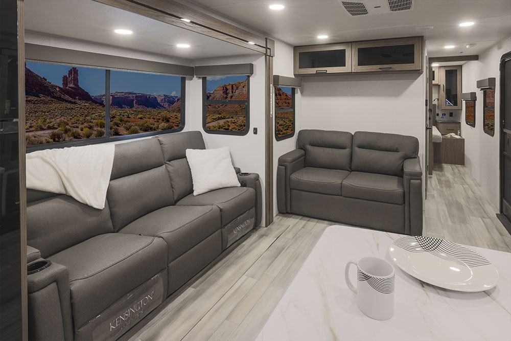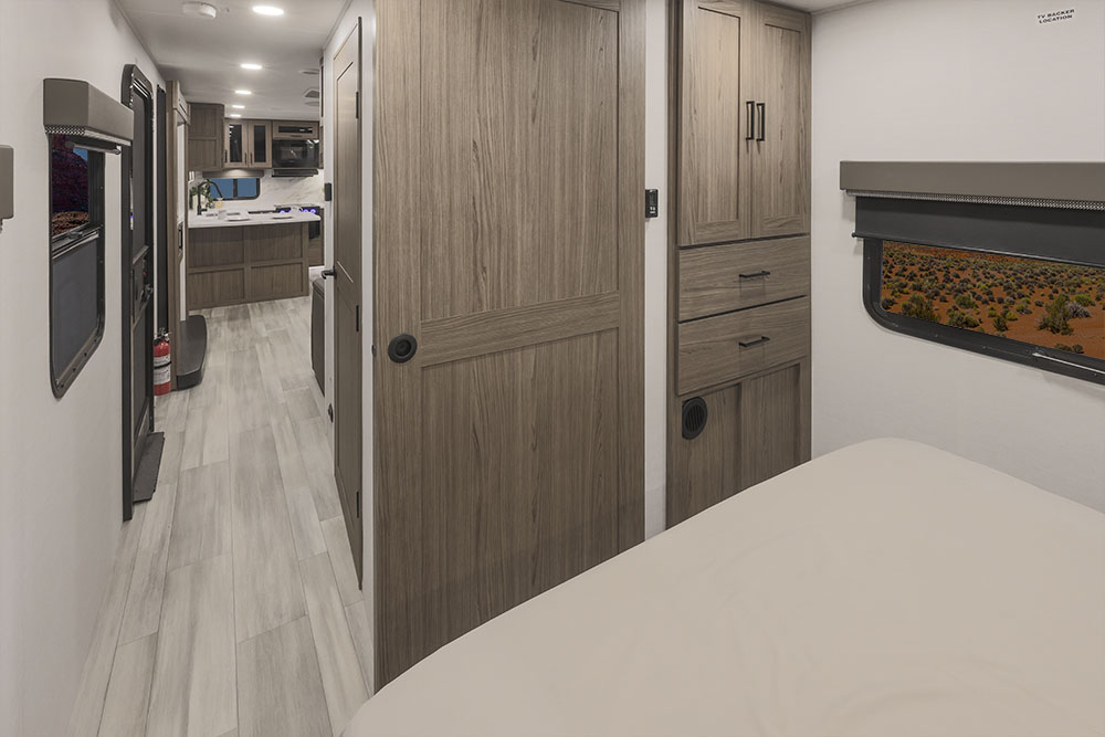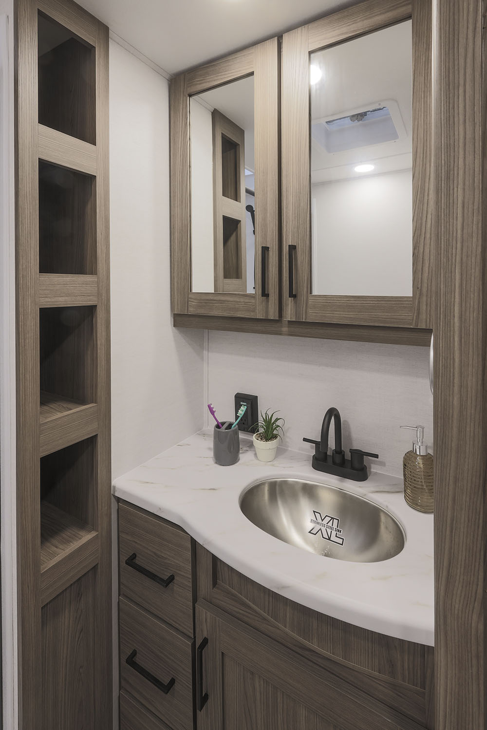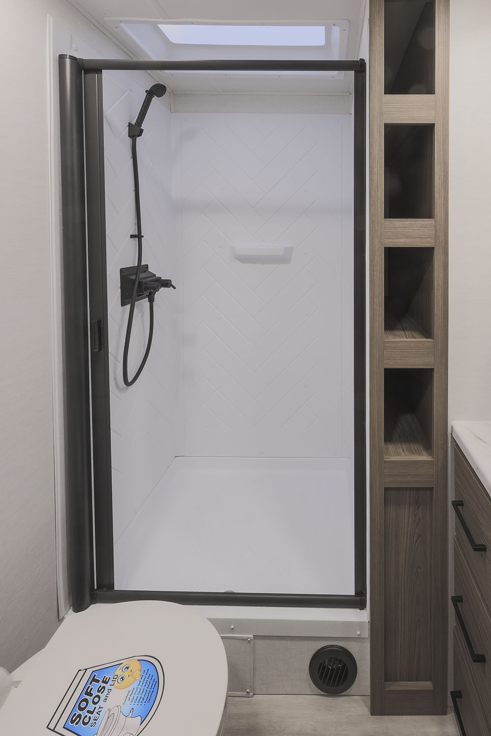 The full bathroom is designed for comfort, featuring a 30" x 36" shower, The Alliance RV Delta 294RK blends luxury with practicality, offering a stylish and functional space for all your camping needs. From the spacious interior to the thoughtful outdoor amenities, it’s the perfect choice for those seeking comfort, convenience, and style on the road.