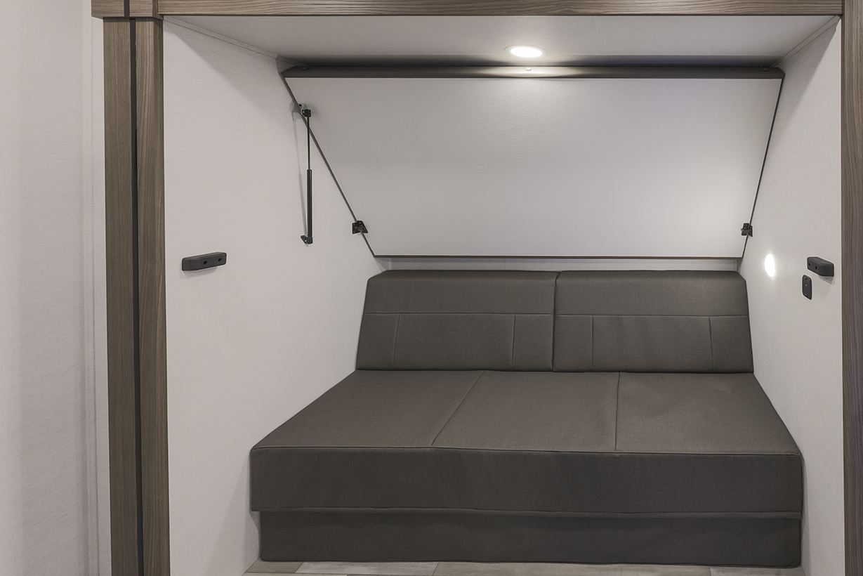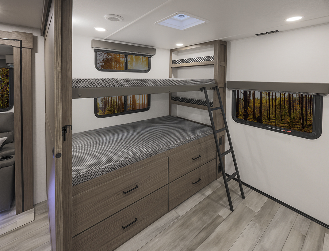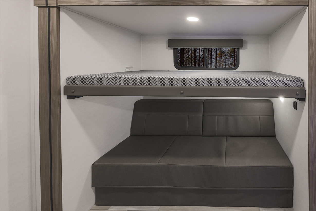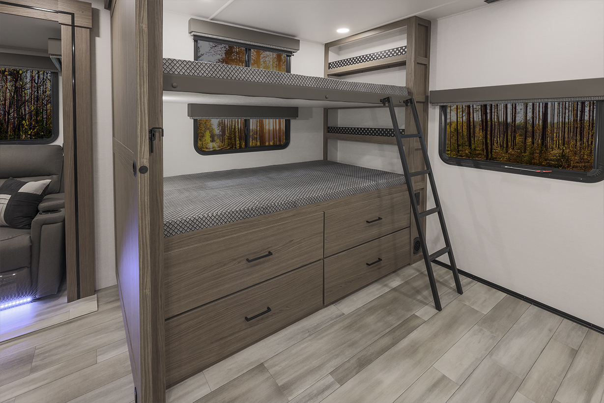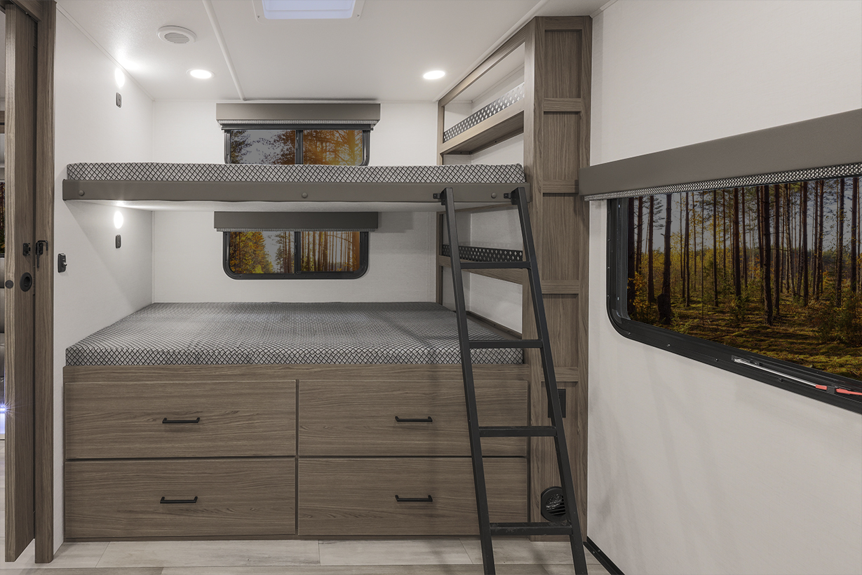 The Alliance RV Delta 321BH travel trailer is designed for families and groups of up to eight people, offering comfort and convenience. It includes a rear private bunkhouse with slide-outs, creating a spacious and comfortable area. The double slides expand the living space, featuring a U-shaped kitchen with counter space and storage. The full bathroom includes a shower and amenities for convenience. A private front bedroom. Outdoor features include an included griddle and folding camping table. The trailer is built for durability with a walk-on roof and enclosed underbelly for all-season protection. Spacious storage is available with 62 cu. ft. of pass-through storage. Interior comforts include vinyl flooring, atrium windows for natural light, Bluetooth speaker, and USB charging ports throughout. The trailer offers modern conveniences and plenty of space for outdoor adventures.