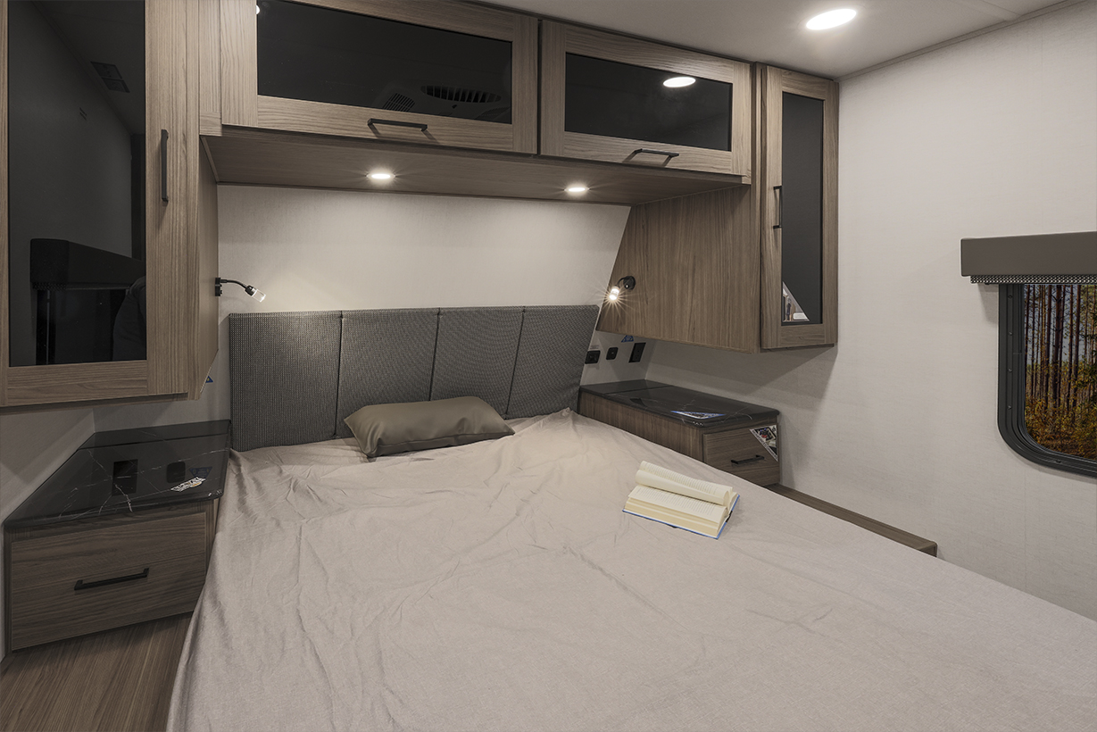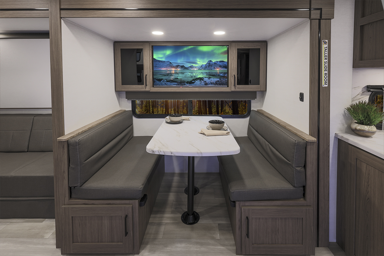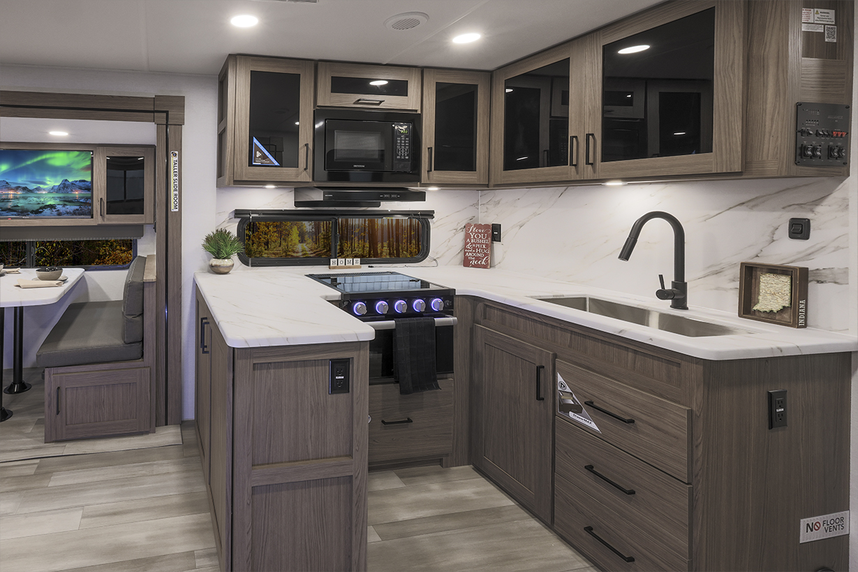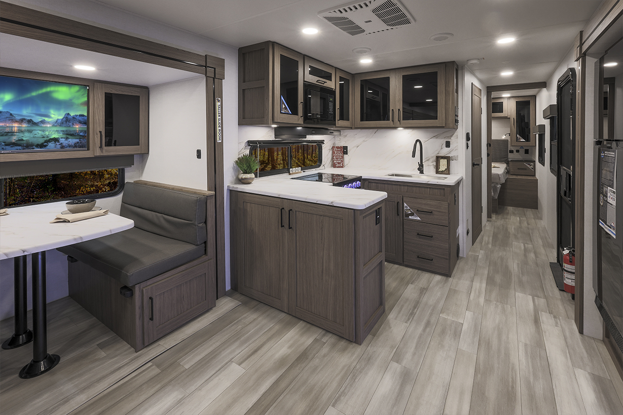 The Alliance RV Delta 321BH travel trailer is designed for families and groups of up to eight people, offering comfort and convenience. It includes a rear private bunkhouse with slide-outs, creating a spacious and comfortable area. The double slides expand the living space, featuring a U-shaped kitchen with counter space and storage. The full bathroom includes a shower and amenities for convenience. A private front bedroom. Outdoor features include an included griddle and folding camping table. The trailer is built for durability with a walk-on roof and enclosed underbelly for all-season protection. Spacious storage is available with 62 cu. ft. of pass-through storage. Interior comforts include vinyl flooring, atrium windows for natural light, Bluetooth speaker, and USB charging ports throughout. The trailer offers modern conveniences and plenty of space for outdoor adventures.