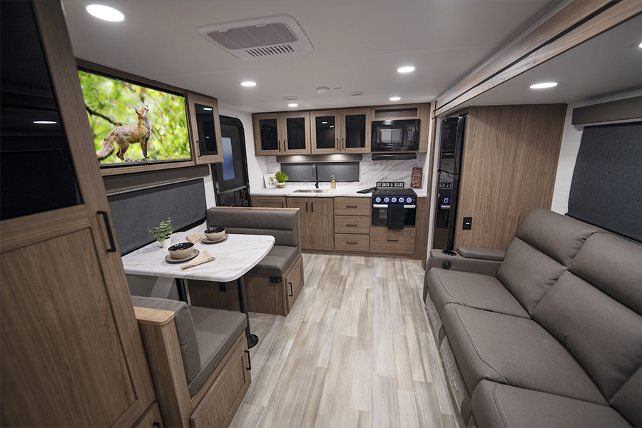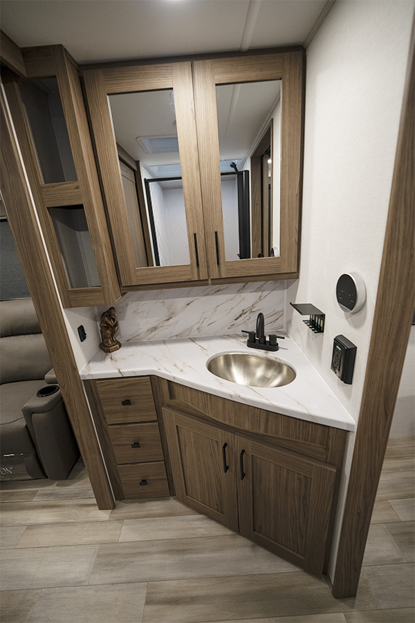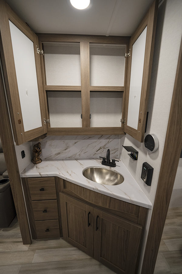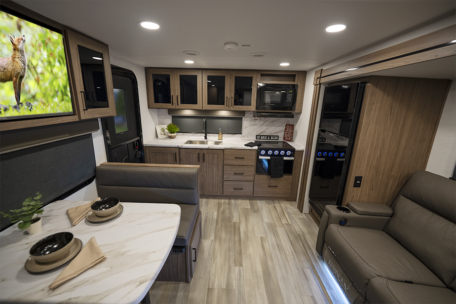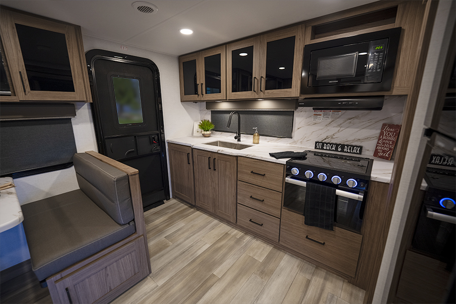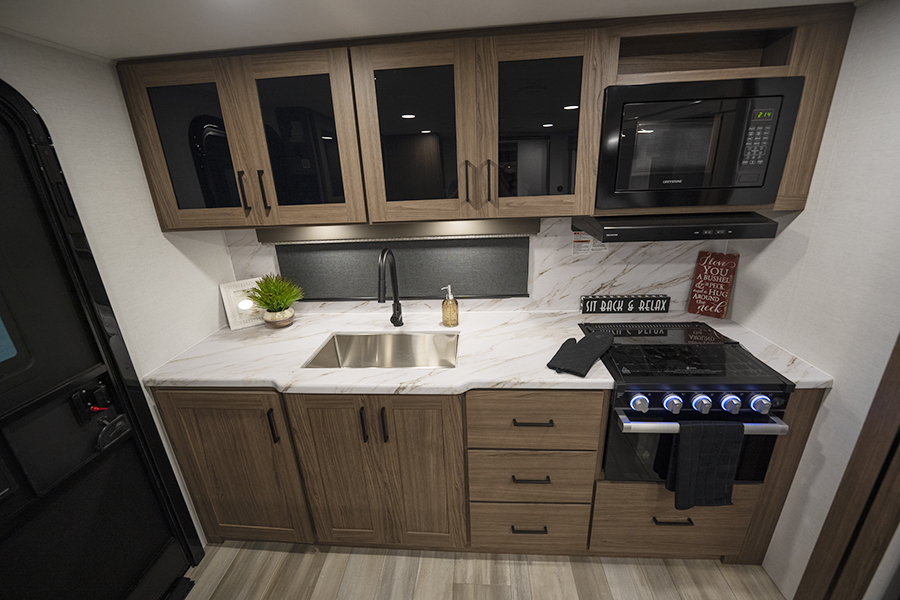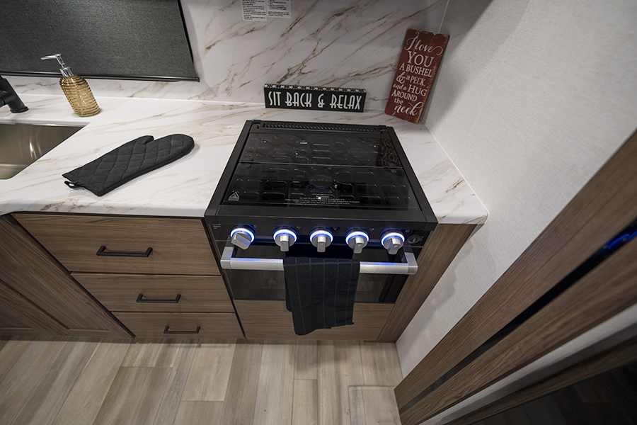 - Rear Kitchen Design: The thoughtfully designed rear kitchen includes upper cabinets for ample storage, a three-burner cooktop, and a large pantry to keep your essentials organized. The 10 cu. ft. 12-volt refrigerator ensures plenty of space to store fresh food during your travels.