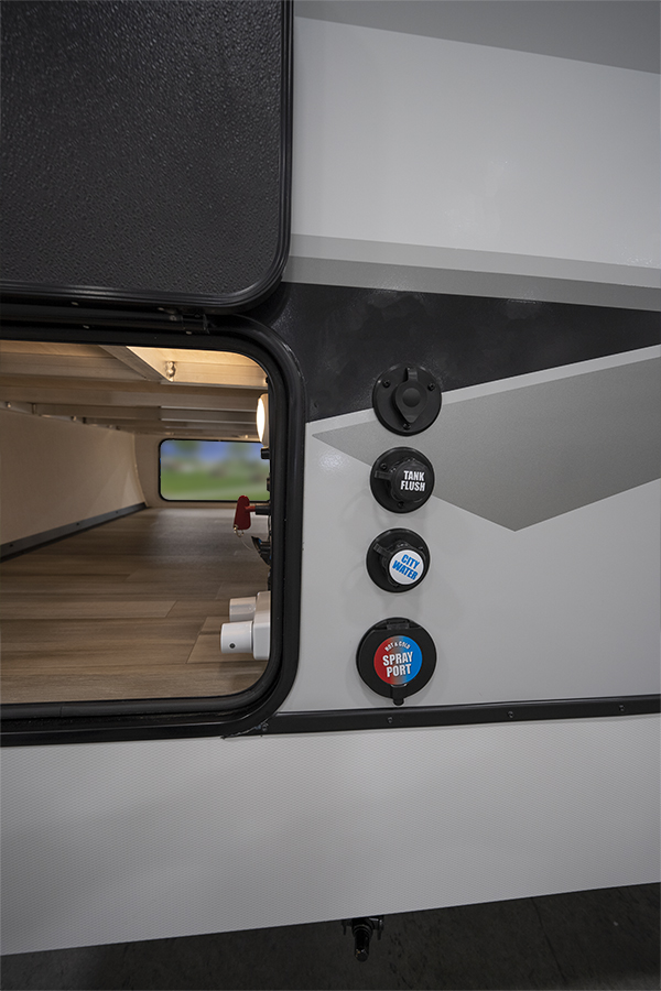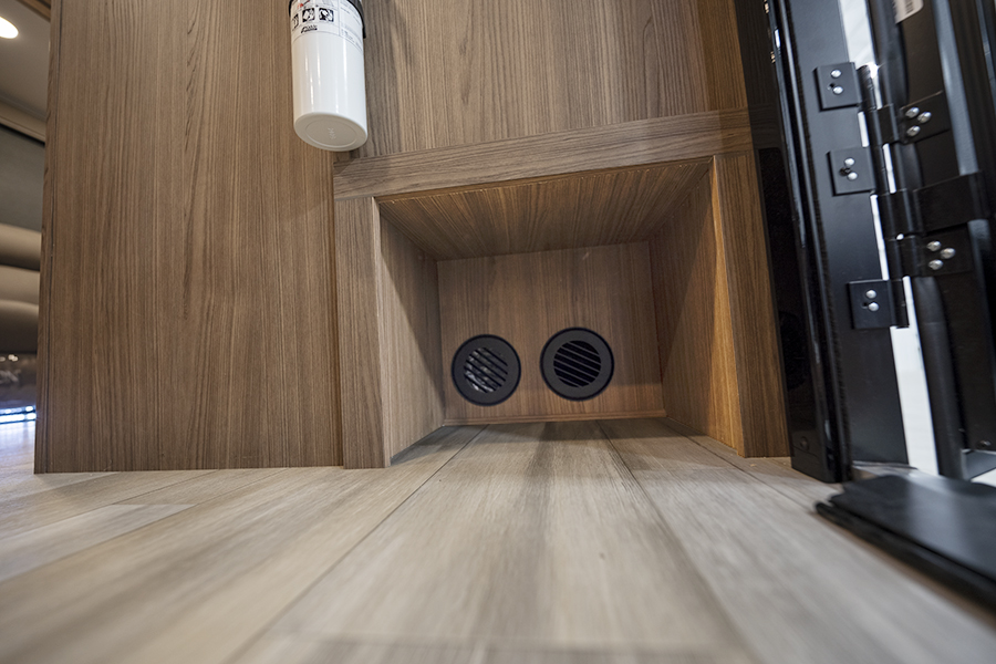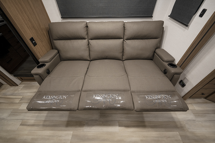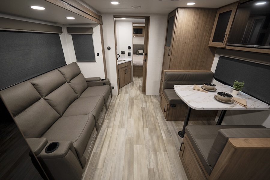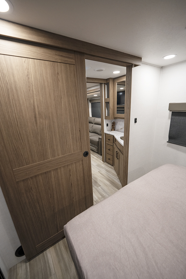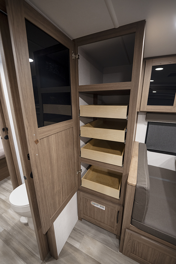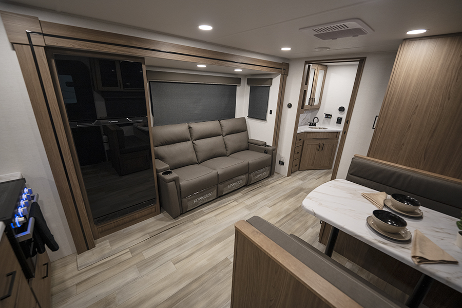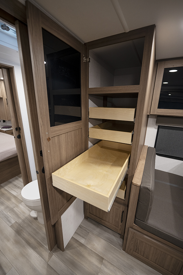 - Rear Kitchen Design: The thoughtfully designed rear kitchen includes upper cabinets for ample storage, a three-burner cooktop, and a large pantry to keep your essentials organized. The 10 cu. ft. 12-volt refrigerator ensures plenty of space to store fresh food during your travels.