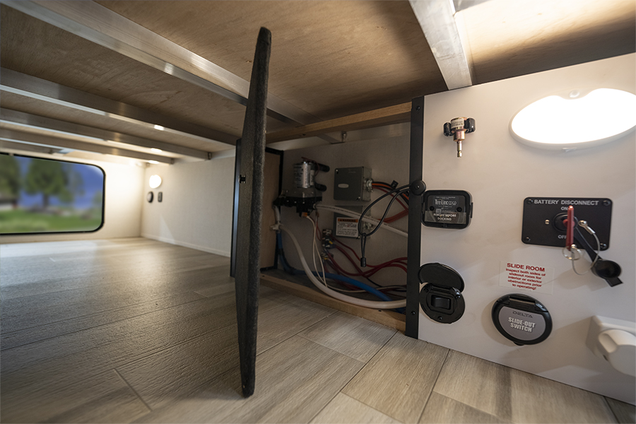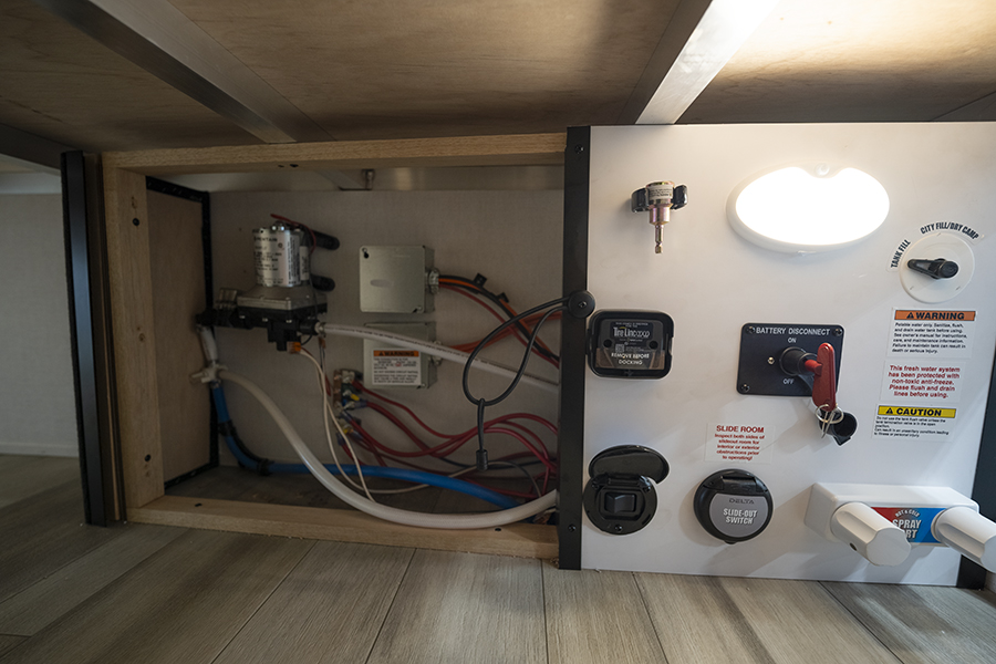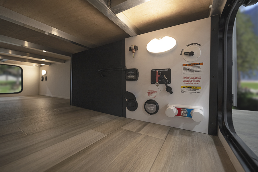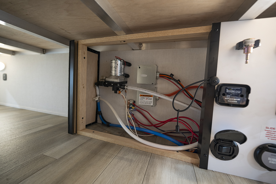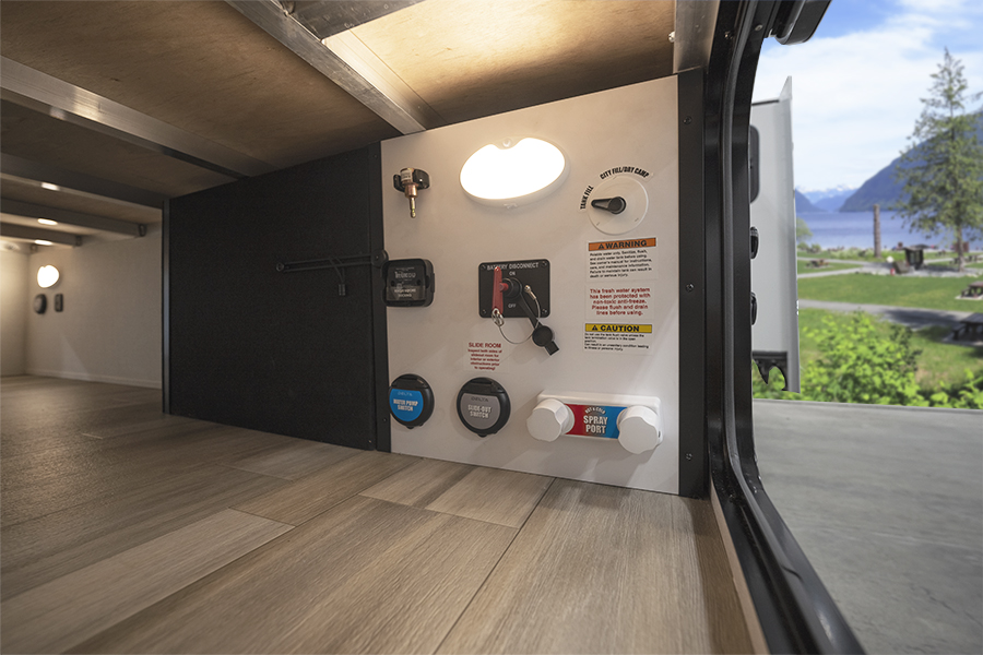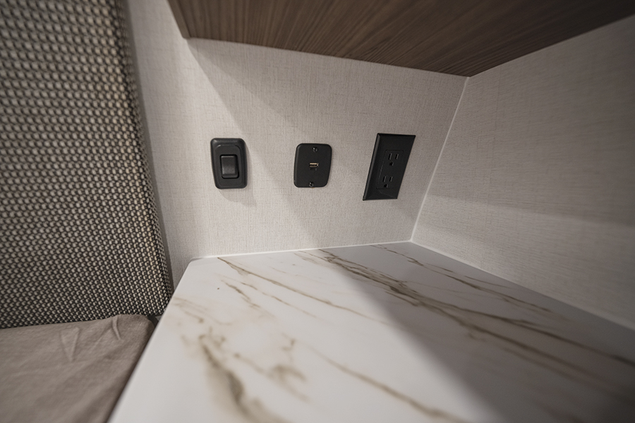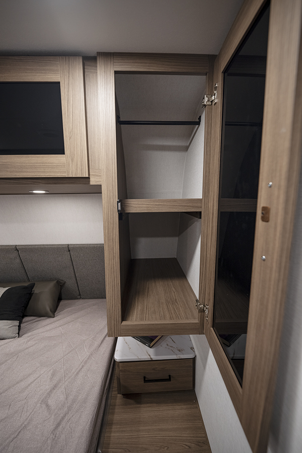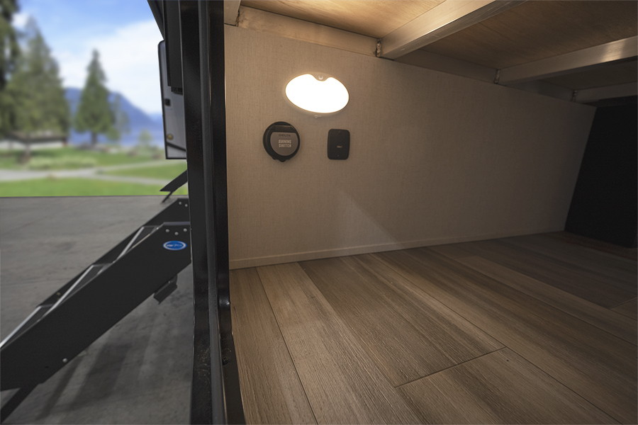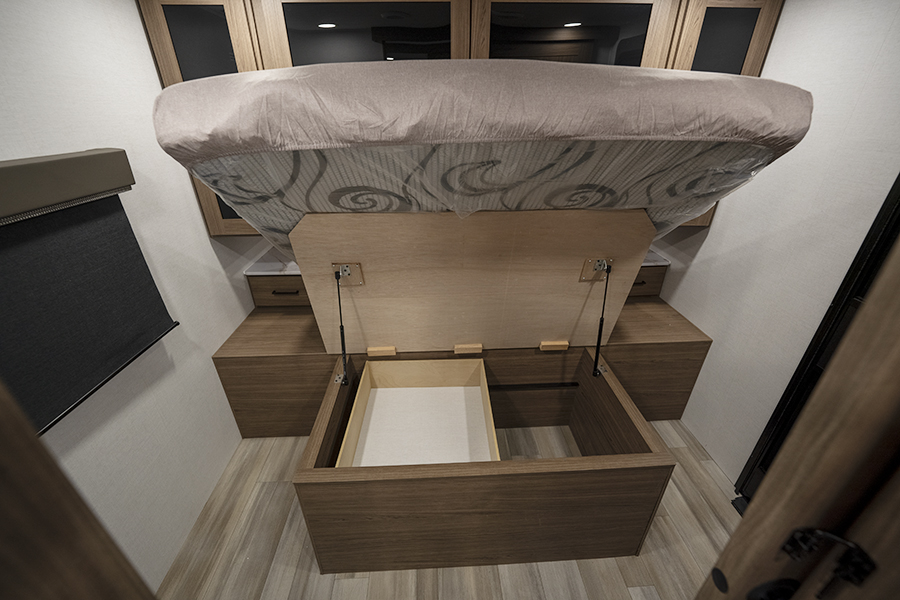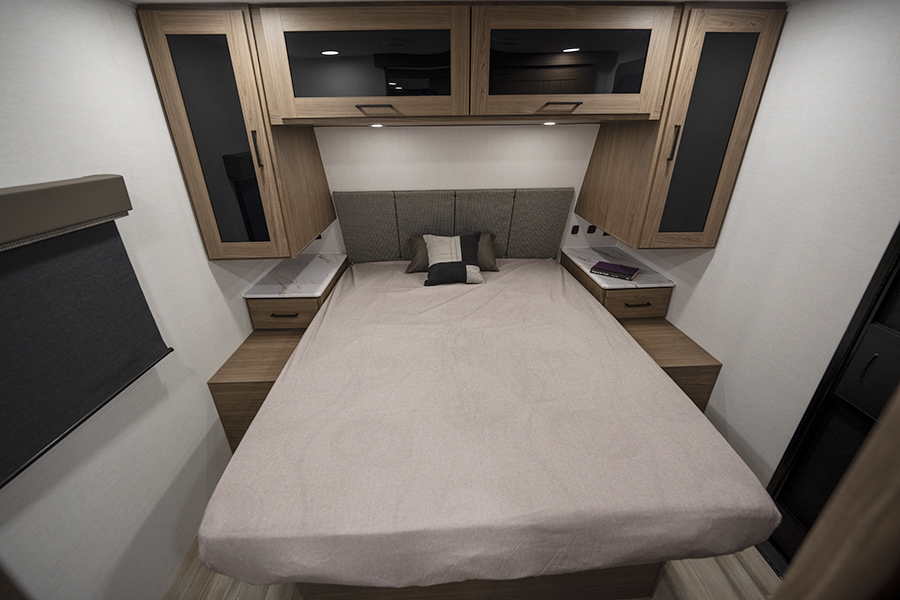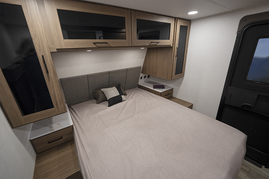 - Bedroom Retreat: At the front, you'll find a queen-size bed (60" x 80") with hidden storage underneath, perfect for blankets or extra gear. Nightstands on both sides and upper storage provide space for your clothing and personal items.